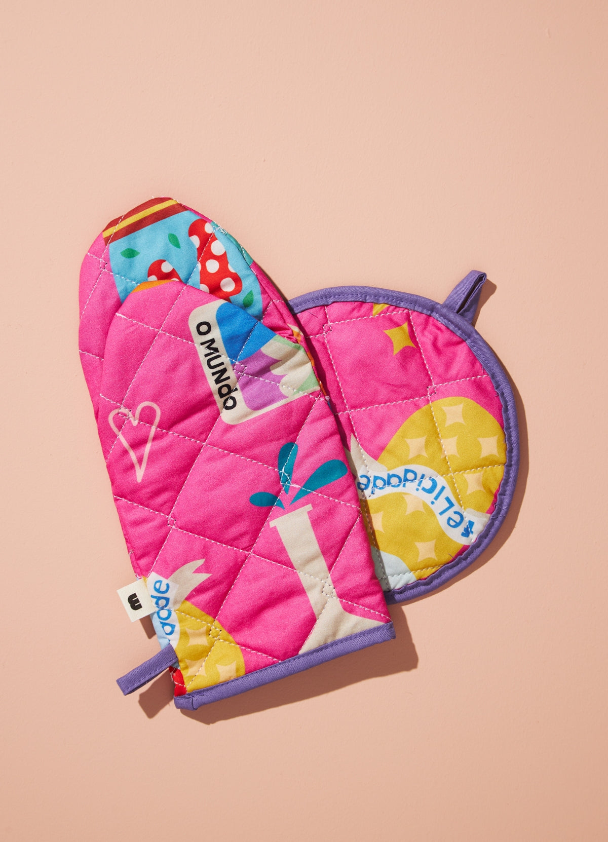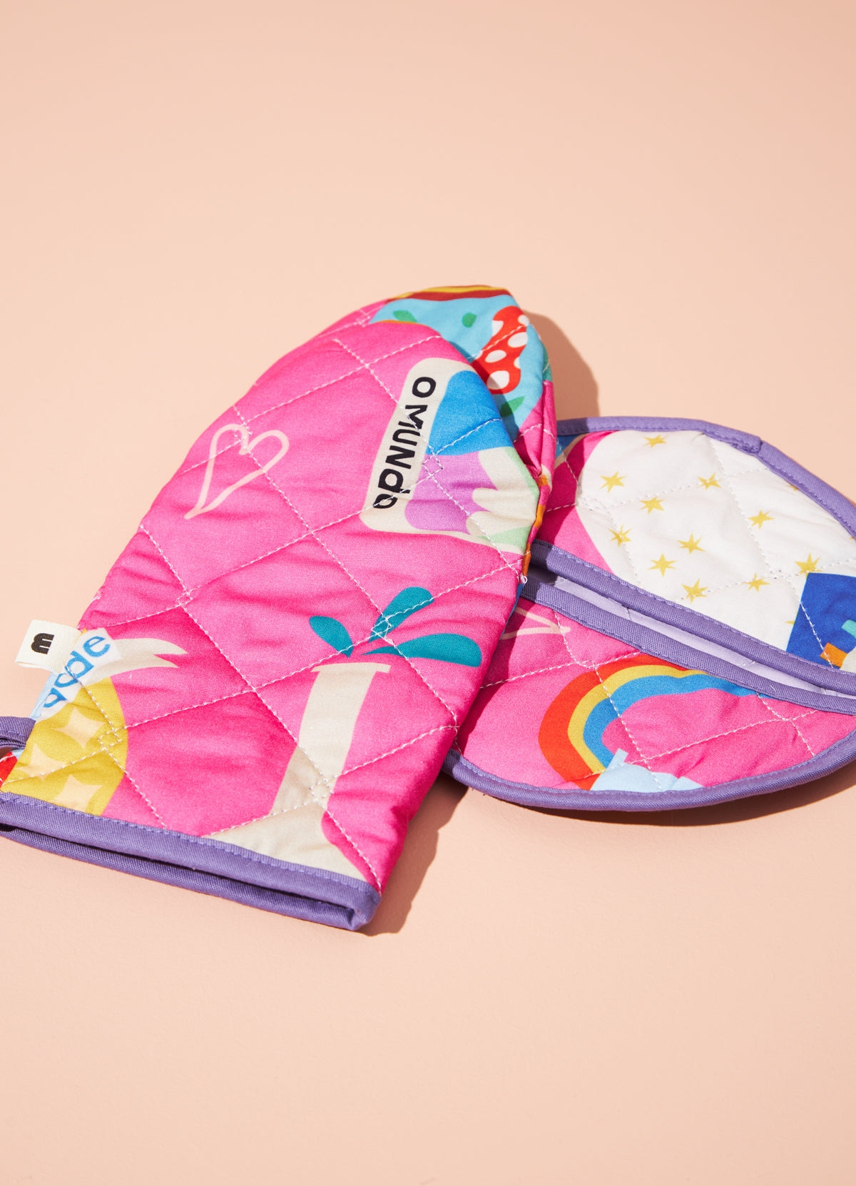 O kit Luva de Cozinha Magia é composto por uma luva de cozinha e um descanso/pegador de panela, com estampa exclusiva Mooui.