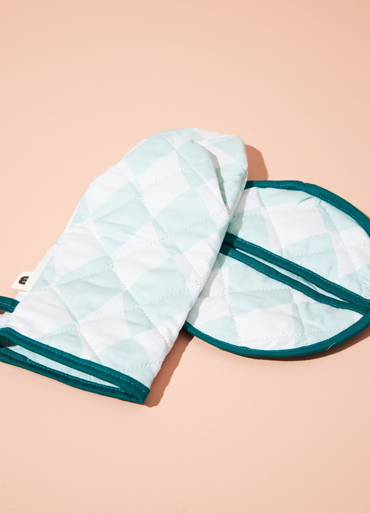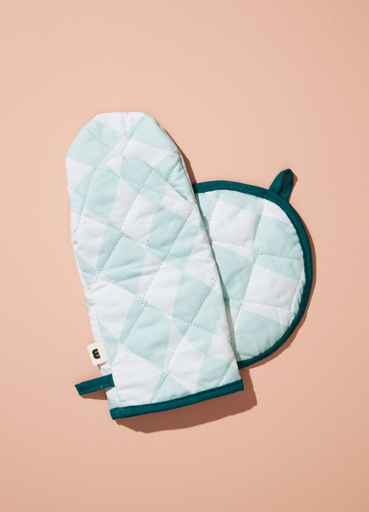 O kit Luva de Cozinha Pipa Menta é composto por uma luva de cozinha e um descanso/pegador de panela, com estampa exclusiva Mooui.