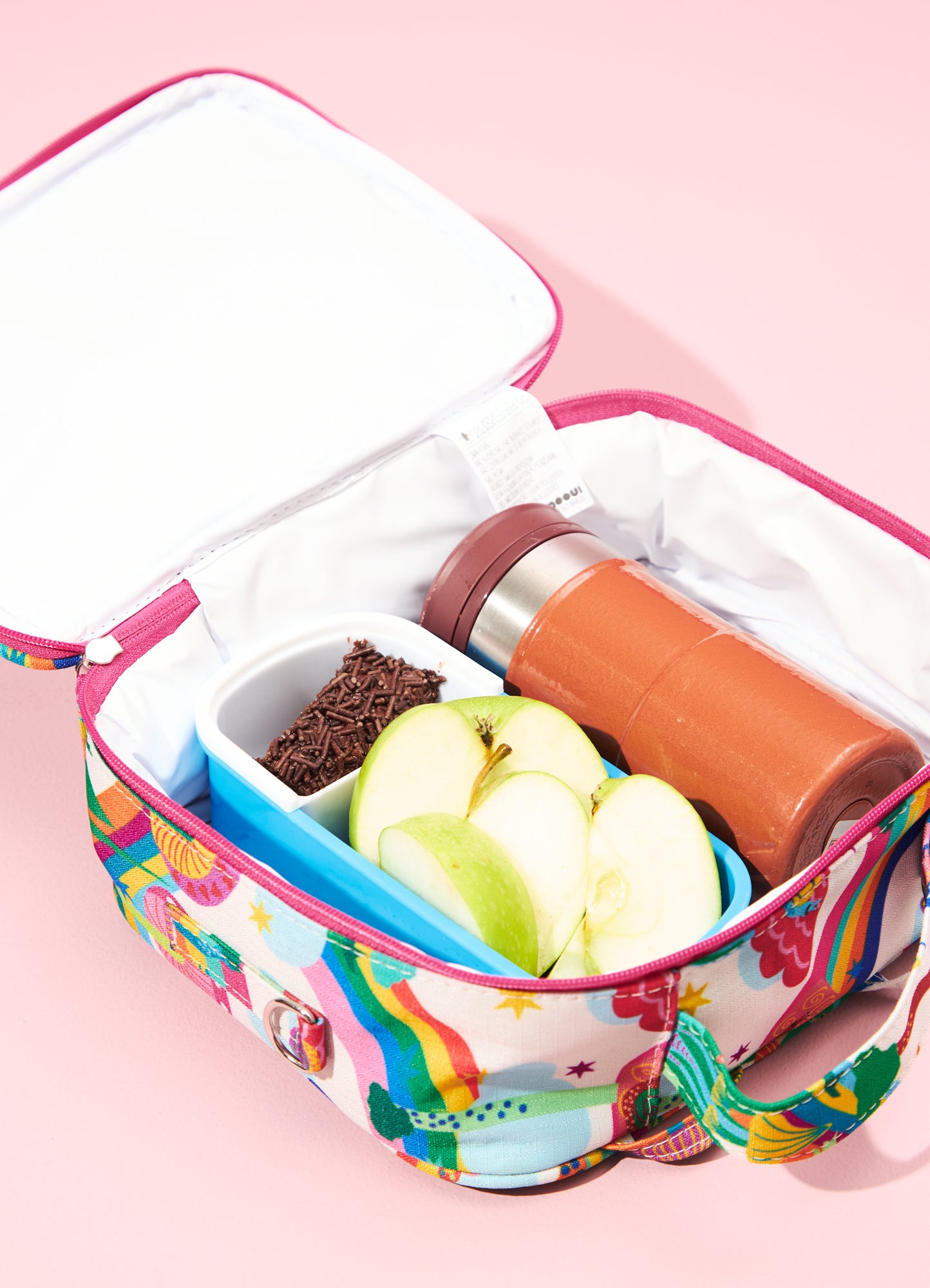 Com material interno térmico mantendo os alimentos e lanches frescos para a hora do lanche. Possui alça lateral, alça de mão e as aletas que permite carregar junto com a mochila trazem praticidade para os pequenos.
