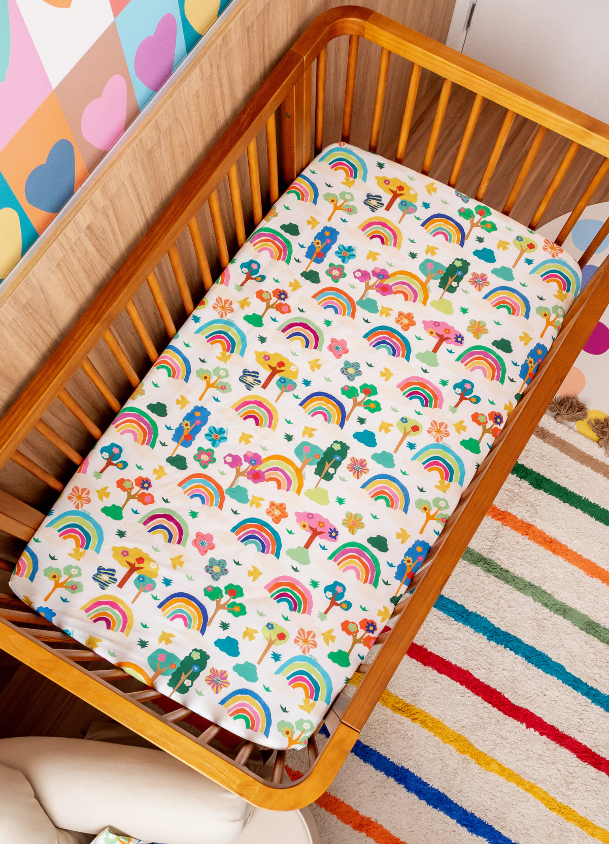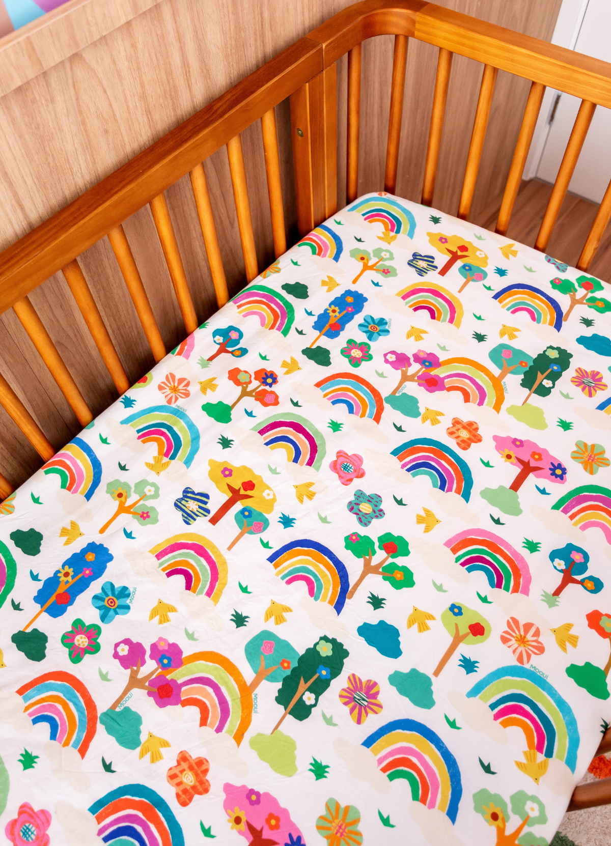 O Lençol de Elástico Infantil Arco-íris do Bem da MOOUI combina praticidade e conforto para o sono das crianças. Com elástico em toda a volta, permanece perfeitamente ajustado ao colchão mesmo durante o sono mais agitado dos pequenos.
