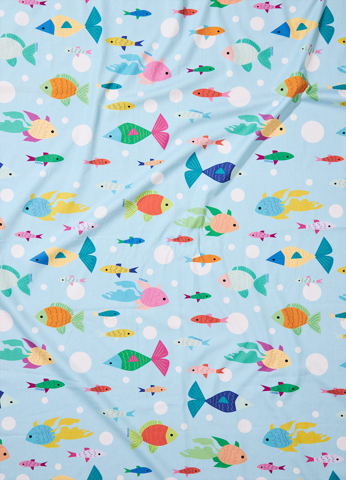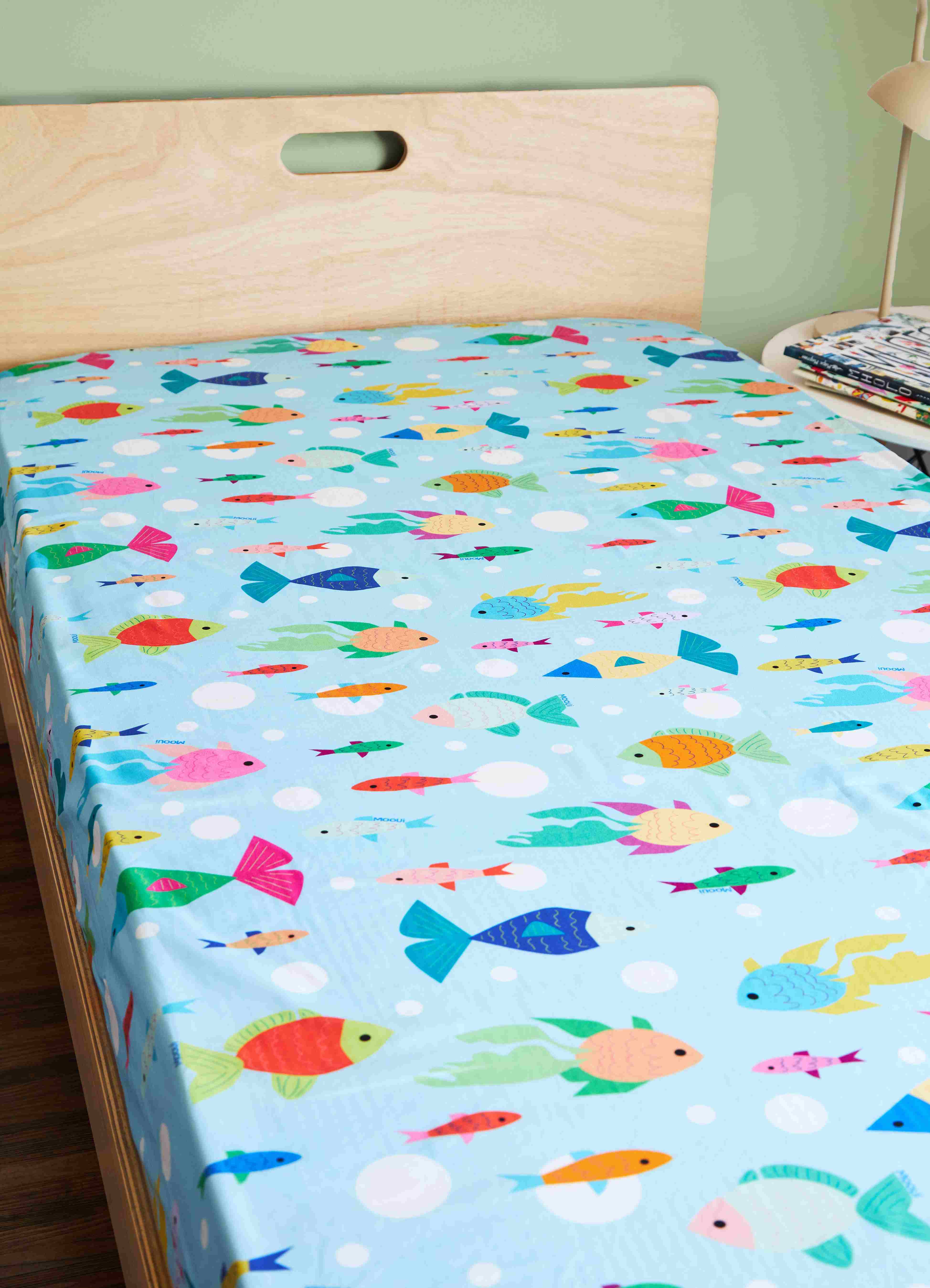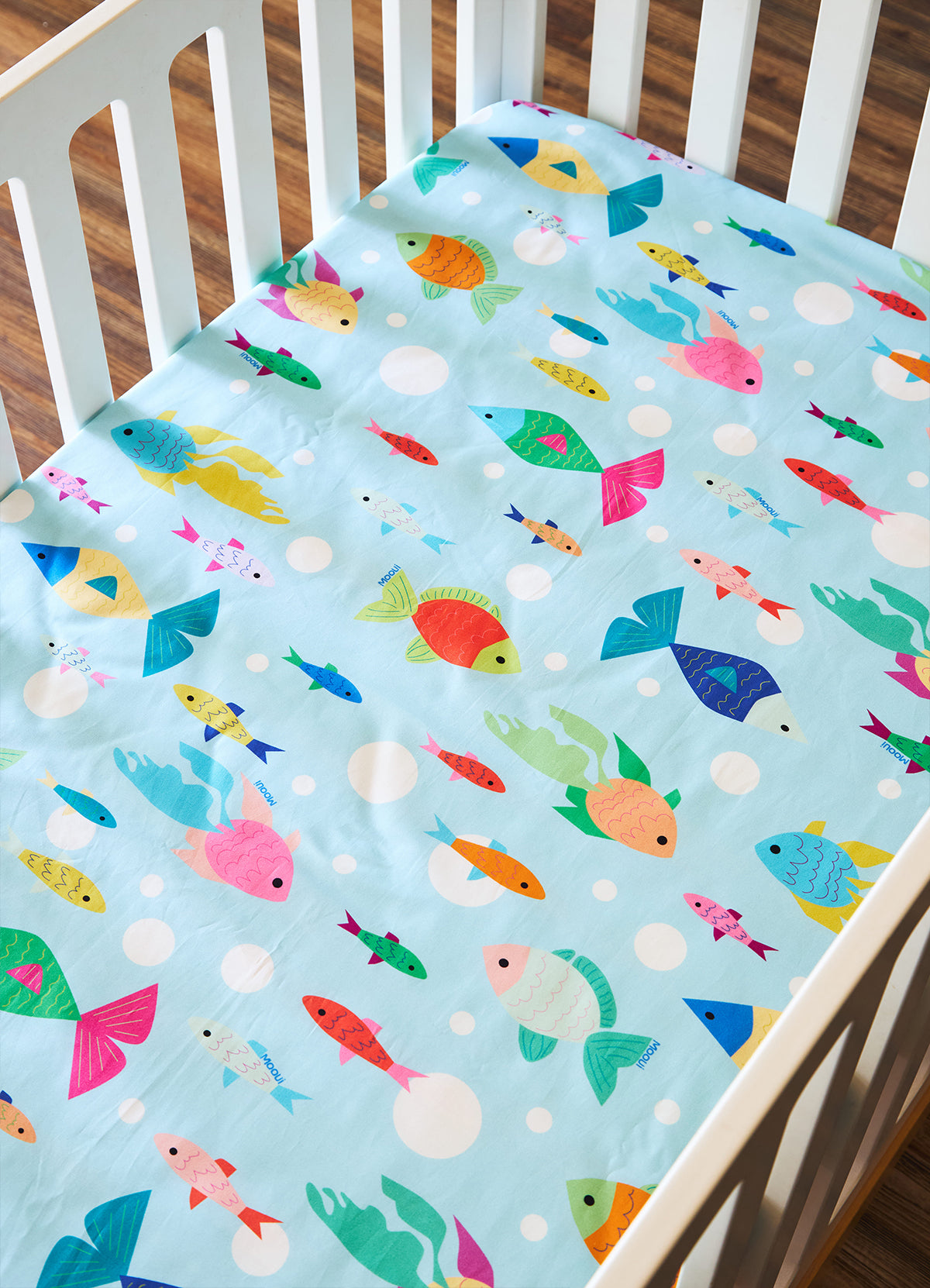 O Lençol de Elástico Infantil Peixinhos do Oceano da MOOUI combina praticidade e conforto para o sono das crianças. Com elástico em toda a volta, permanece perfeitamente ajustado ao colchão mesmo durante o sono mais agitado dos pequenos.