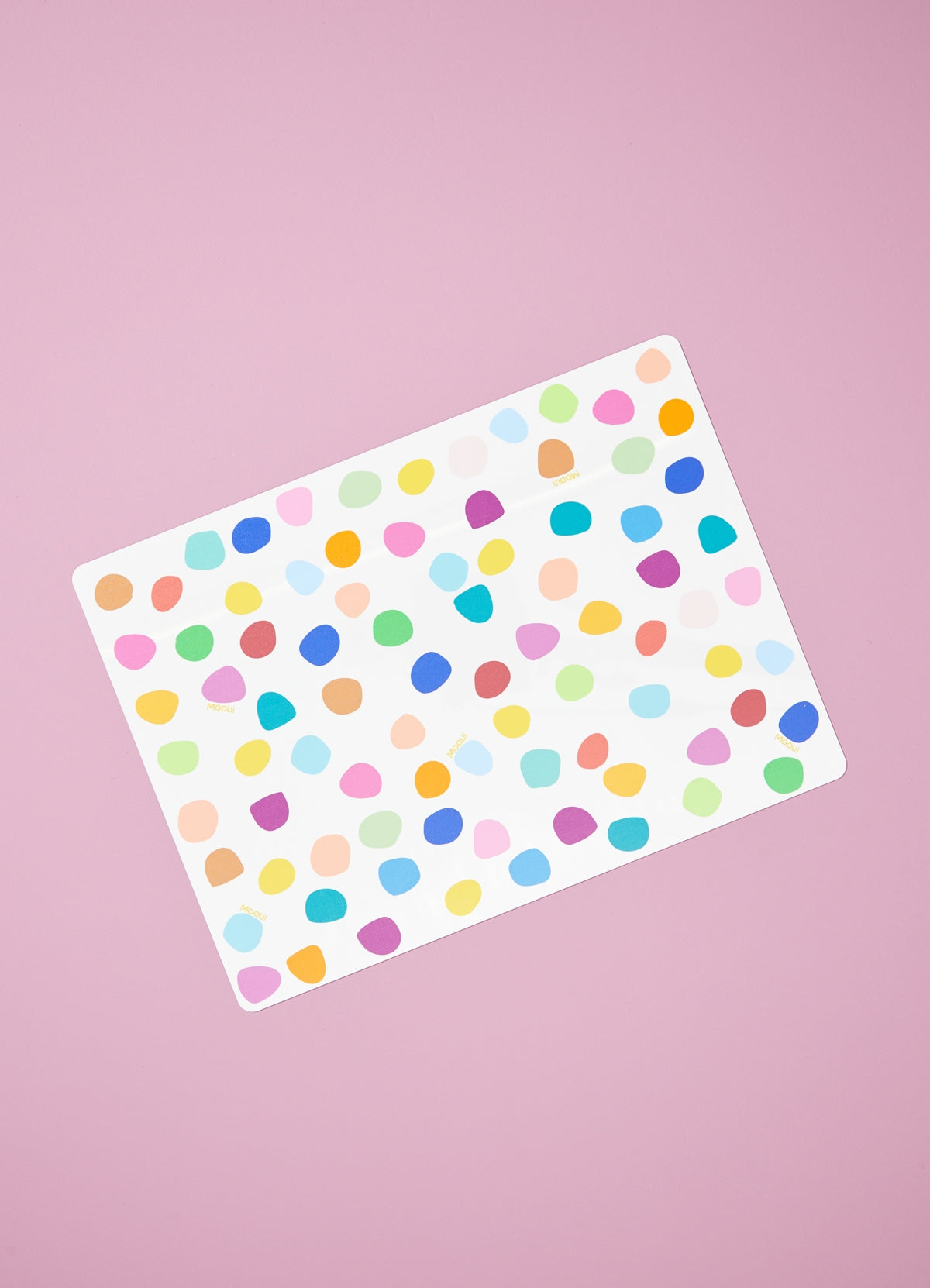 O lugar Americano Piscina de Bolinhas Mooui é uma peça que ajudará a criar novas memórias e fazer desses momentos de refeição algo ainda mais mágico e único. Saia do básico das mesas e estampe sua rotina com os lugares americanos Mooui. Você pode usar todos iguais ou misturar estampas, deixando a sua decoração ainda mais atual e extrovertida.