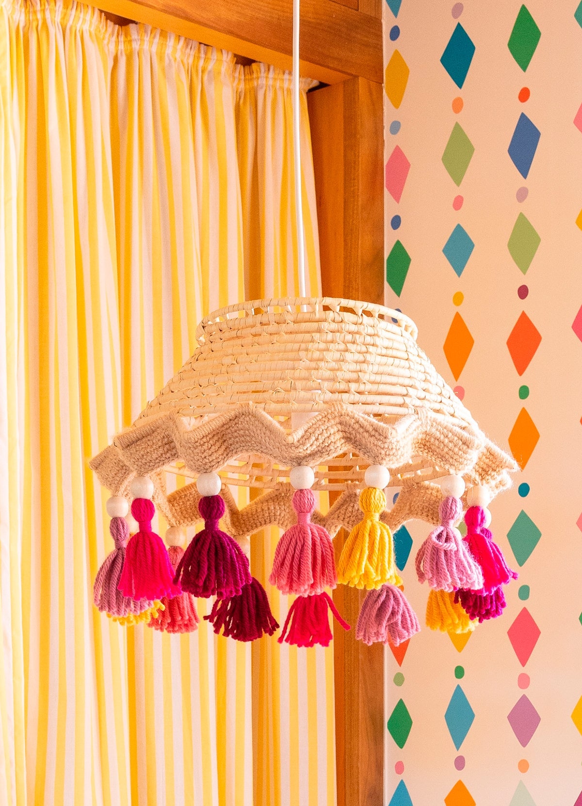 Com design moderno essa Luminária Pendente Rosa vai tranformar a decoração do quarto infantil. Feita em palha e com detalhes de bolinhas em lã com tons de rosa, essa luminária é charmosa e cheia de estilo! Outro benefício dessa luminária é sua funcionalidade, que proporciona uma iluminação bem distribuída por todo o espaço, garantindo comodidade e praticidade.