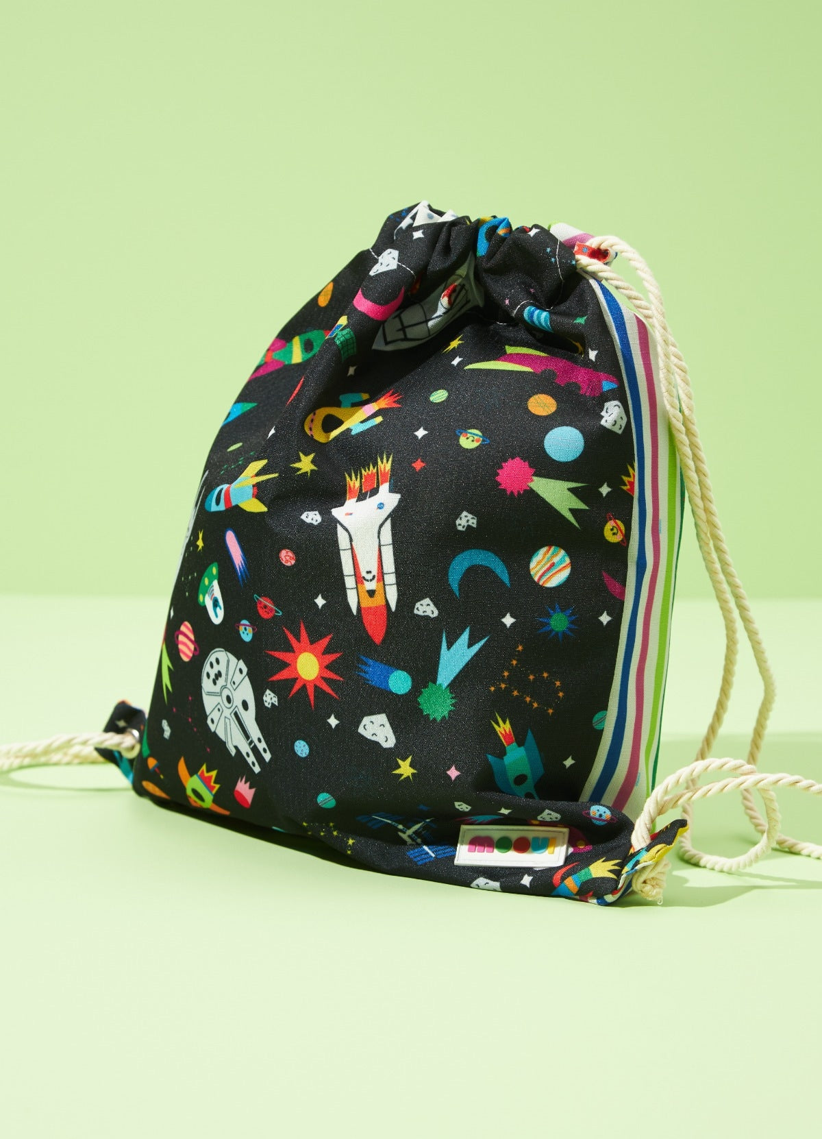 A Mochila Saco Corrida Espacial tem estampa exclusiva Mooui e é daquelas peças essenciais para quem gosta de atividades ao ar livre. Feita em tecido impermeável, ela é leve, espaçosa e prática, é ideal para ir à praia, à piscina, à academia, fazer uma caminhada etc. A combinação de estampas deixa a mochila saco moderna, estilosa e atual.
