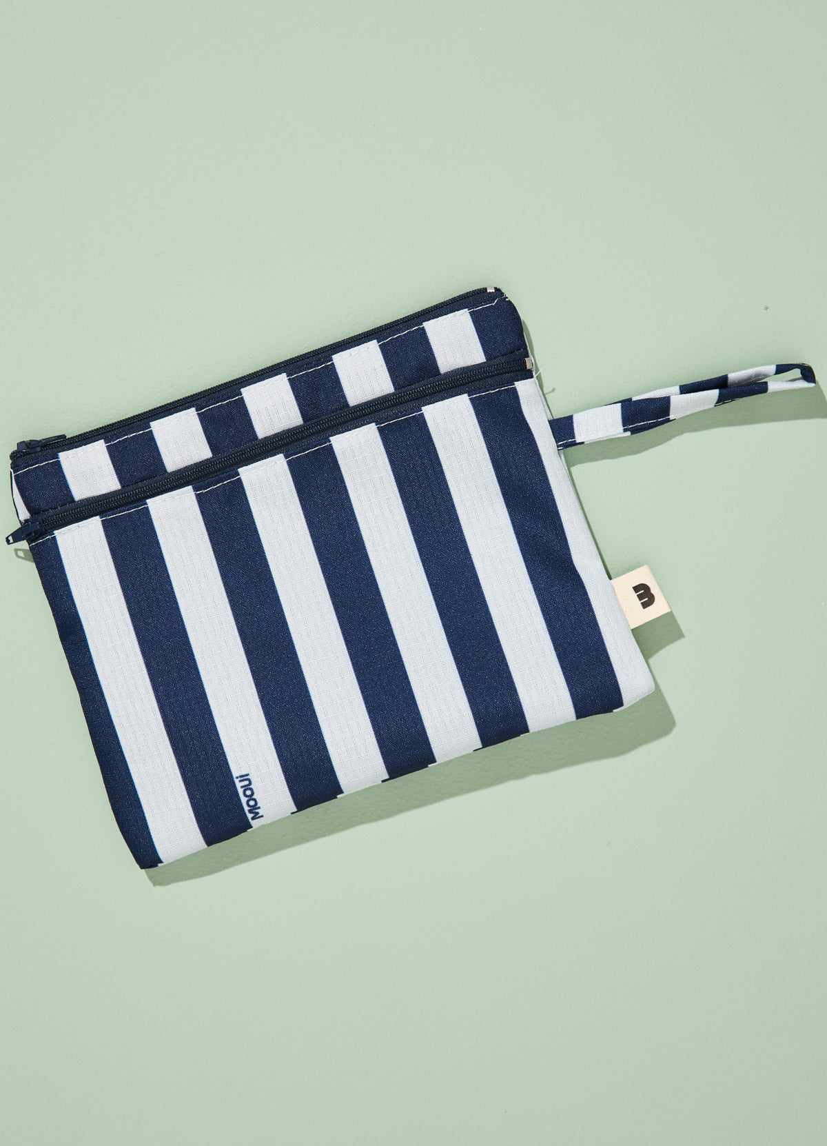 A Necessaire 2 Bolsos Listrado Azul é ideal para organizar itens pessoais com praticidade no dia a dia ou em viagens. Confeccionada em material têxtil impermeável, protege os pertences contra respingos e umidade. Possui dois bolsos independentes, perfeitos para separar e guardar produtos de higiene. Apresenta a exclusiva estampa Mooui, que adiciona charme e delicadeza à rotina.