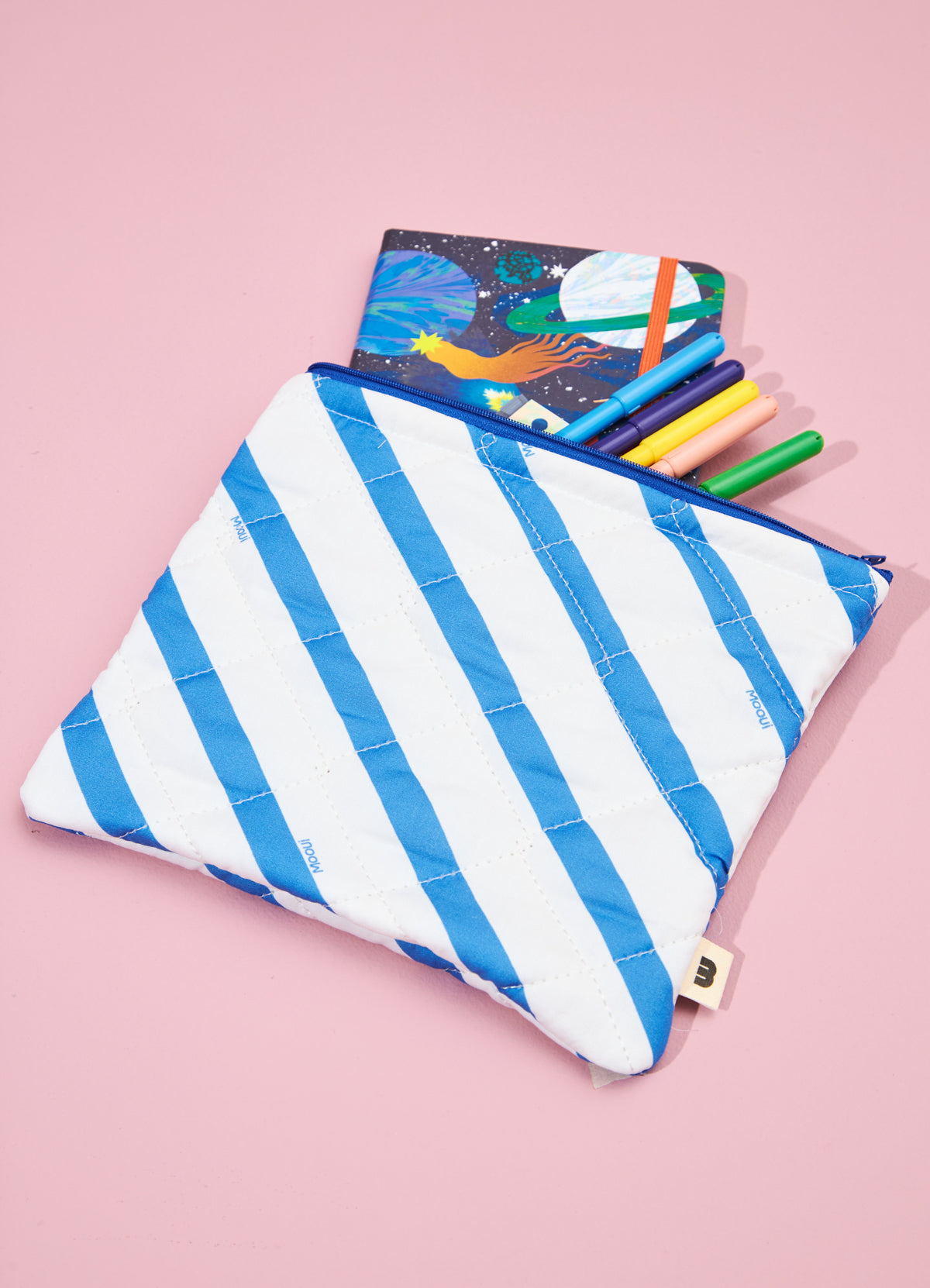 A Necessaire Matelassada Listrado Anil da MOOUI é essencial para a organização de pequenos itens das crianças. Com acabamento matelassado que proporciona proteção extra, é perfeita para guardar trocas de roupa, brinquedos pequenos ou materiais escolares.