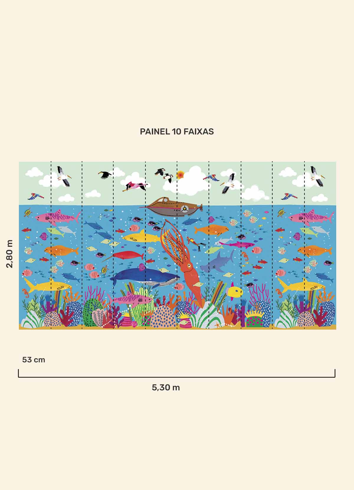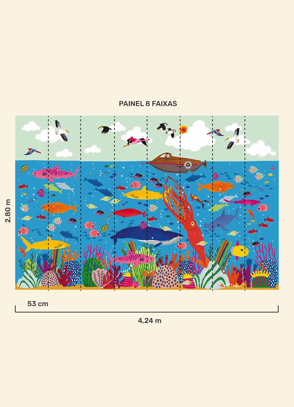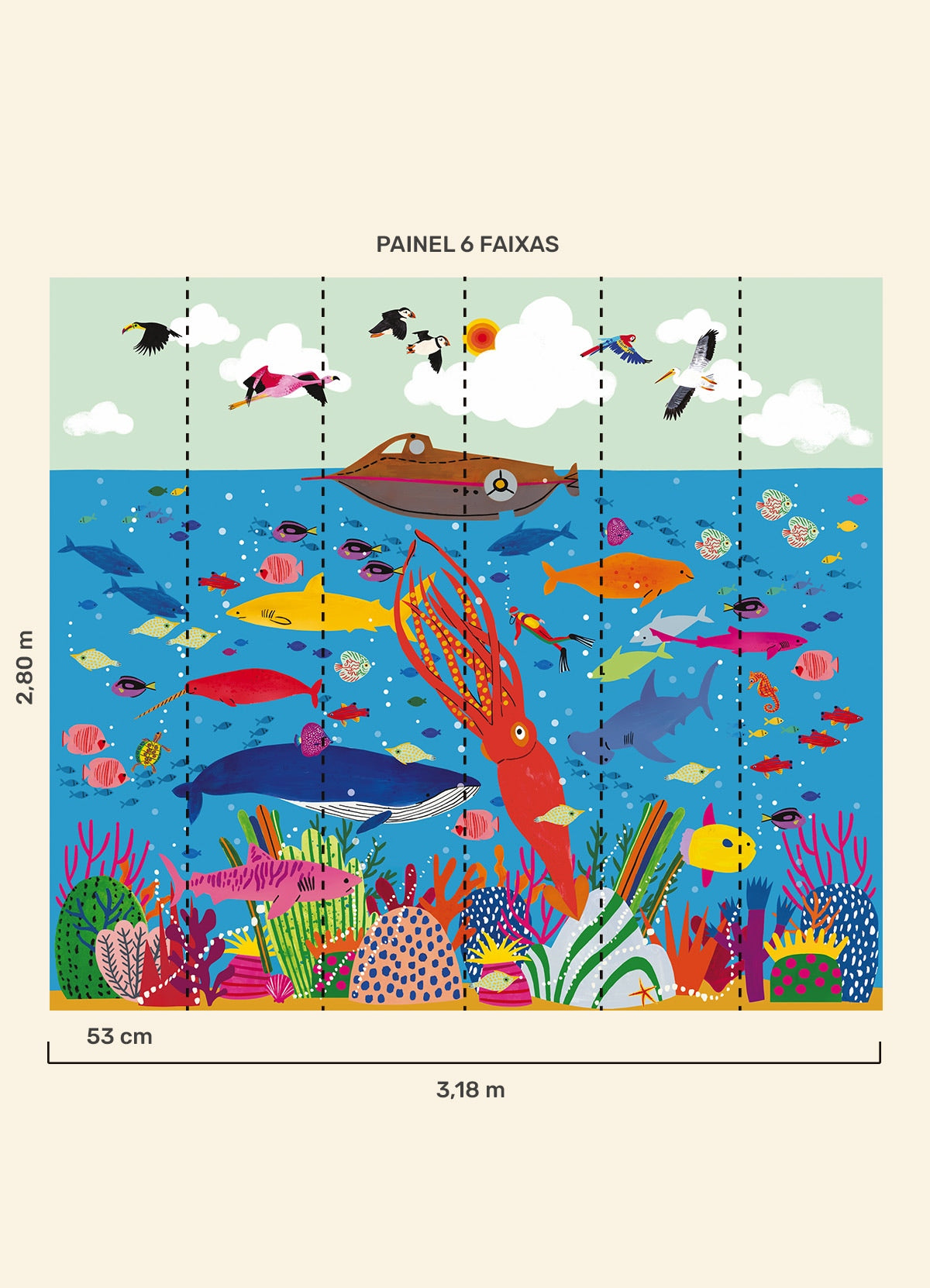 O Papel de Parede 20 Mil Léguas Submarinas é como um portal da magia: permite que as cores, aventuras e o carinho invadam o quartinho infantil com alegria e encanto. Além de ser um item que transforma a decoração, nosso papel de parede infantil é de base vinílica e impressão de alta definição, para que você tenha um item de muita qualidade para decorar o quarto infantil. O acabamento é fosco e a textura suave, substituindo pinturas com tinta de forma mais prática e durável. E a junção das faixas não é sobreposta, mas alinhada lado a lado. Consulte a disponibilidade de estoque a pronta entrega.