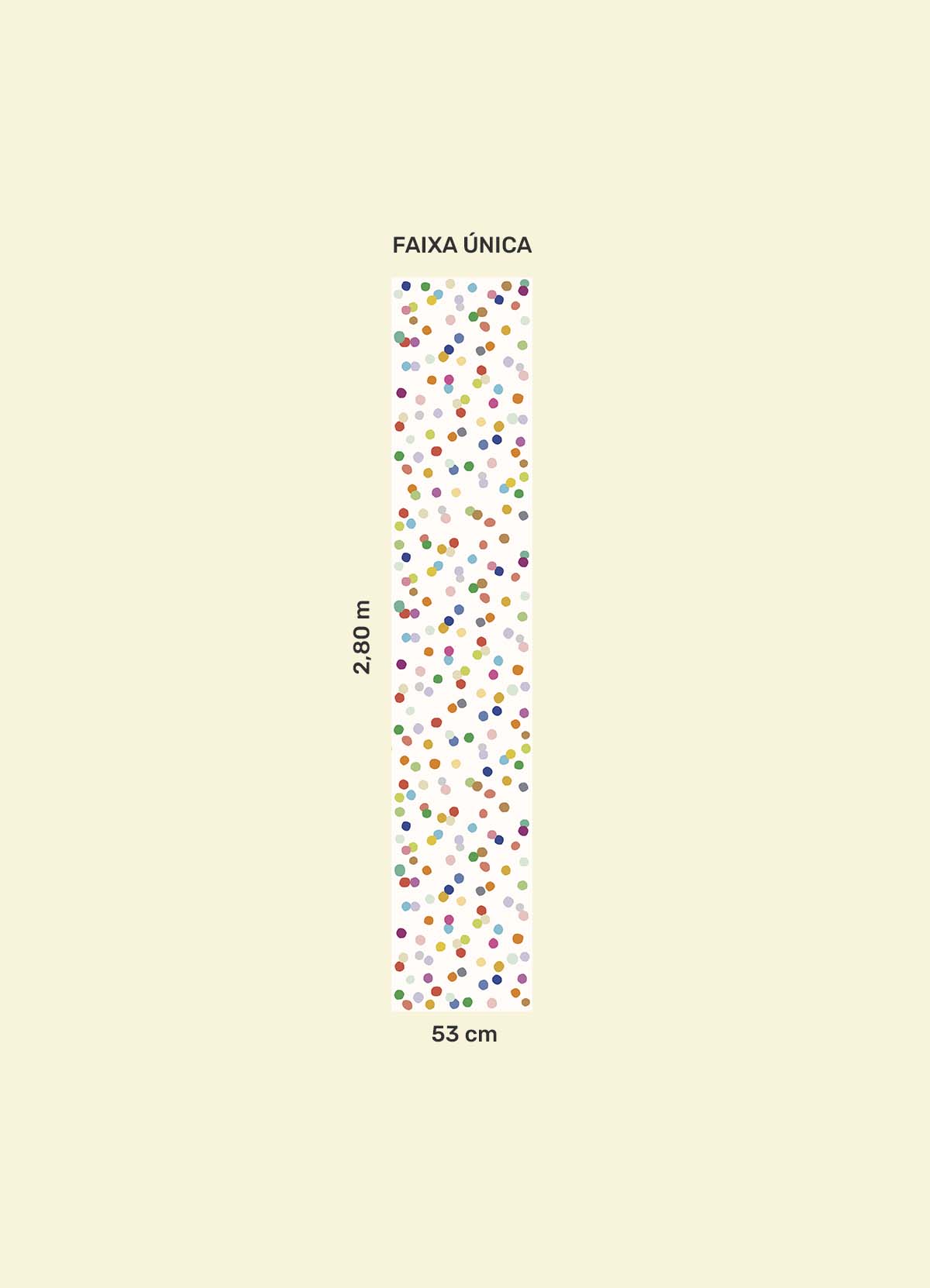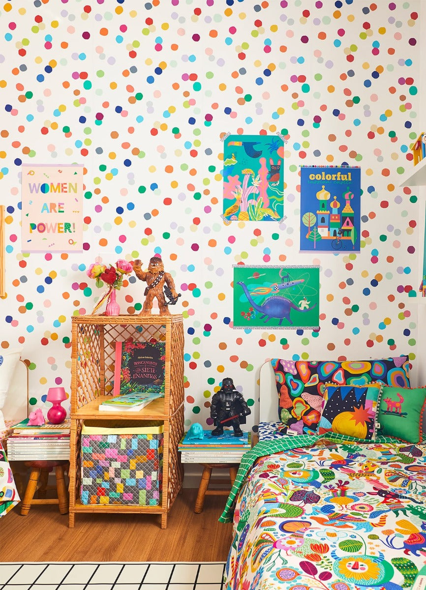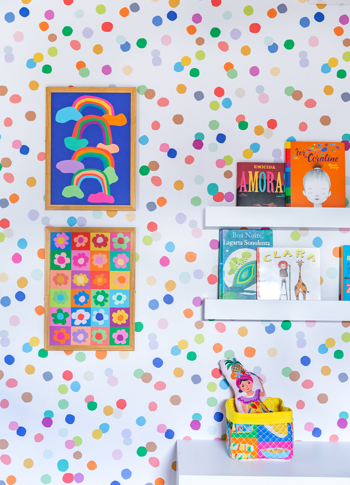 O Papel de Parede Confetti é como um portal da magia: permite que as cores, aventuras e o carinho invadam o quartinho infantil com alegria e encanto. Além de ser um item que transforma a decoração, nosso papel de parede infantil é de base vinílica e impressão de alta definição, para que você tenha um item de muita qualidade para decorar o quarto infantil. O acabamento é fosco e a textura suave, substituindo pinturas com tinta de forma mais prática e durável. E a junção das faixas não é sobreposta, mas alinhada lado a lado. Consulte a disponibilidade de estoque a pronta entrega.