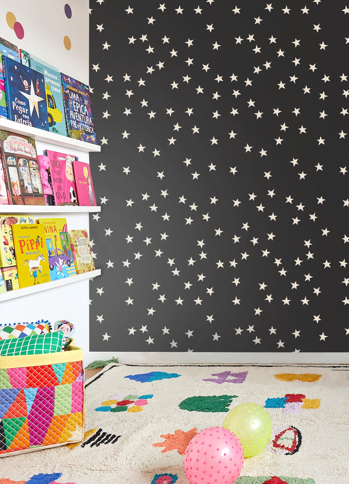O Papel de Parede Estrelas Pretas é como um portal da magia: permite que as cores, aventuras e o carinho invadam o quartinho infantil com alegria e encanto. Além de ser um item que transforma a decoração, nosso Papel de Parede infantil é de base vinílica e impressão de alta definição, para que você tenha um item de muita qualidade para decorar o quarto infantil. O acabamento é fosco e a textura suave, substituindo pinturas com tinta de forma mais prática e durável. E a junção das faixas não é sobreposta, mas alinhada lado a lado. Consulte a disponibilidade de estoque a pronta entrega.