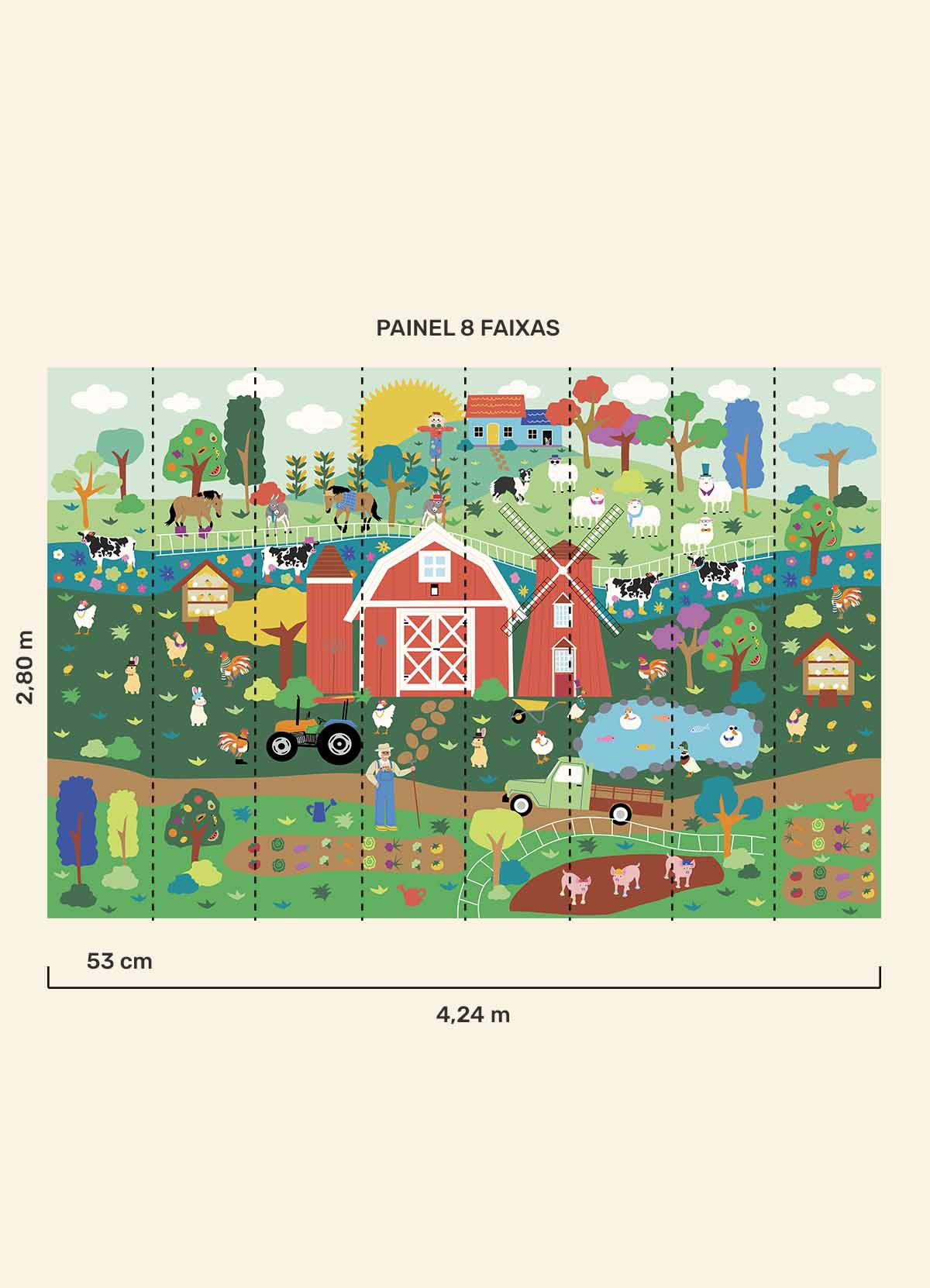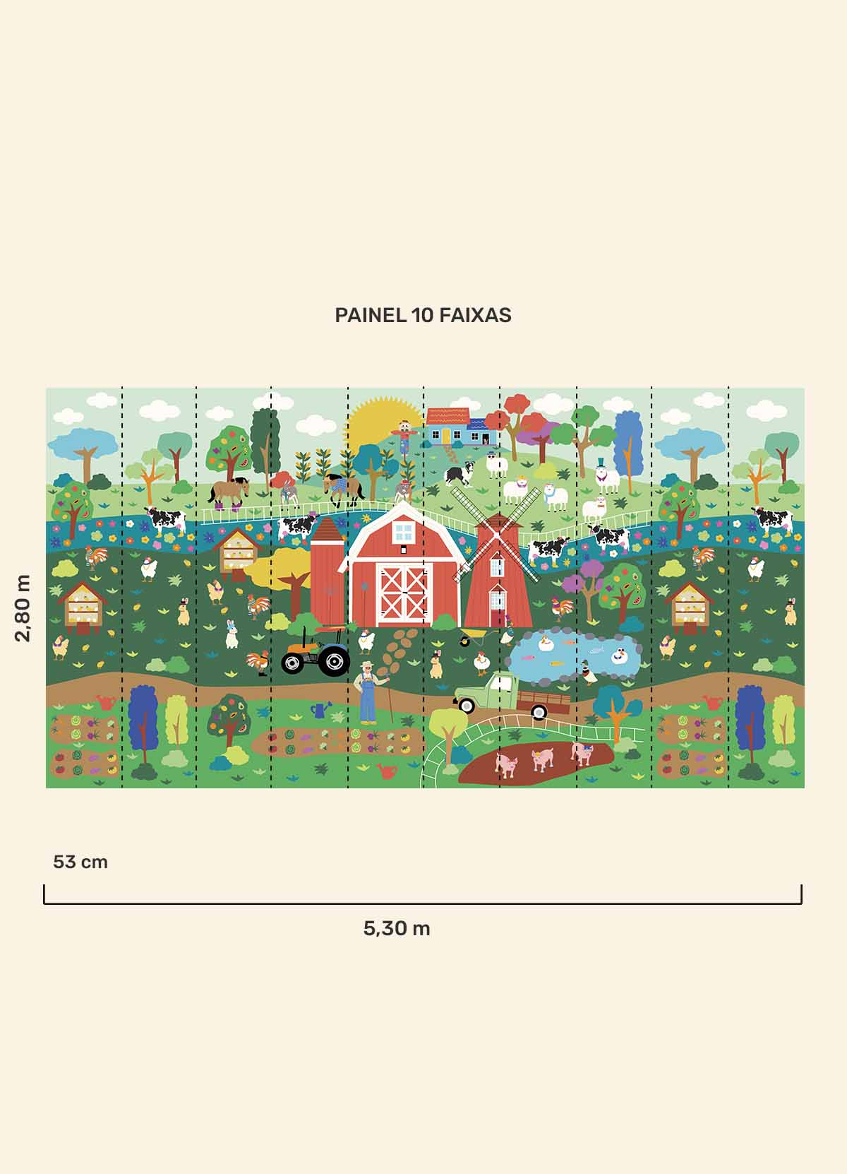 O Papel de Parede Fazendinha é como um portal da magia: permite que as cores, aventuras e o carinho invadam o quartinho infantil com alegria e encanto. Além de ser um item que transforma a decoração, nosso papel de parede infantil é de base vinílica e impressão de alta definição, para que você tenha um item de muita qualidade para decorar o quarto infantil. O acabamento é fosco e a textura suave, substituindo pinturas com tinta de forma mais prática e durável. E a junção das faixas não é sobreposta, mas alinhada lado a lado. Consulte a disponibilidade de estoque a pronta entrega.