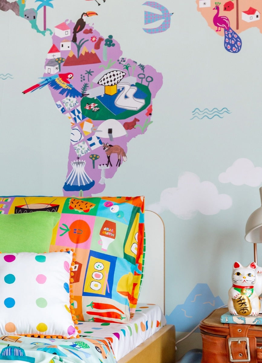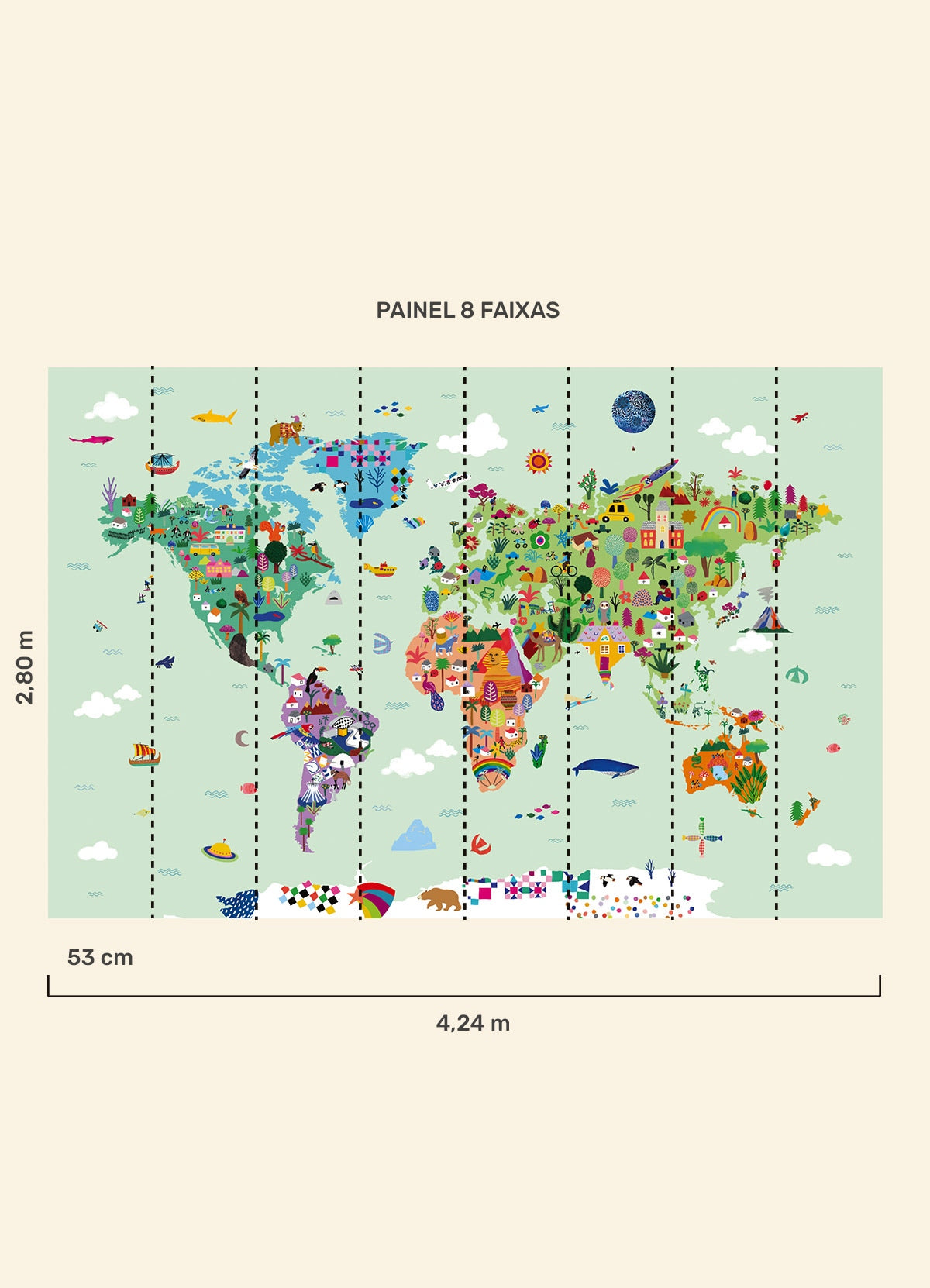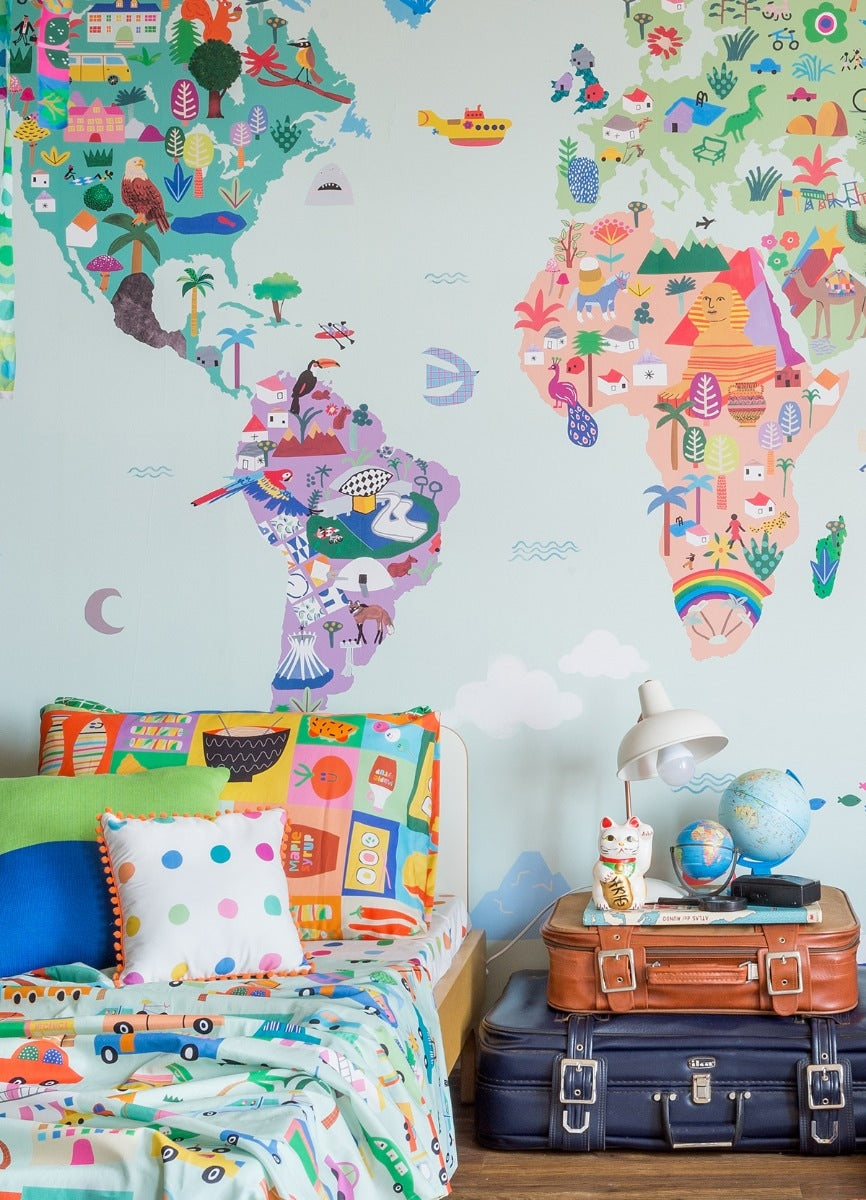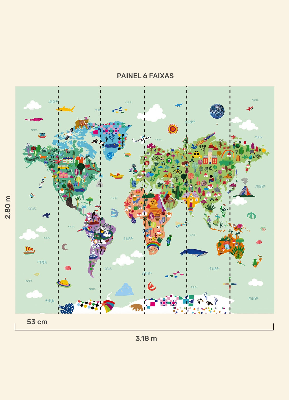 O Papel de Parede Mapa-Múndi é como um portal da magia: permite que as cores, aventuras e o carinho invadam o quartinho infantil com alegria e encanto. Além de ser um item que transforma a decoração, nosso papel de parede infantil é de base vinílica e impressão de alta definição, para que você tenha um item de muita qualidade para decorar o quarto infantil. O acabamento é fosco e a textura suave, substituindo pinturas com tinta de forma mais prática e durável. E a junção das faixas não é sobreposta, mas alinhada lado a lado. Consulte a disponibilidade de estoque a pronta entrega.