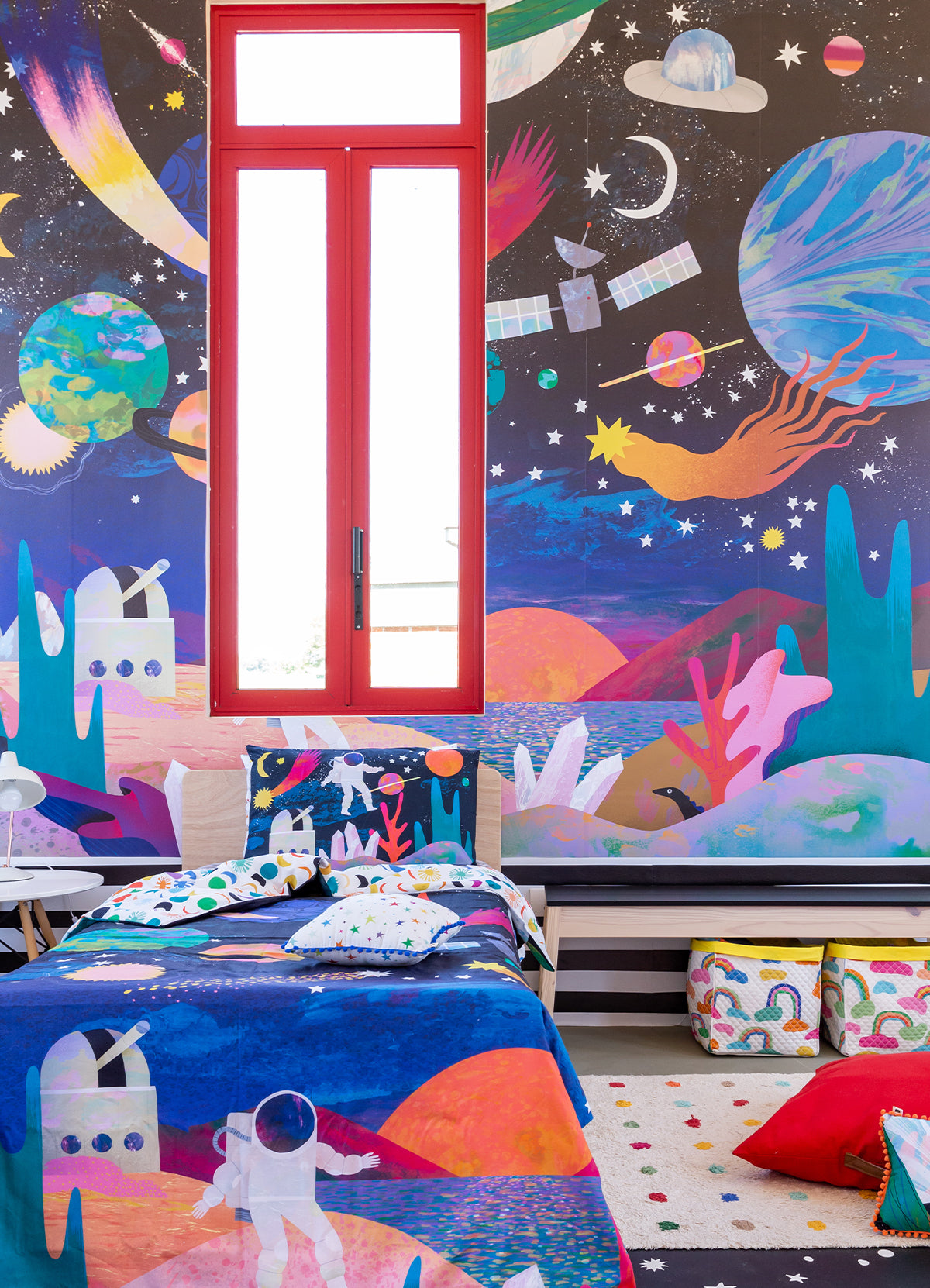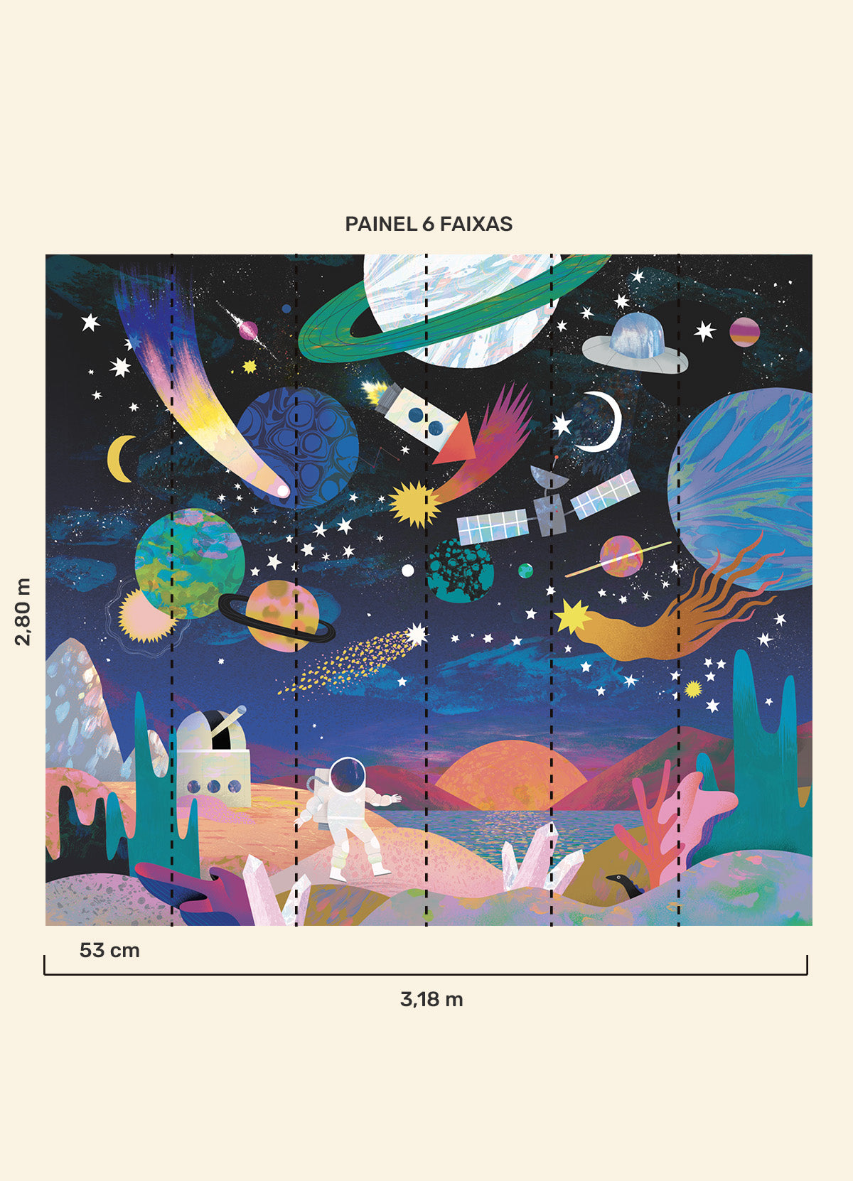 O Papel de Parede Viagem ao Espaço é como um portal da magia: permite que as cores, aventuras e o carinho invadam o quartinho infantil com alegria e encanto. Além de ser um item que transforma a decoração, nosso papel de parede infantil é de base vinílica e impressão de alta definição, para que você tenha um item de muita qualidade para decorar o quarto infantil. O acabamento é fosco e a textura suave, substituindo pinturas com tinta de forma mais prática e durável. E a junção das faixas não é sobreposta, mas alinhada lado a lado. Consulte a disponibilidade de estoque a pronta entrega.