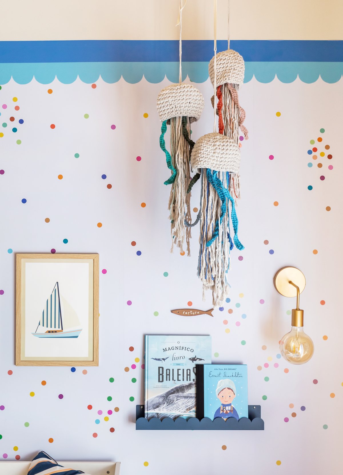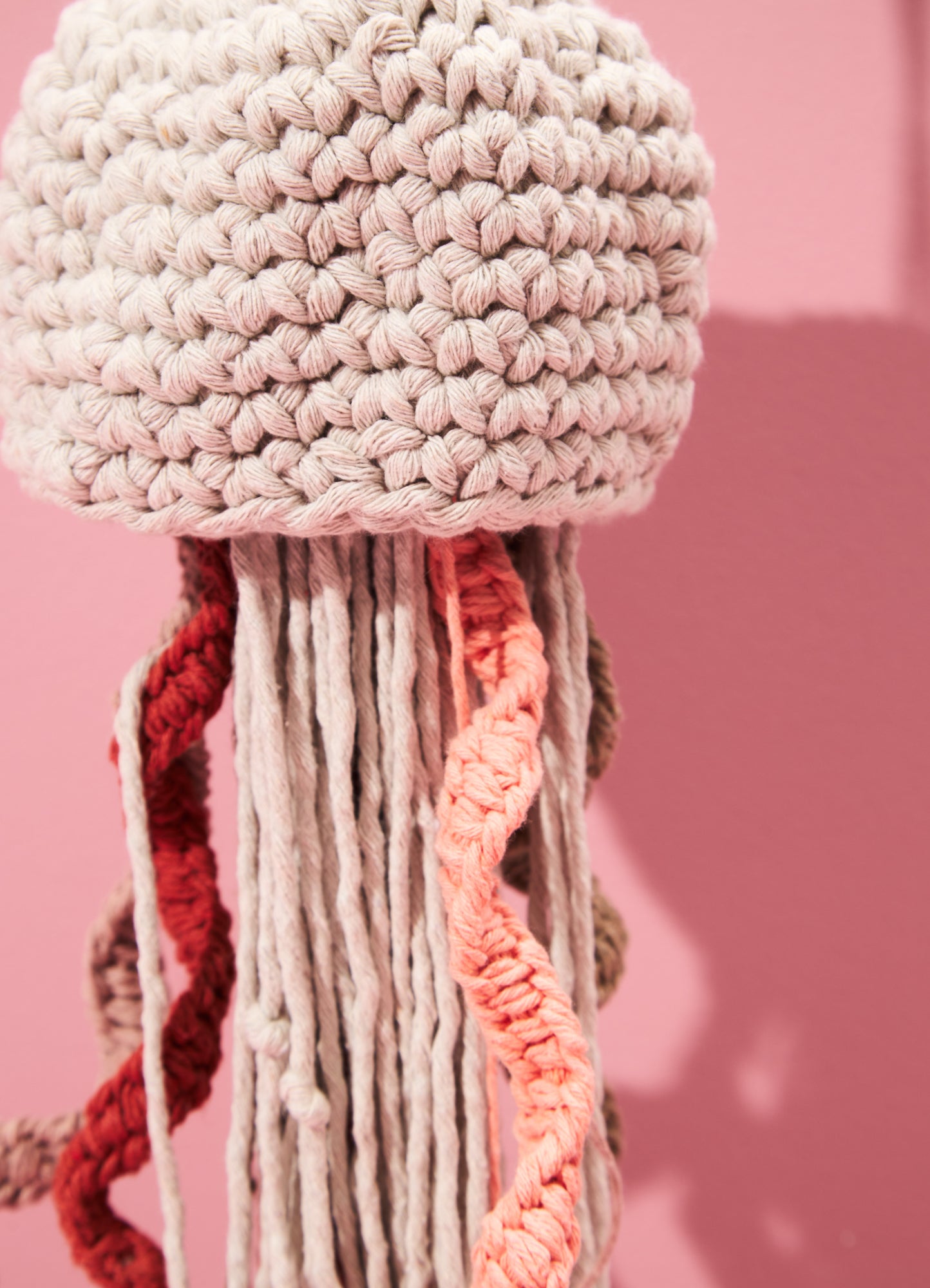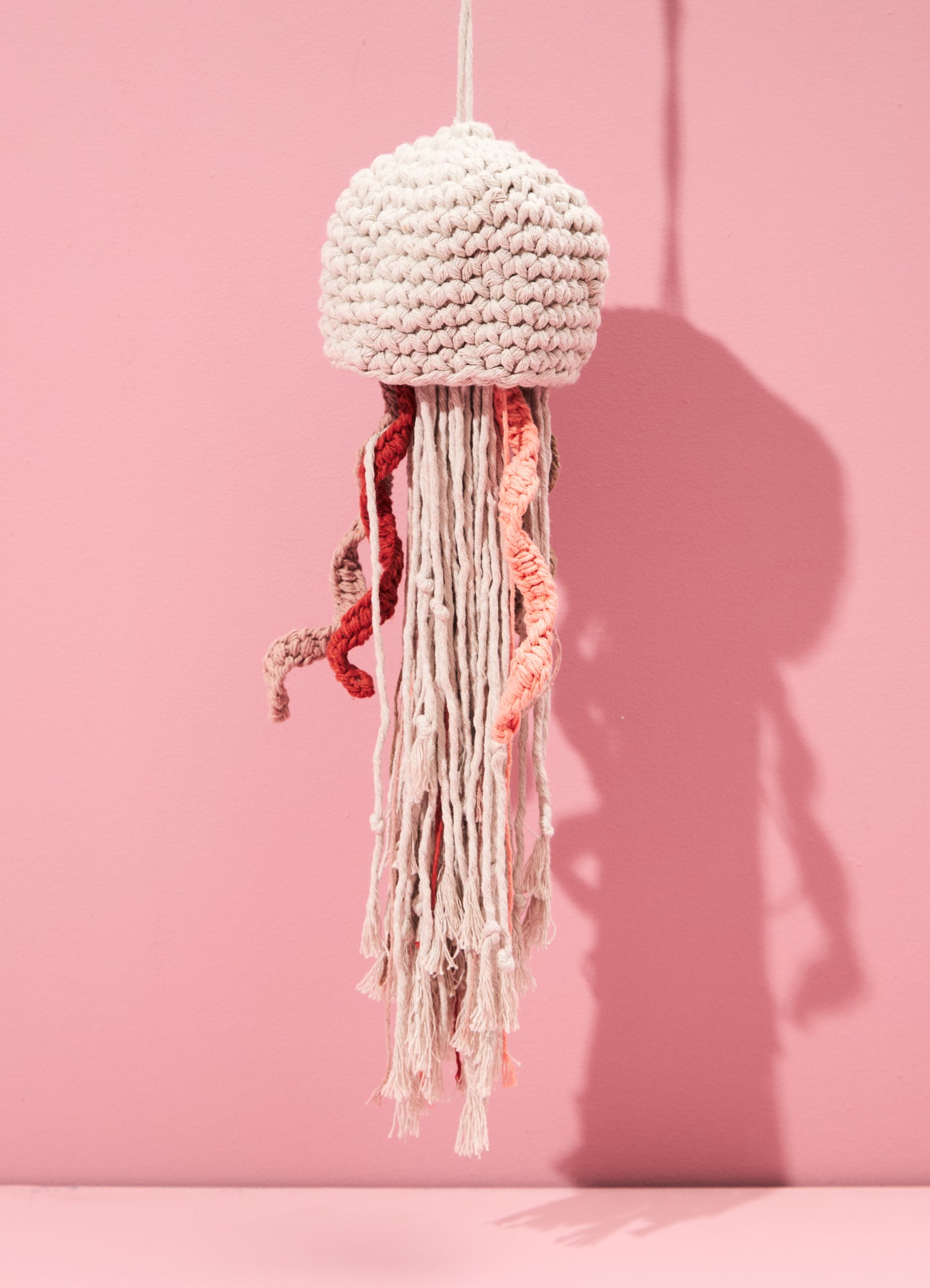 Inspirado nas formas graciosas das águas-vivas, o pendente pode ser usado no teto, em móbiles ou como detalhe especial acima do berço ou cantinho de leitura. É uma excelente escolha para quem busca decoração infantil com tema oceano, ou para quem ama criar espaços afetivos, lúdicos e cheios de personalidade. Um toque criativo que combina com quartos montessorianos, projetos sensoriais e ambientes que valorizam o feito à mão.