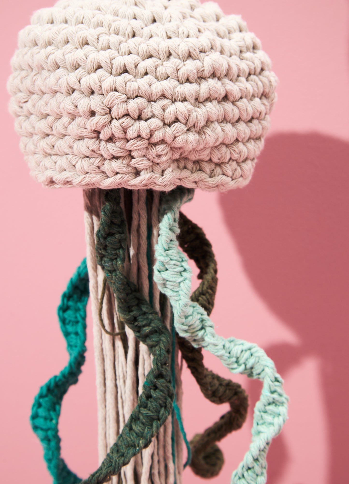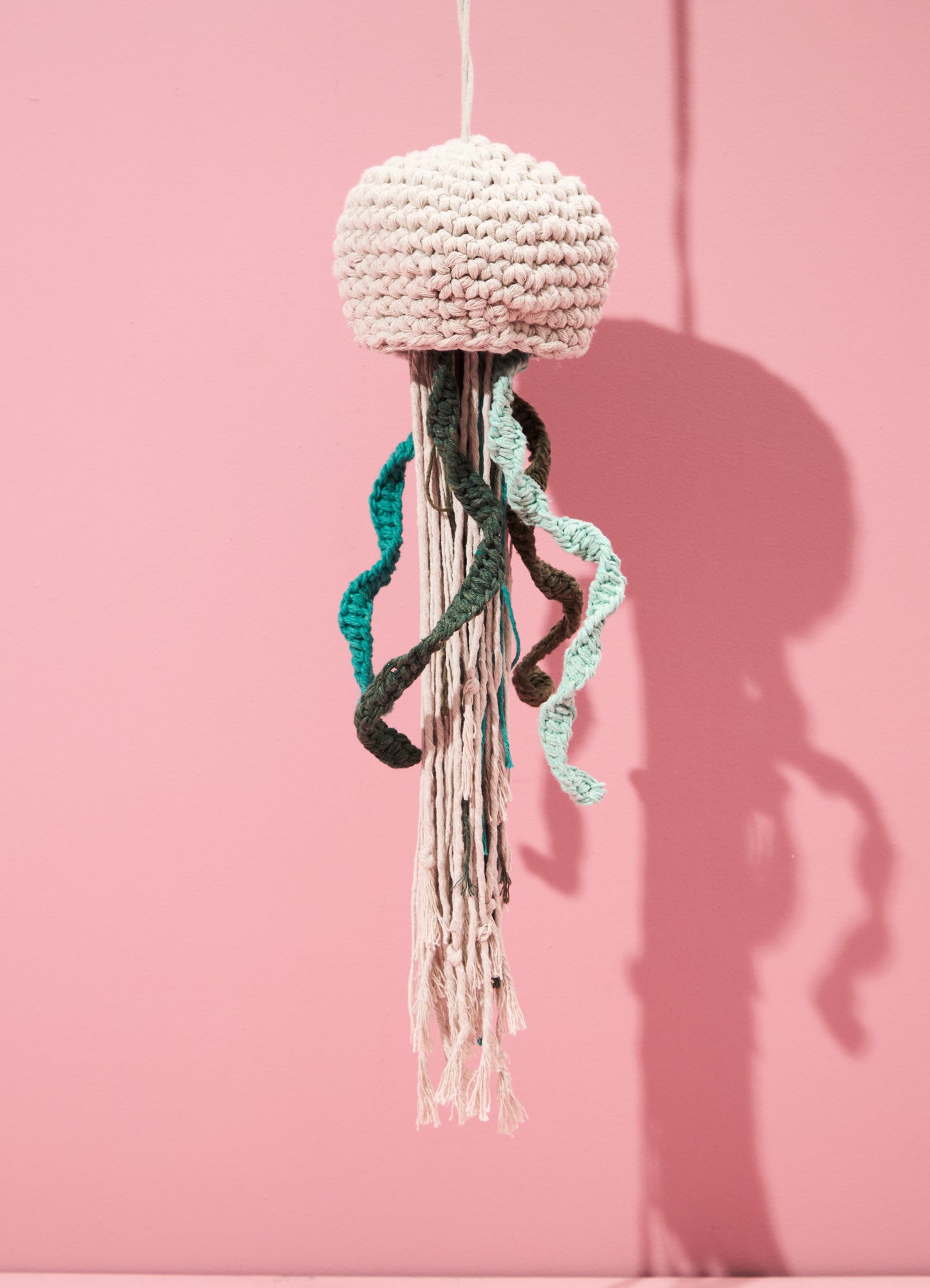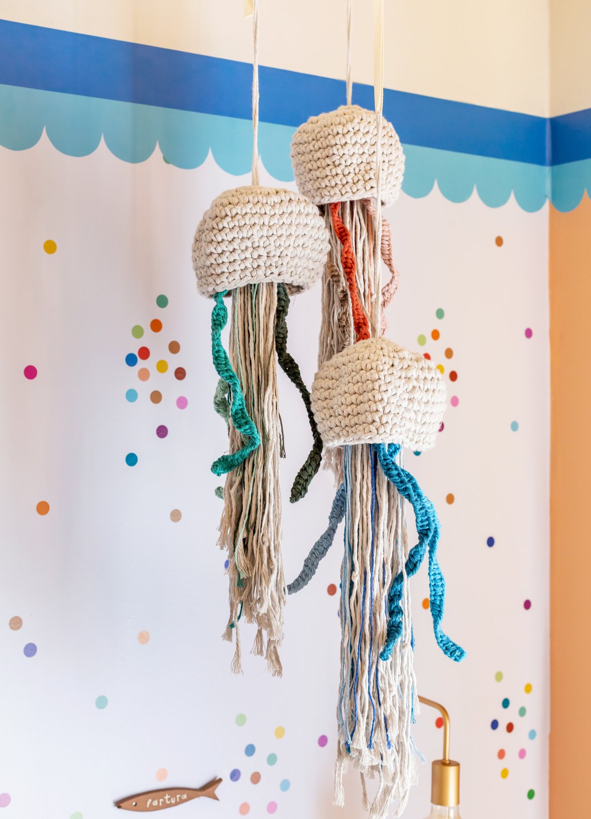 Inspirado nas formas graciosas das águas-vivas, o pendente pode ser usado no teto, em móbiles ou como detalhe especial acima do berço ou cantinho de leitura. É uma excelente escolha para quem busca decoração infantil com tema oceano, ou para quem ama criar espaços afetivos, lúdicos e cheios de personalidade. Um toque criativo que combina com quartos montessorianos, projetos sensoriais e ambientes que valorizam o feito à mão.