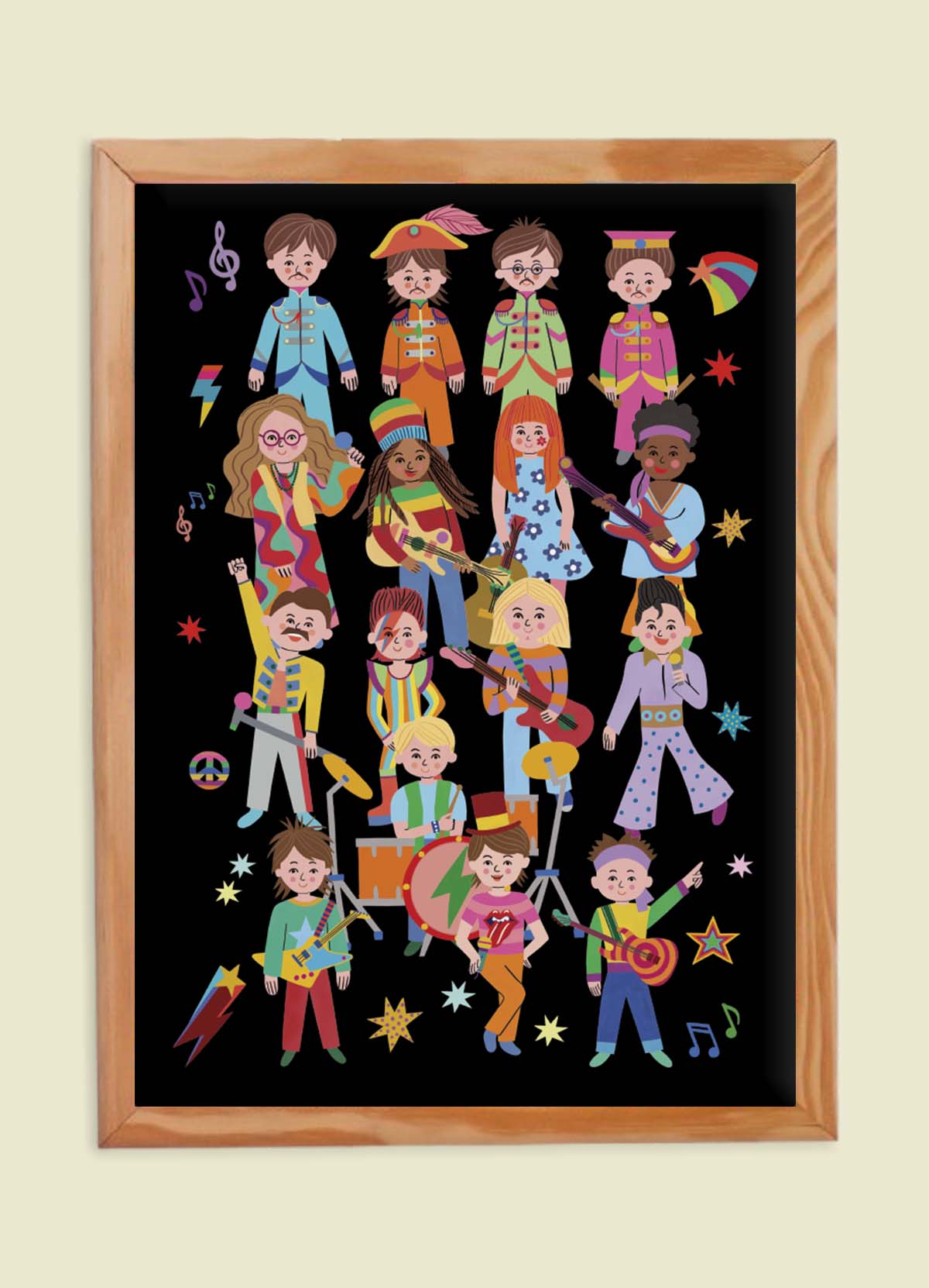 O Pôster Astros da Música da MOOUI possui estampa exclusiva para deixar a parede do quarto da criança ou da brinquedoteca muito mais charmosa. Nosso poster infantil é uma gravura em papel couché, que pode ser usada de duas formas: ser enquadrada, ou aplicada na parede com fita adesiva. Escolha a forma que mais combina com a decoração infantil do seu cantinho e abuse dos posters combinados aos adornos, varais e demais itens decorativos para parede.