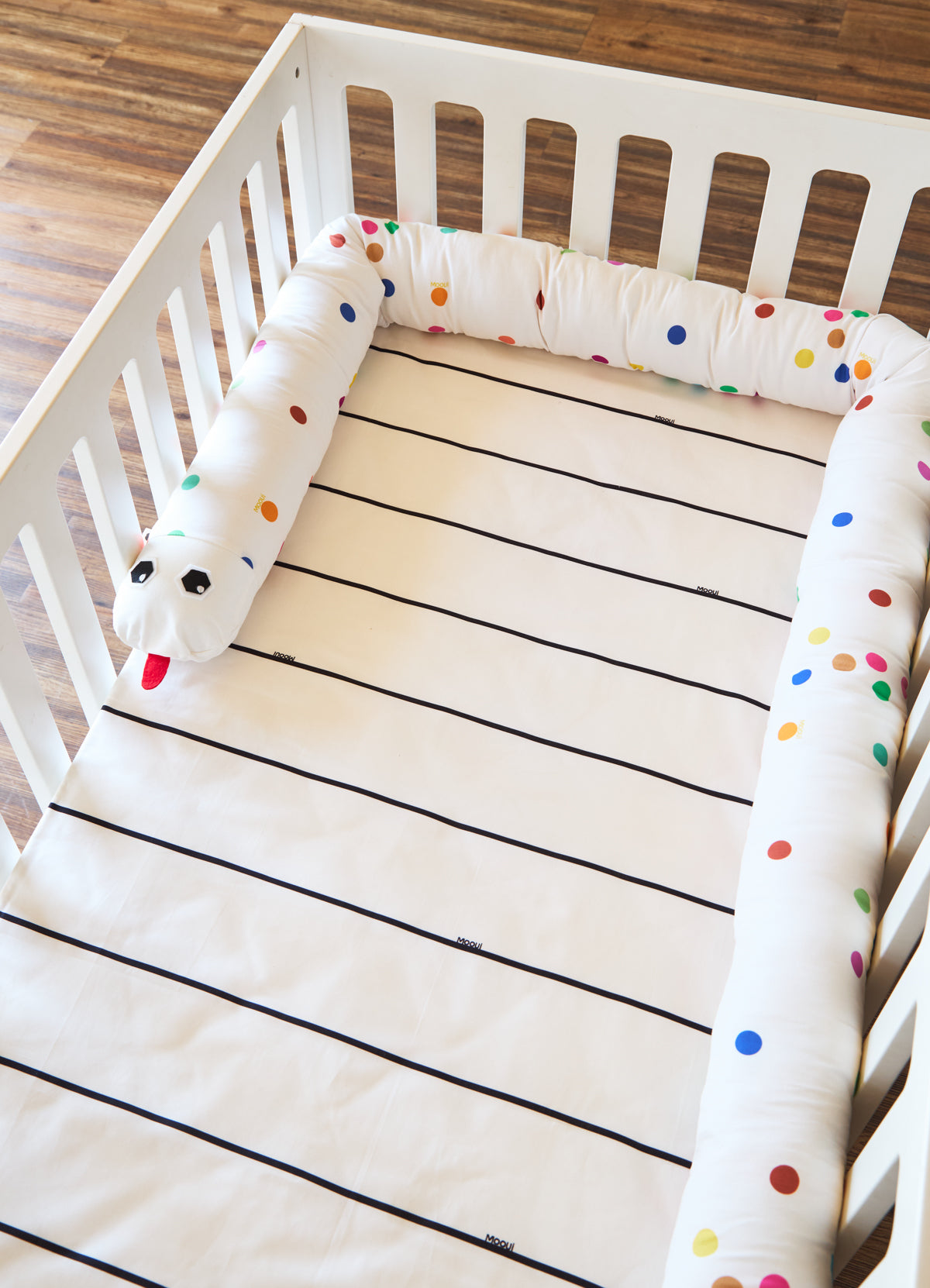 O Protetor de Berço Minhocão Espuma Do Mar da MOOUI protege o bebê contra impactos na cabeceira e laterais do berço. Com formato contínuo e versátil, acompanha o crescimento da criança podendo ser usado posteriormente na cama.