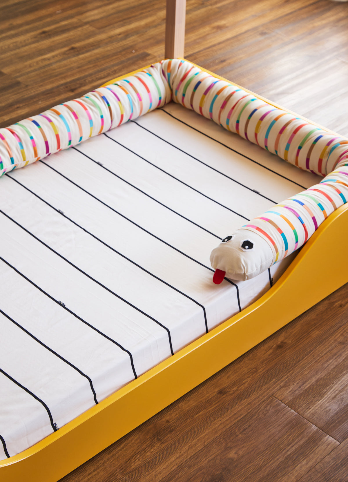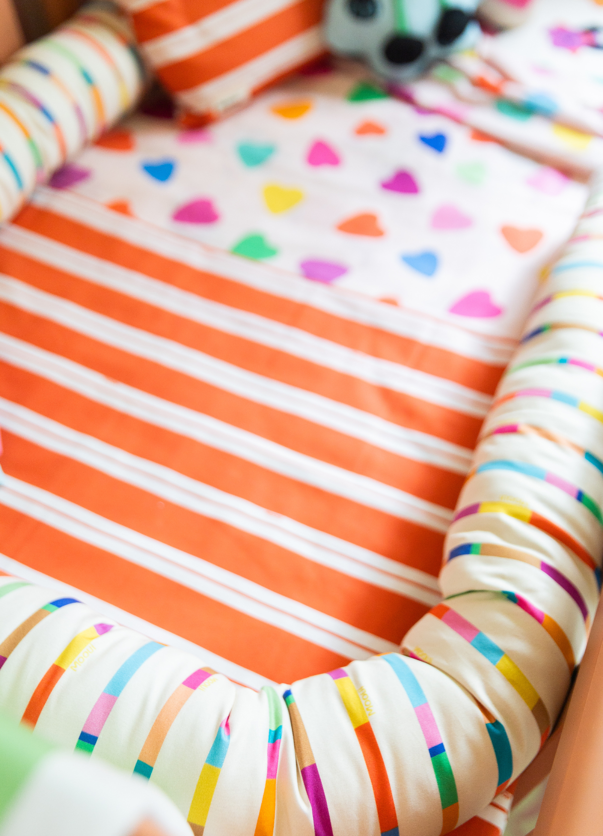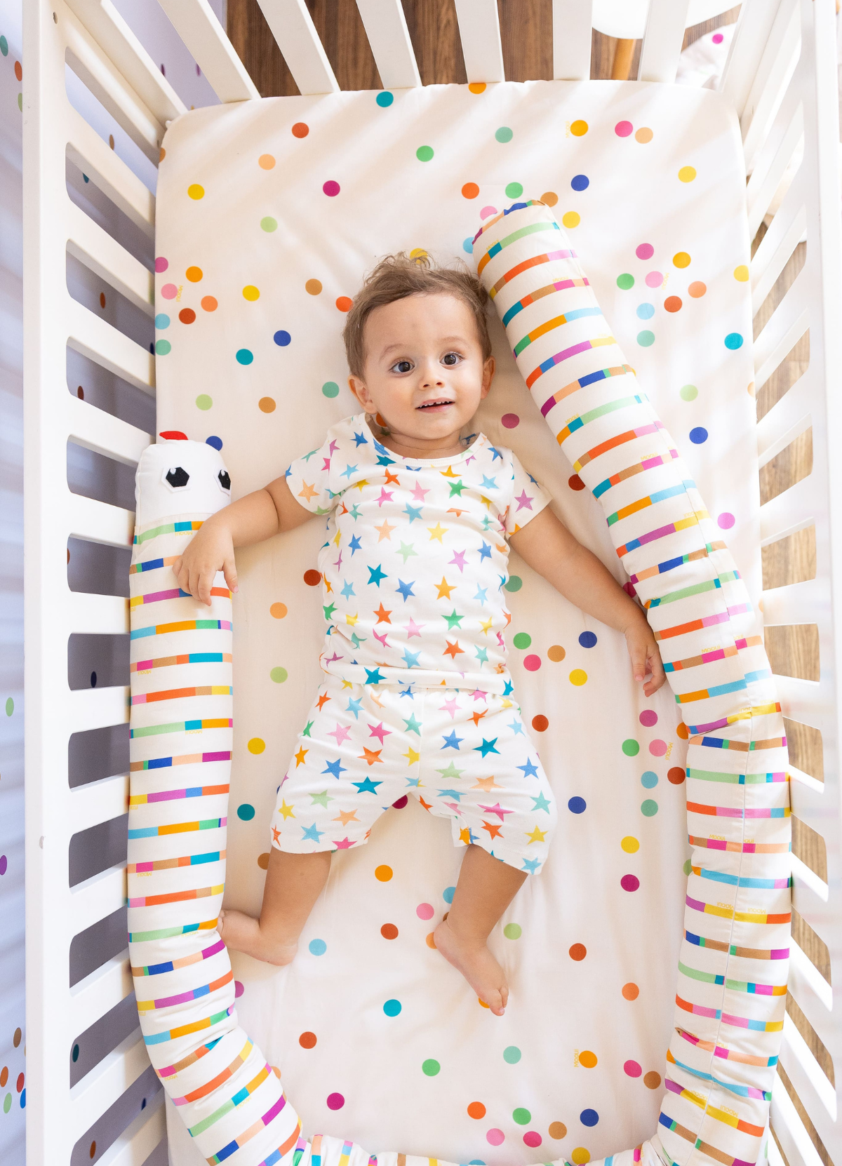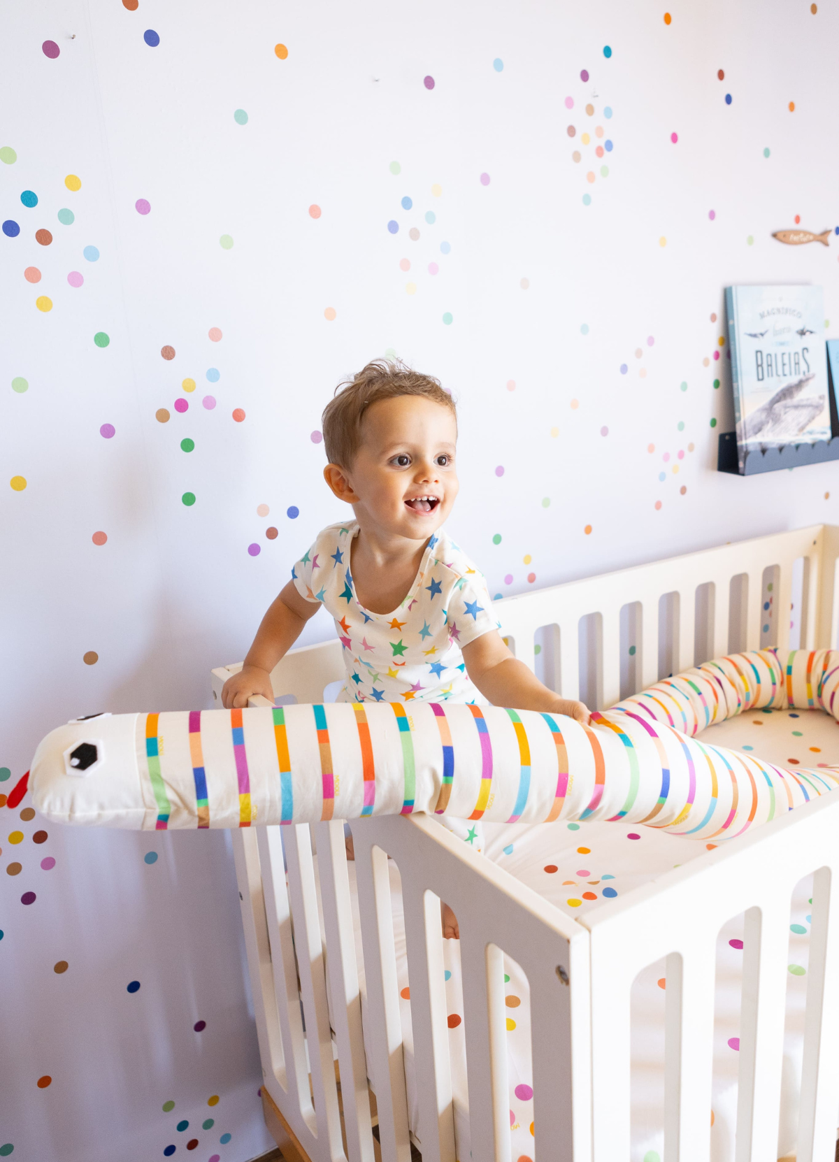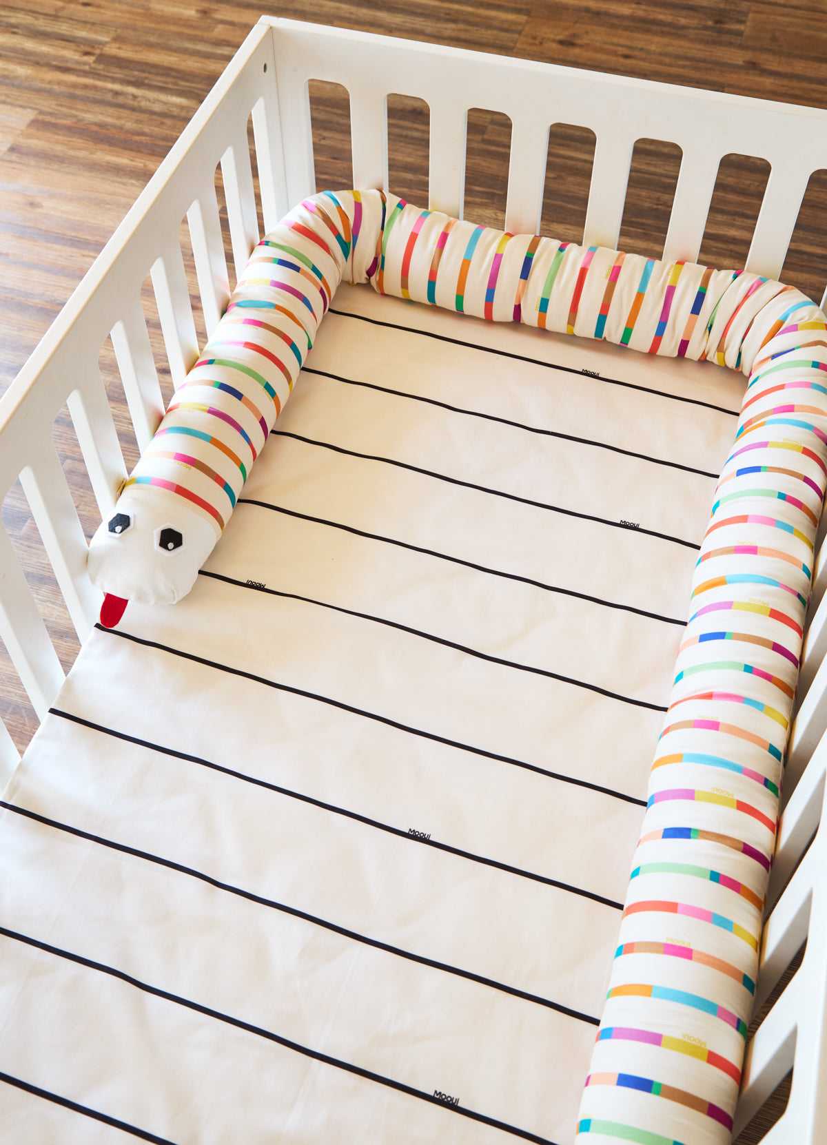 O Protetor de Berço Minhocão Lápis De Colorir da MOOUI protege o bebê contra impactos na cabeceira e laterais do berço. Com formato contínuo e versátil, acompanha o crescimento da criança podendo ser usado posteriormente na cama.