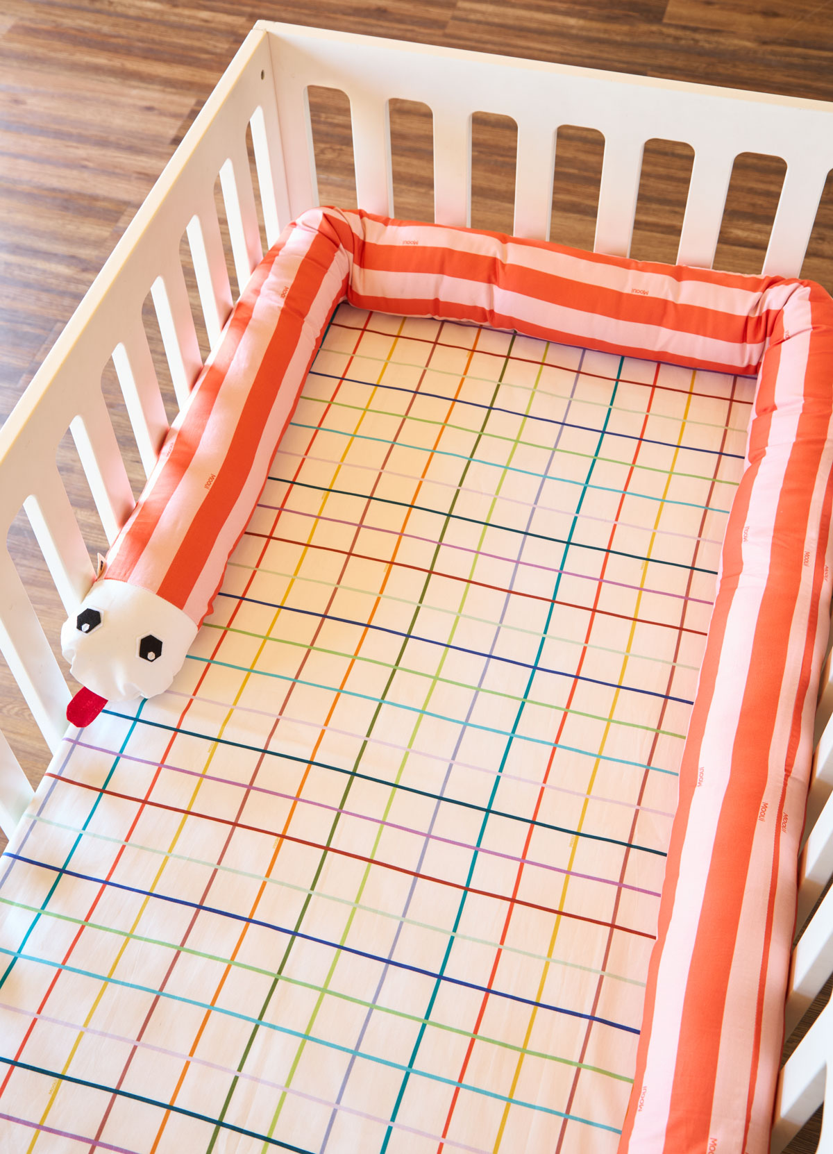 O Protetor de Berço Minhocão Listrado Coral da MOOUI protege o bebê contra impactos na cabeceira e laterais do berço. Com formato contínuo e versátil, acompanha o crescimento da criança podendo ser usado posteriormente na cama.