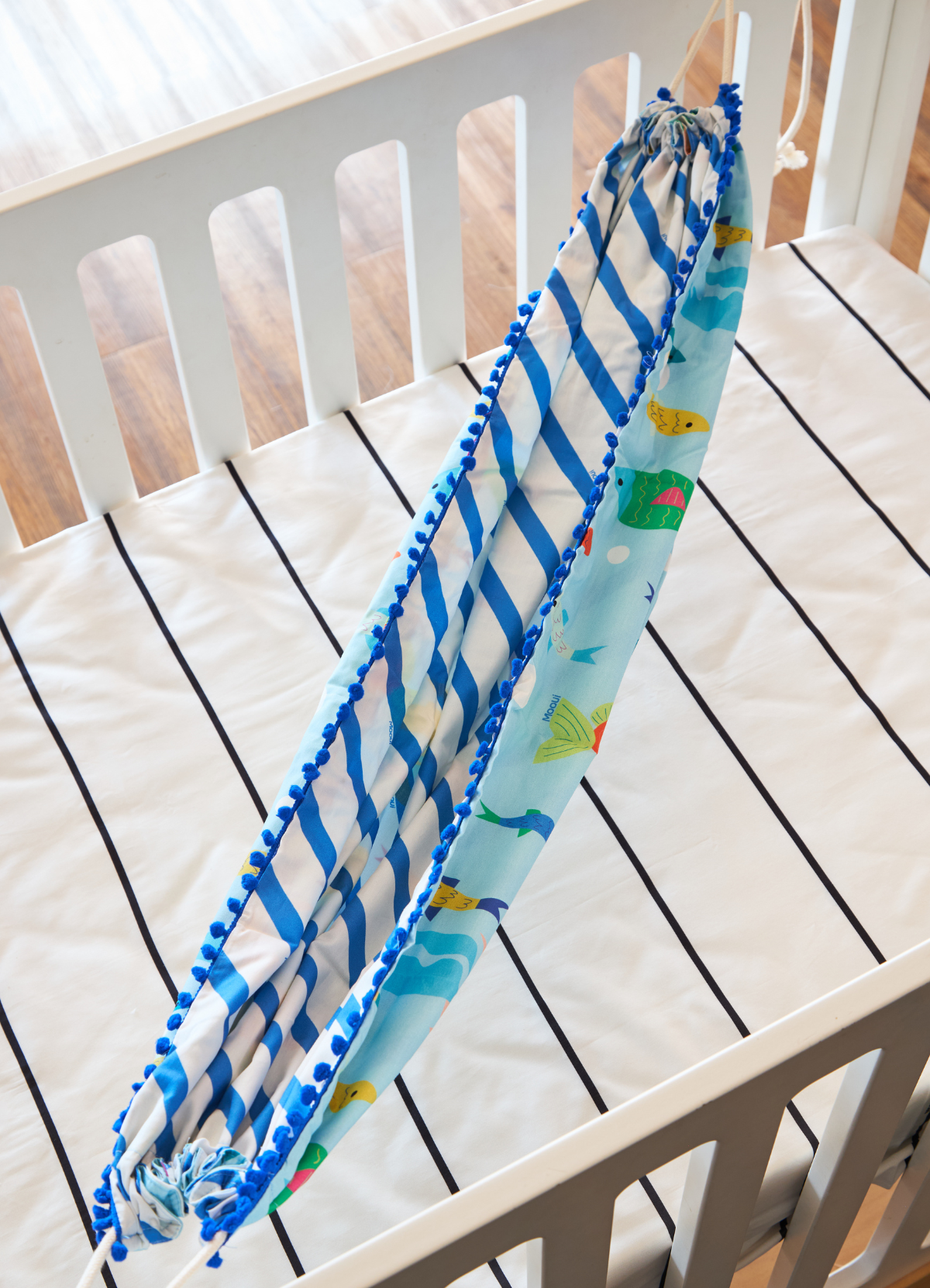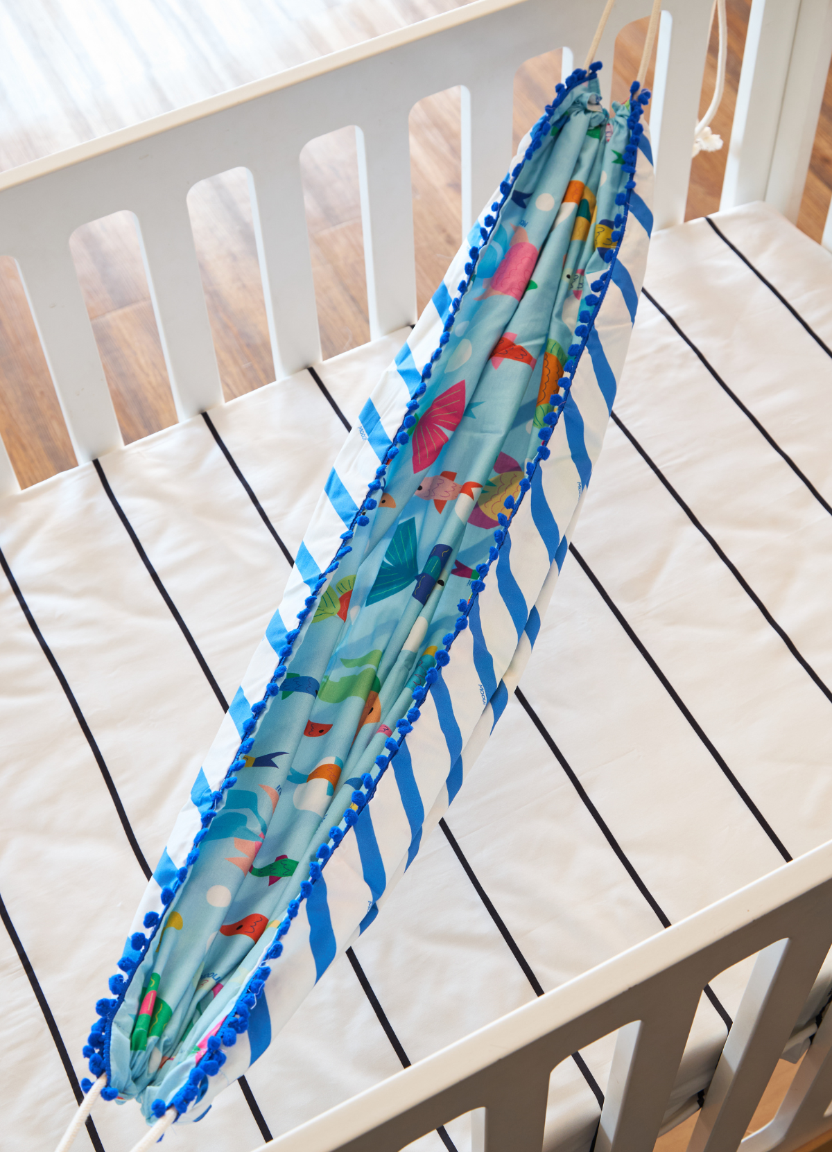 A Rede para Bebê Peixinhos Do Oceano da MOOUI proporciona aconchego e tranquilidade através do balanço suave que acalma os pequenos. Desenvolvida com cordão para fixação segura ao berço ou cama, é a escolha perfeita para momentos de relaxamento.