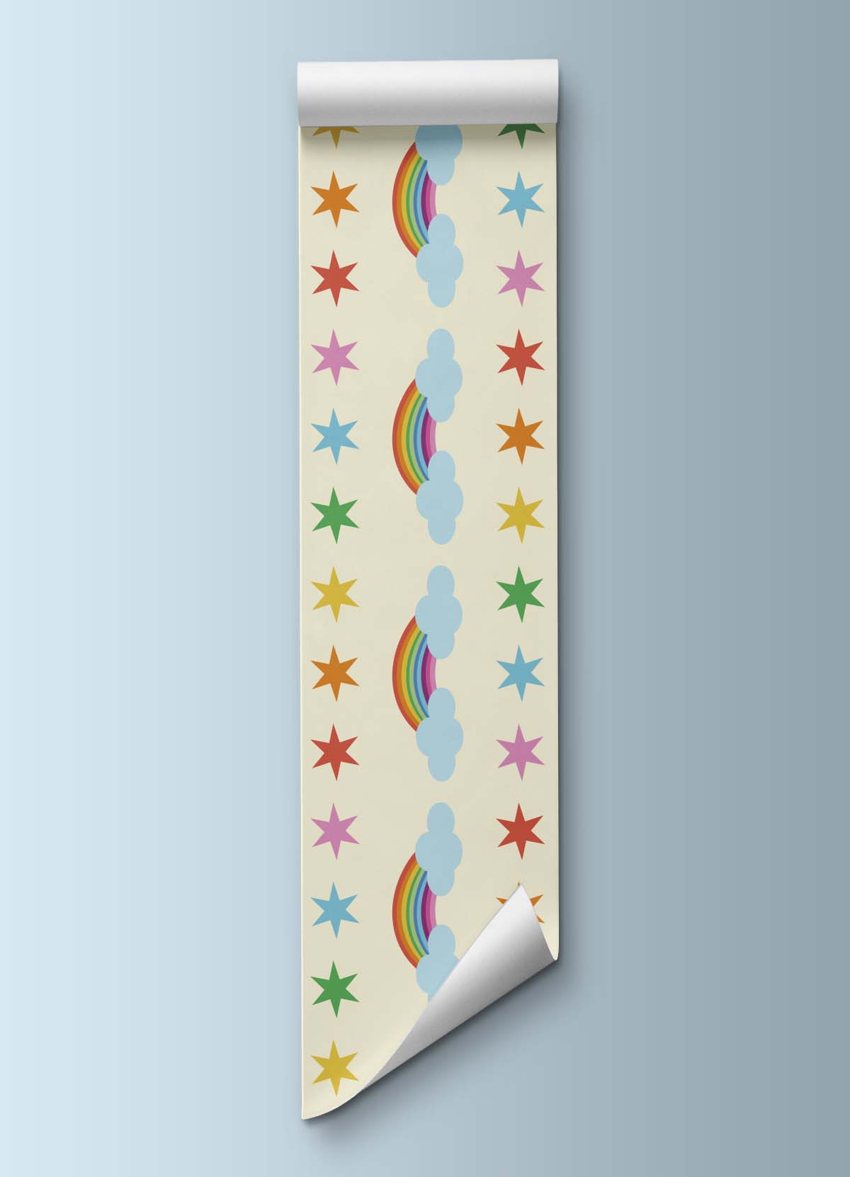 O roda-teto Arco-íris e Estrelas MOOUI é uma faixa decorativa feita com papel de parede non woven, com leve textura e tonalidade off-white, perfeita para dar um acabamento especial à parte superior das paredes, contornar portas ou destacar cantinhos com criatividade. Feito a partir de celulose e fibras sintéticas, o material é resistente, não sofre retração com o tempo e pode ser limpo com pano branco, limpo e levemente umedecido.