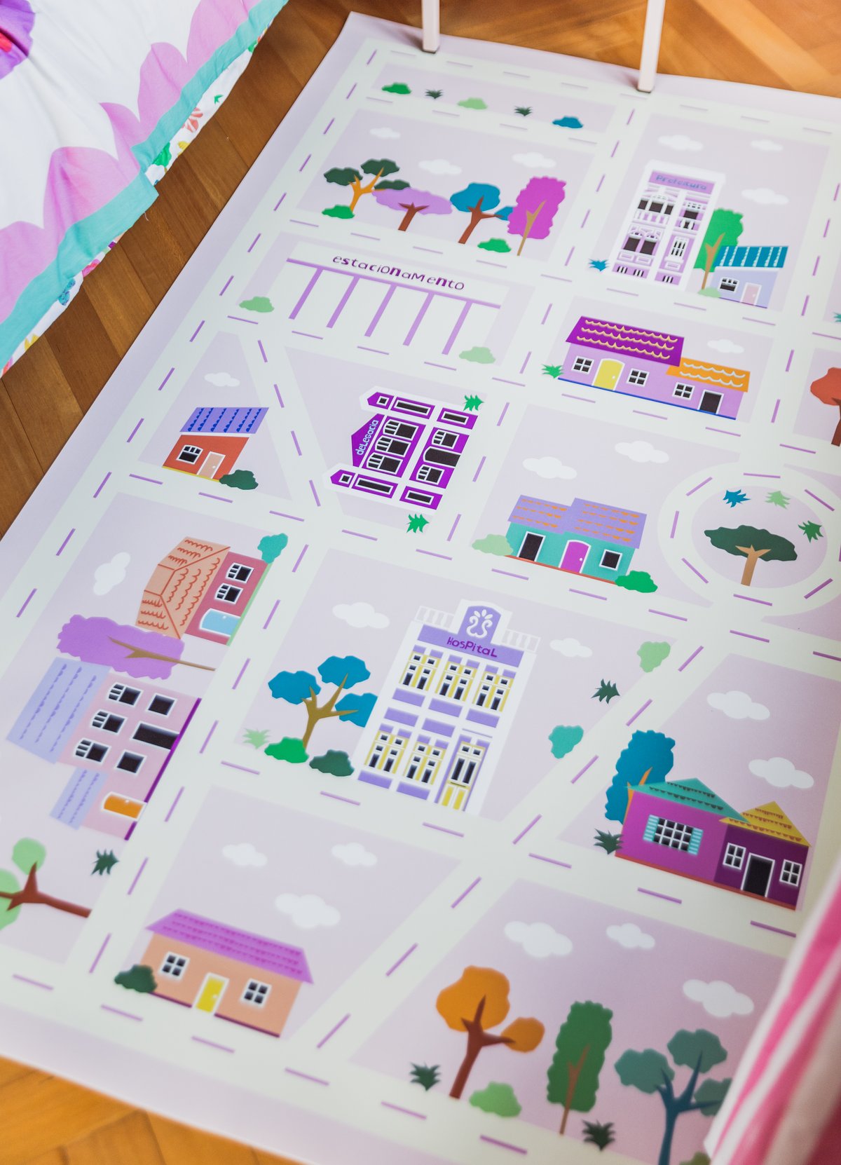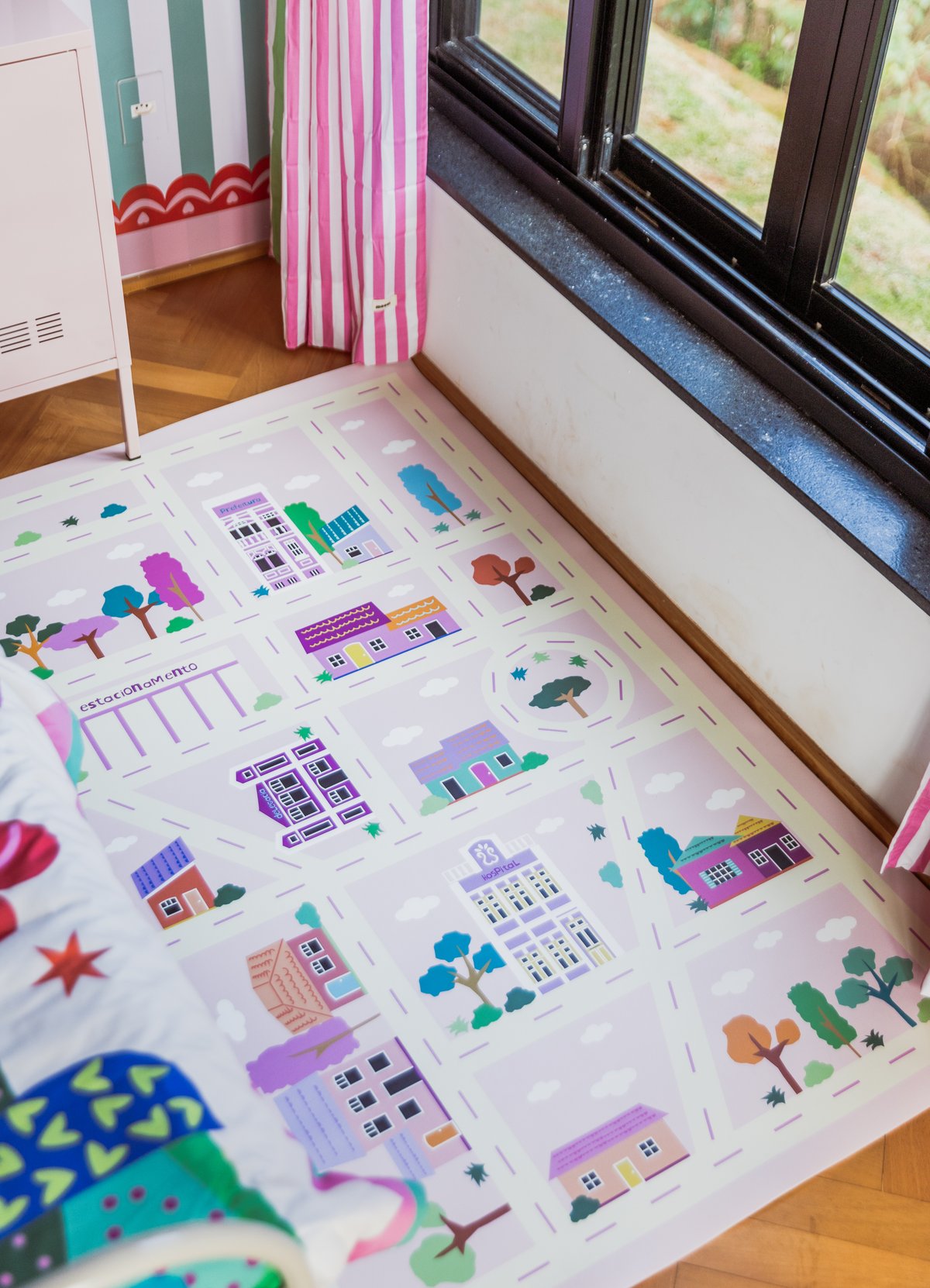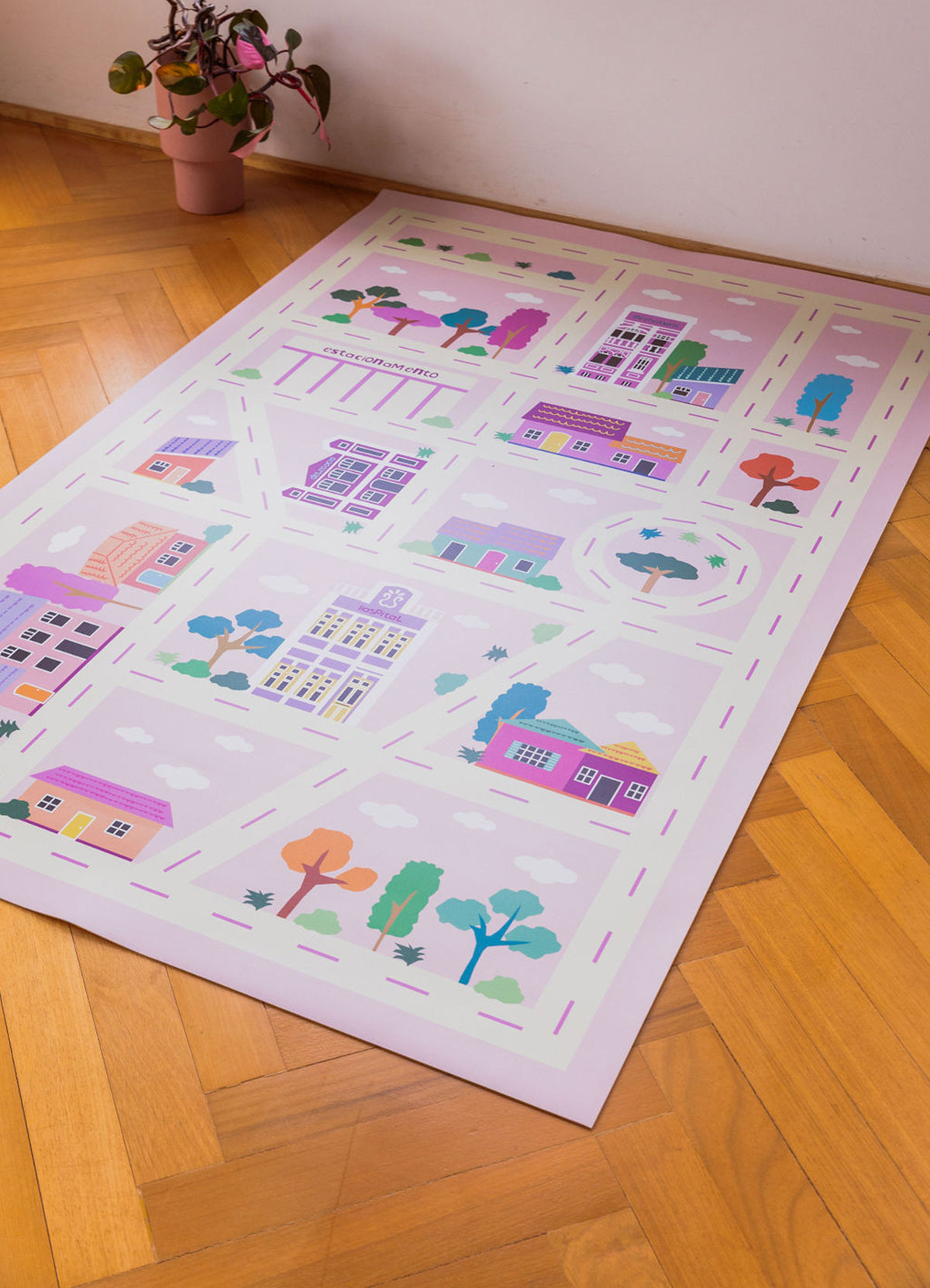 O Tapete Playmat Cidade Rosa da MOOUI proporciona um espaço seguro e divertido para o desenvolvimento infantil. Confeccionado em PVC de 2mm com estampas exclusivas, protege as crianças de impactos e mantém o ambiente limpo durante as brincadeiras.