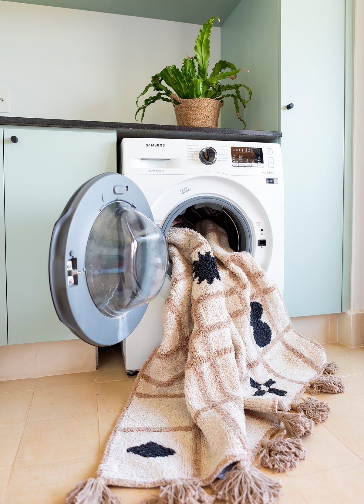 O tapete de algodão Lorena Canals e MOOUI, produzido com tintas atóxicas, é leve devido à sua composição e trama flexíveis, permitindo que ele seja lavado no conforto de sua casa, em máquinas de lavar roupas convencionais. Feito à mão, um a um por técnicas de tear tradicionais indianas, cada peça do tapete é única e artesanal, podendo haver pequenas irregularidades e variações.