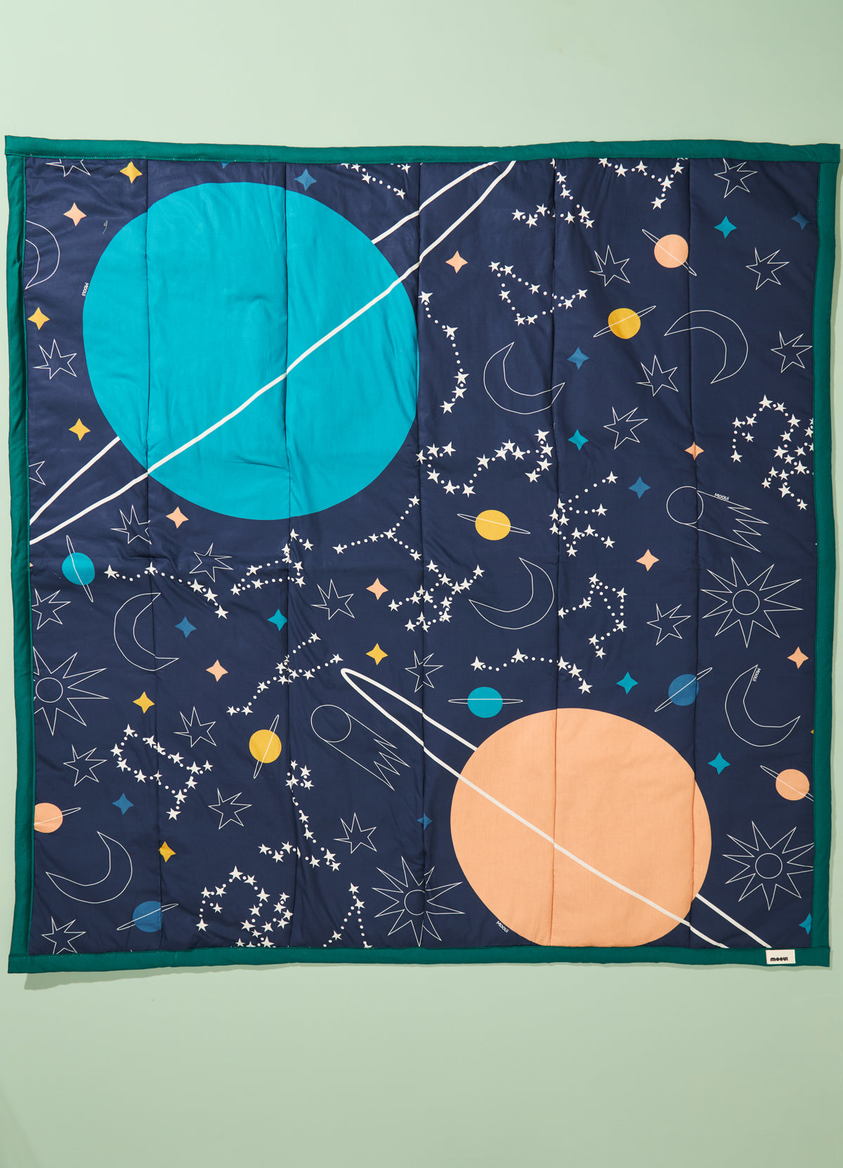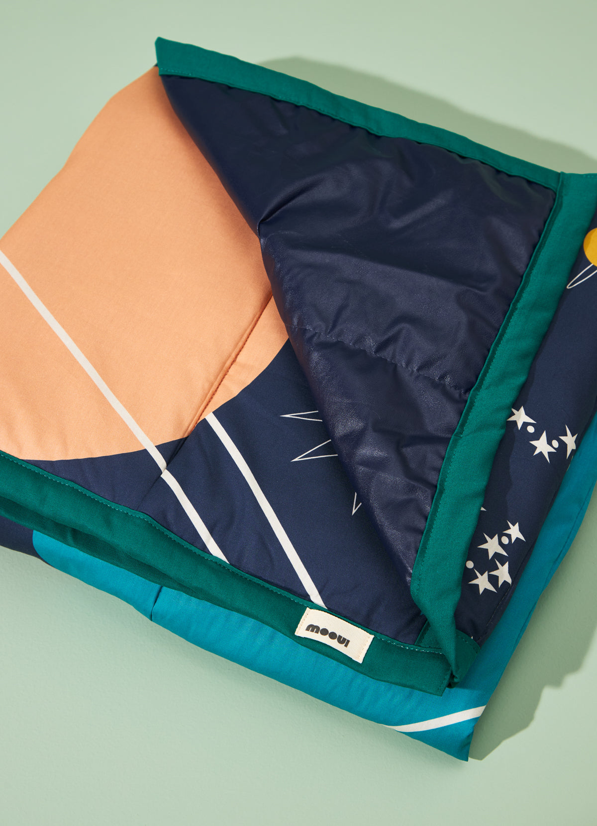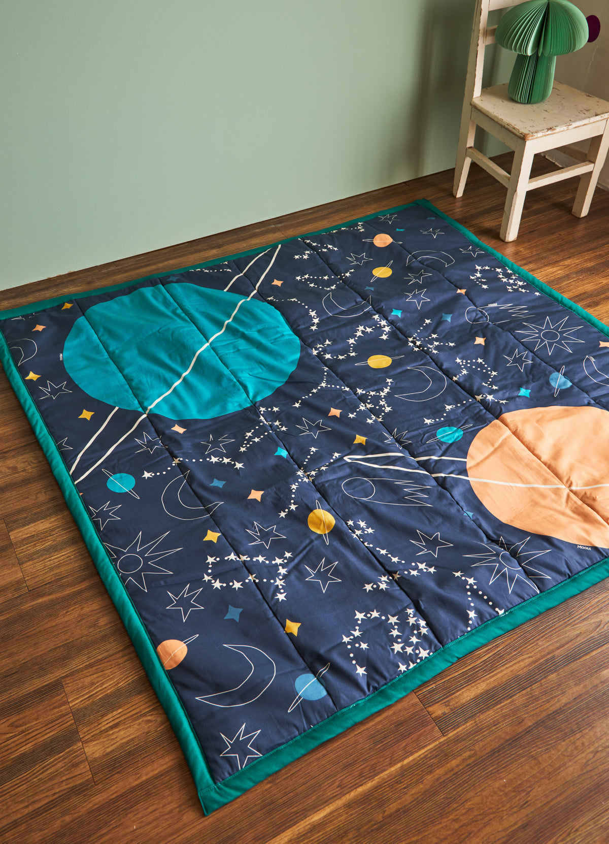 O Tapetinho de Atividades Céu Estrelado da MOOUI cria um espaço seguro e confortável para bebês e crianças brincarem no chão. Acolchoado e confeccionado em algodão acetinado na parte superior e napa na parte inferior, proporciona maciez e isolamento térmico.