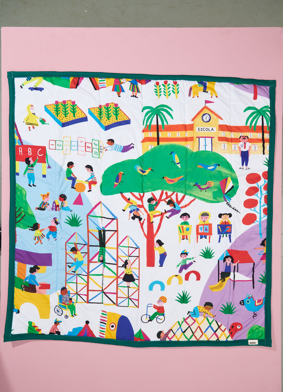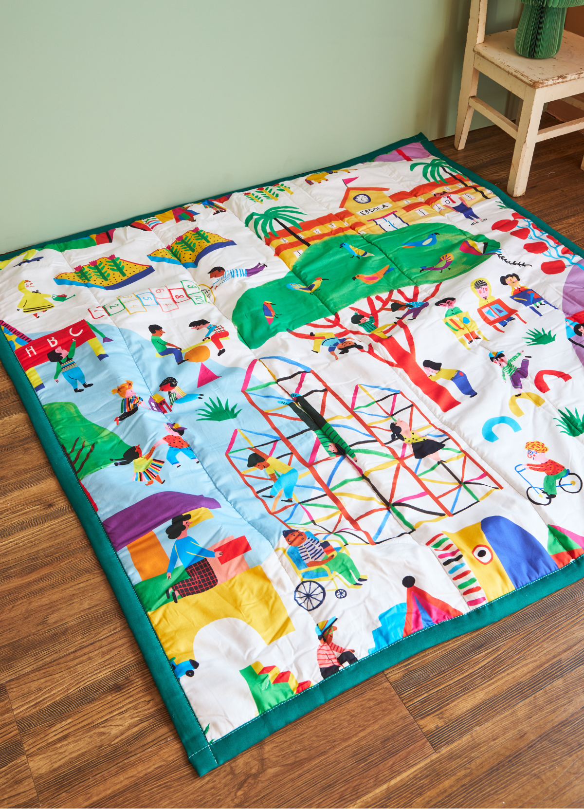 O Tapetinho de Atividades Ir à Escola da MOOUI cria um espaço seguro e confortável para bebês e crianças brincarem no chão. Acolchoado e confeccionado em algodão acetinado na parte superior e napa na parte inferior, proporciona maciez e isolamento térmico.