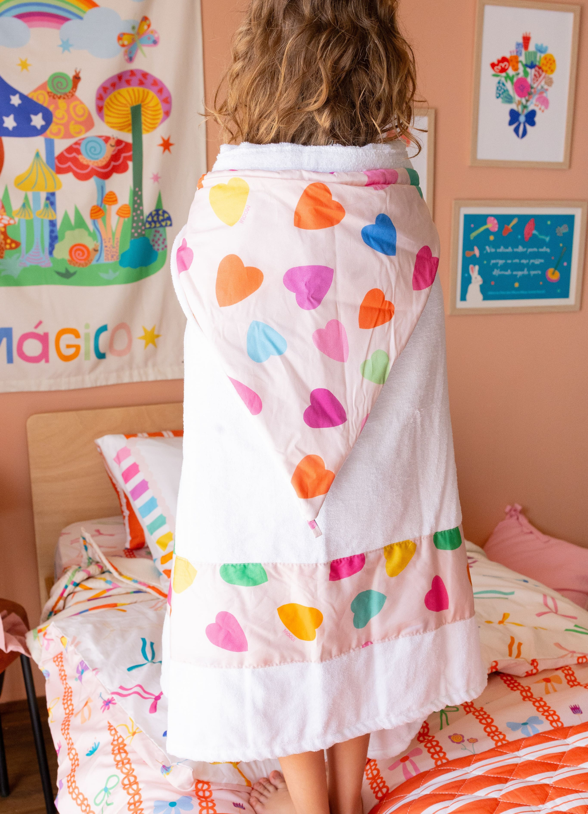 A Toalha de Banho Infantil Direito De Amar da MOOUI transforma o momento do banho em uma experiência lúdica e aconchegante. Confeccionada em tecido felpudo e aveludado de alta absorção, possui capuz para proteger a cabeça da friagem.