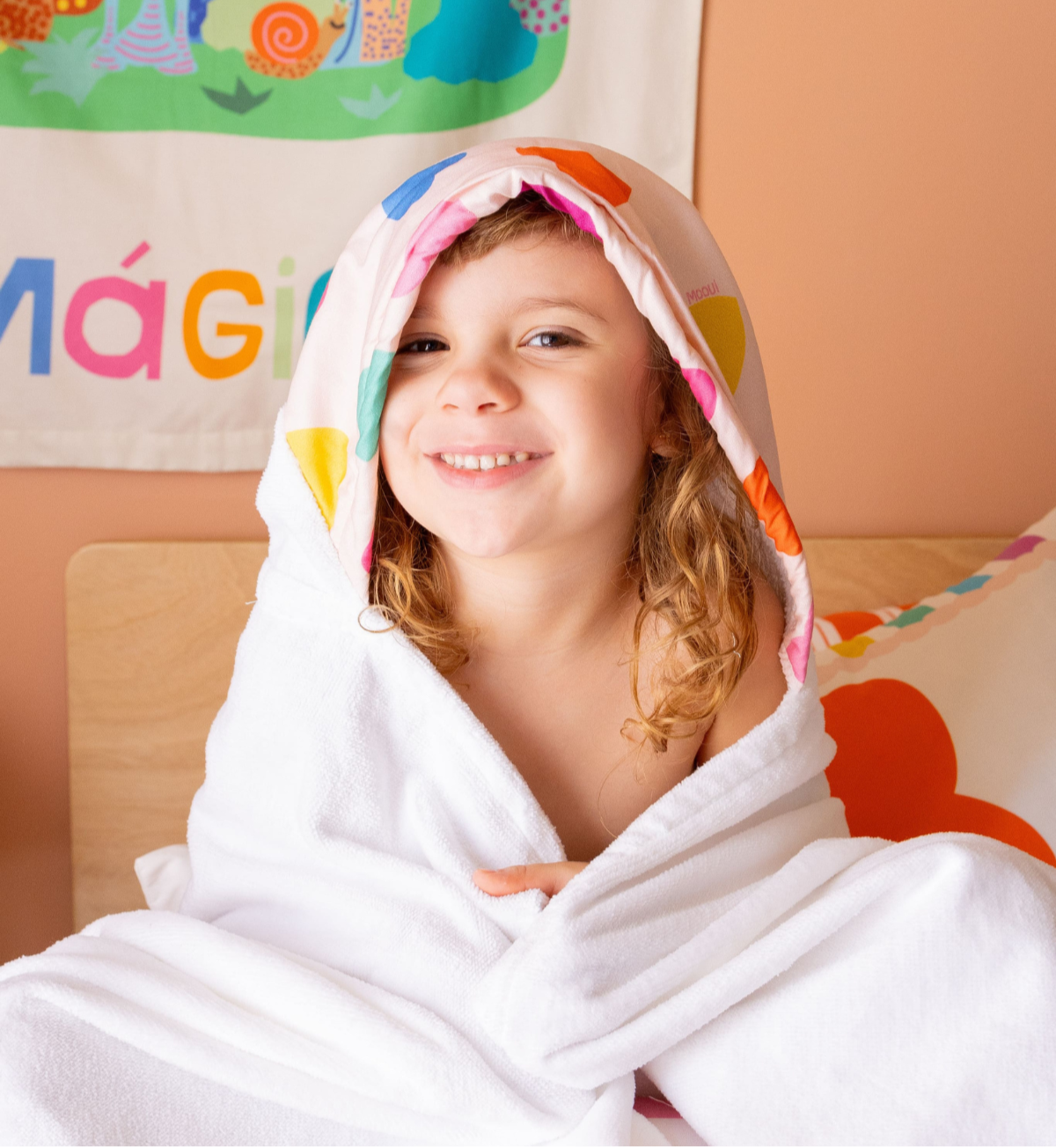 As estampas exclusivas MOOUI aplicadas no capuz e barrado adicionam um toque especial, trazendo diversão e personalidade para o momento do banho dos pequenos.