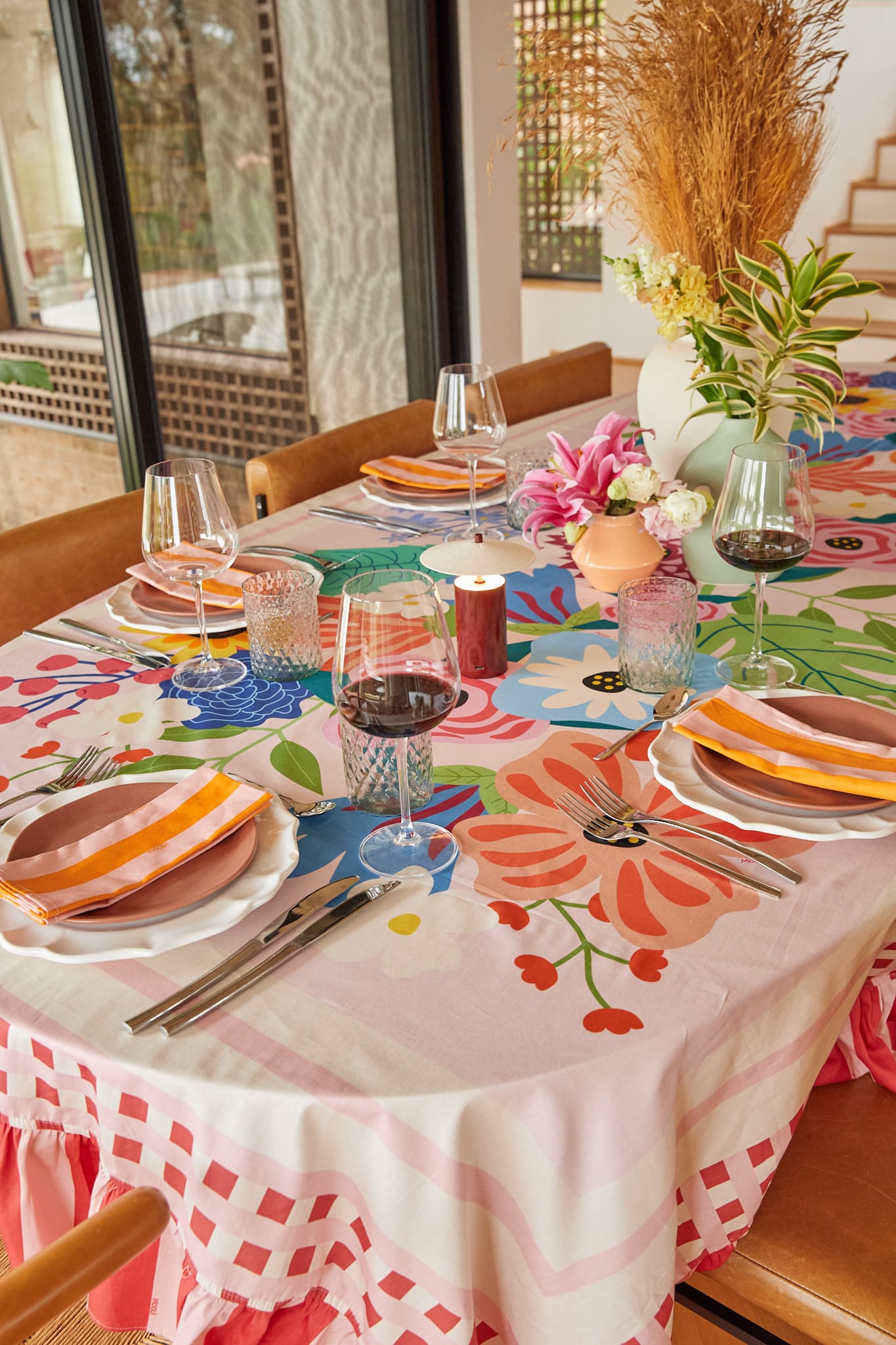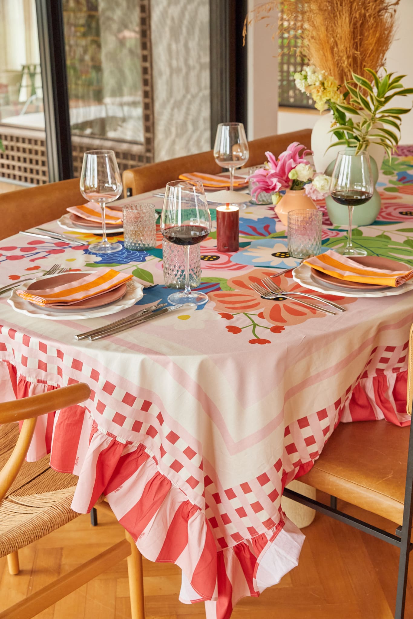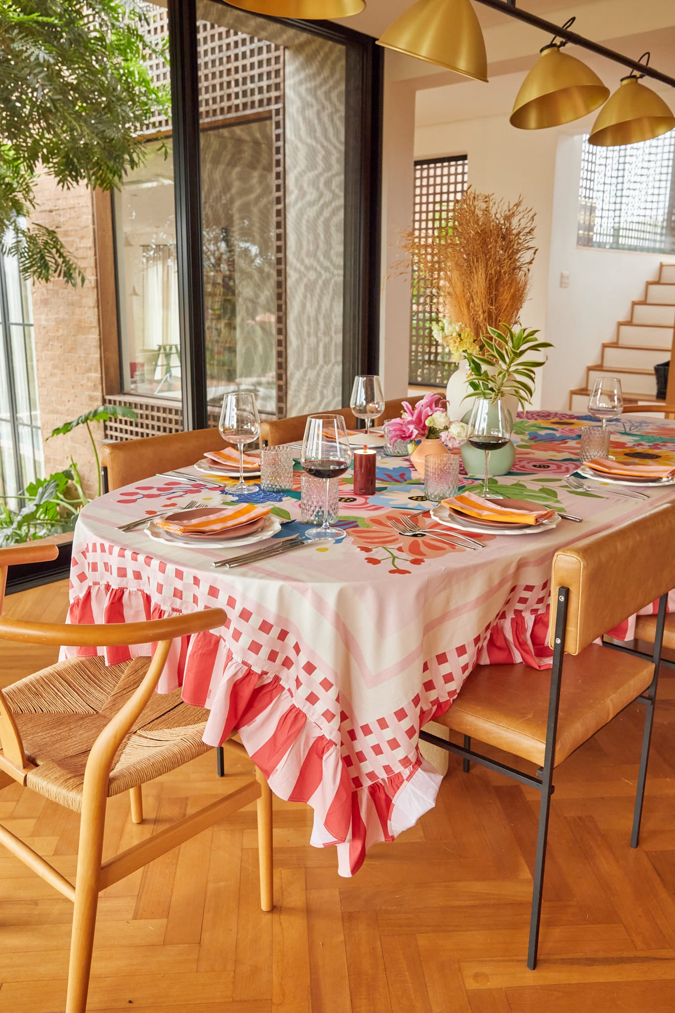 A Toalha de Mesa Babado Floral Romântico traz uma estampa exclusiva da MOOUI para vestir sua mesa com muito estilo. As refeições do dia a dia não serão mais as mesmas graças ao charme dessa toalha de mesa.