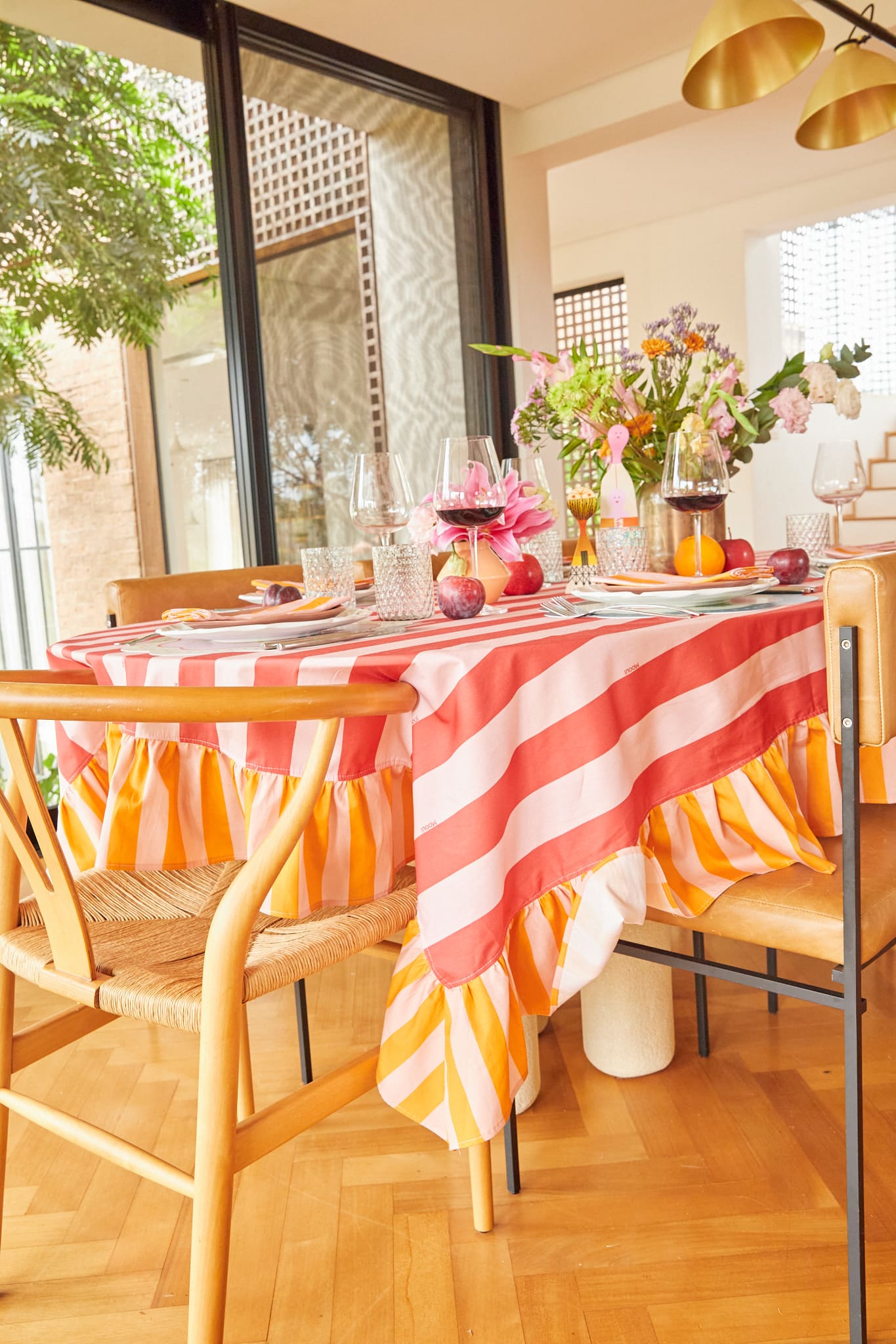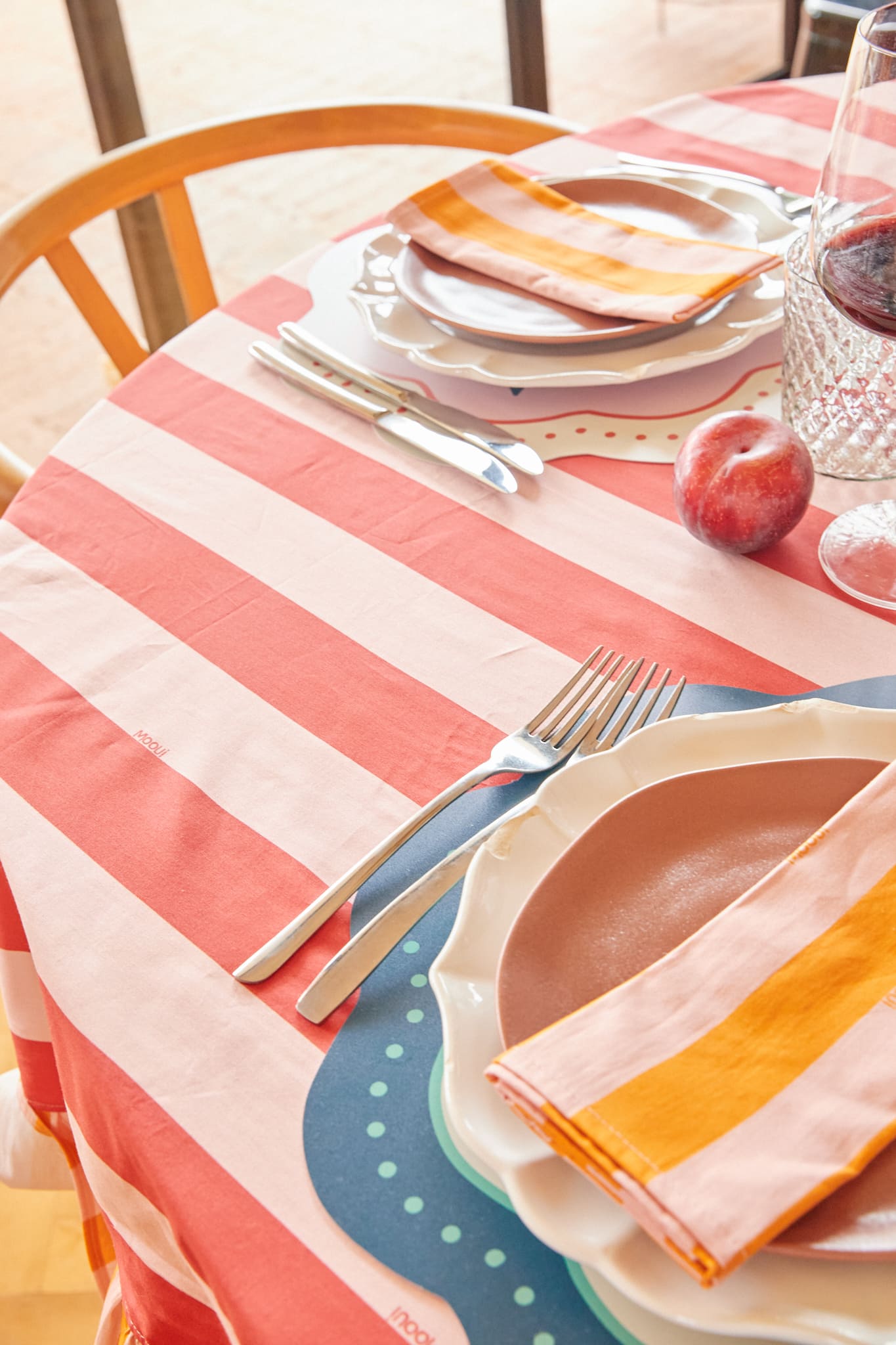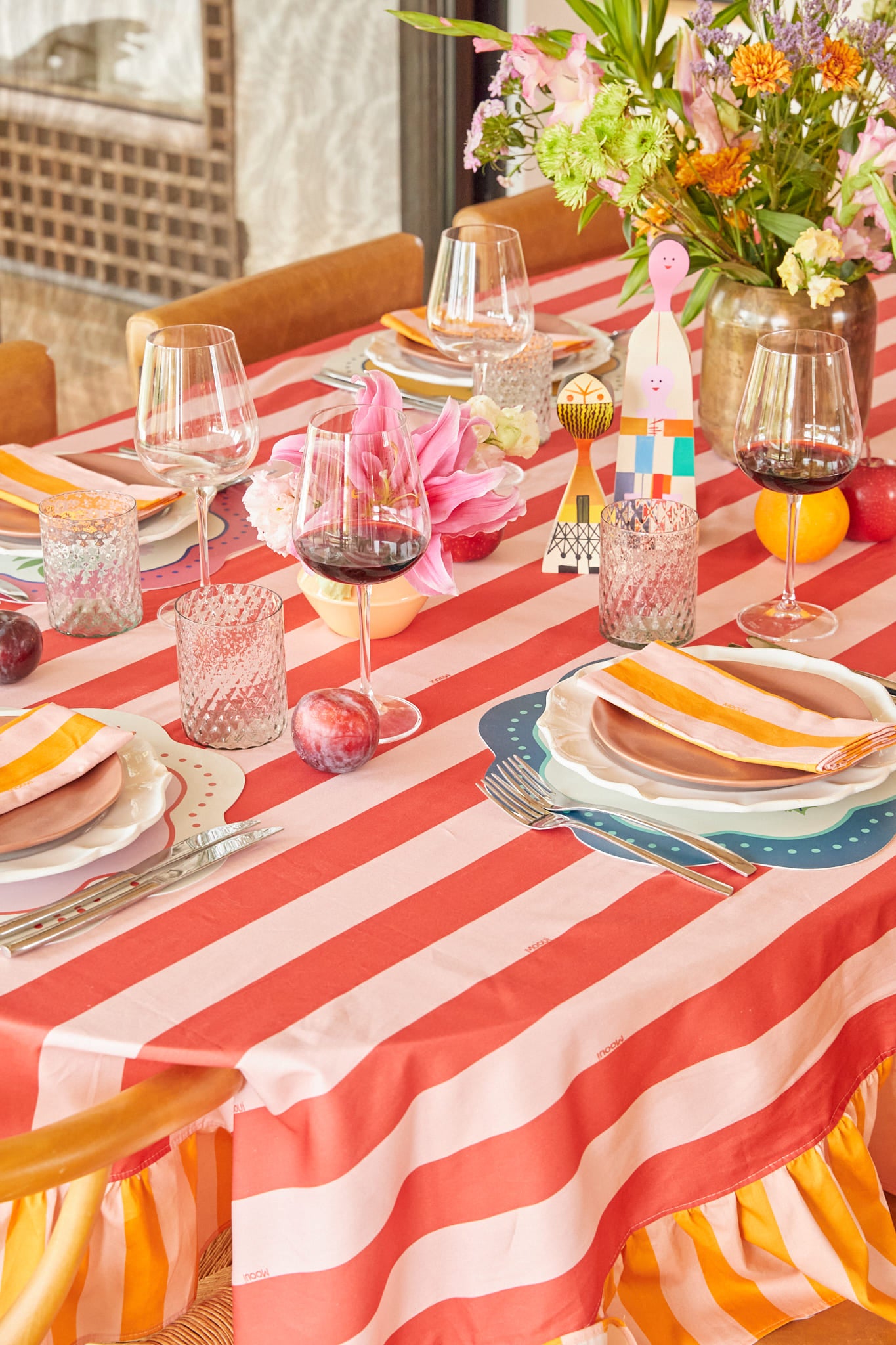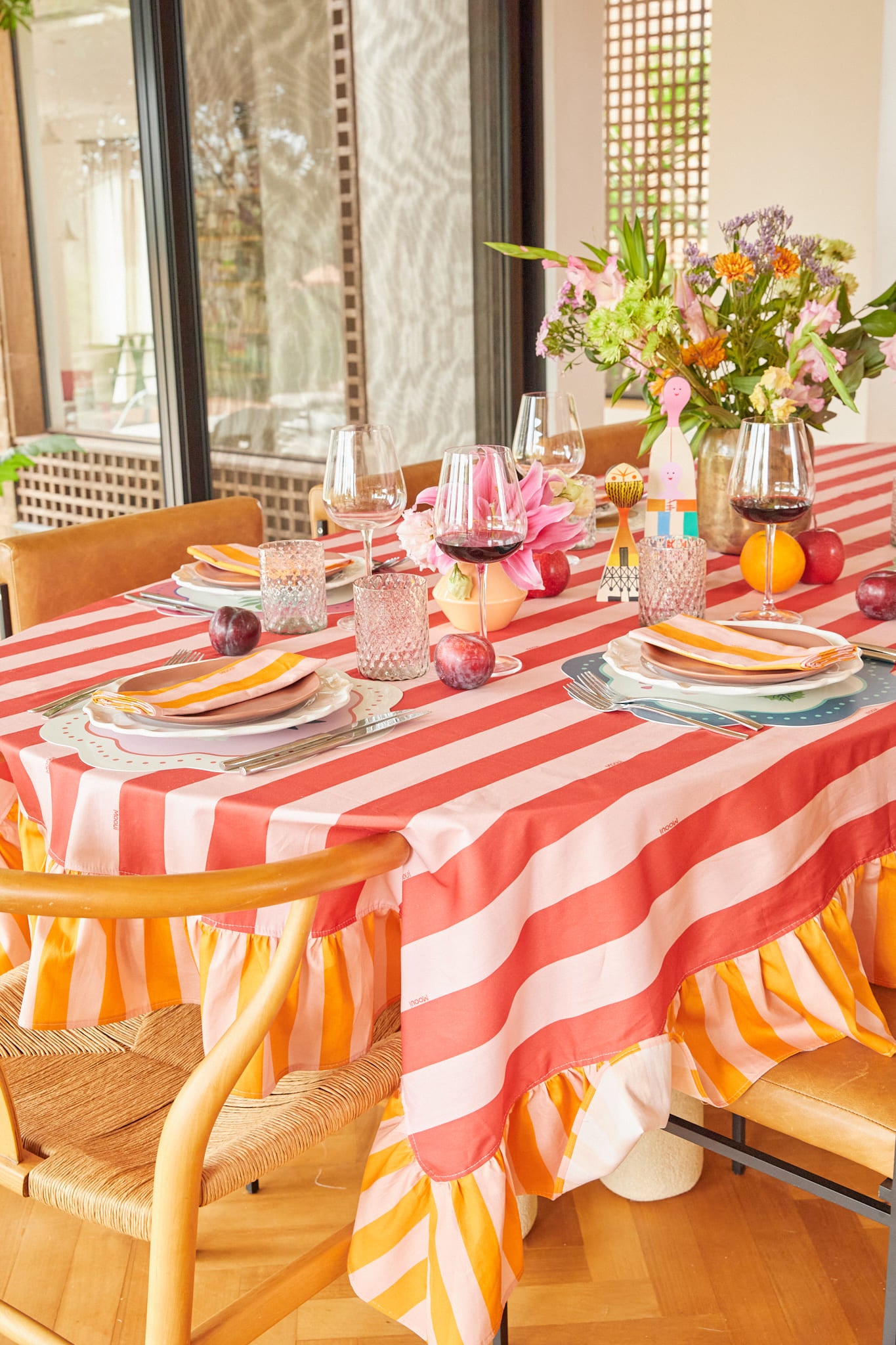 A Toalha de Mesa Babado Listrado Cerejeira traz uma estampa exclusiva da MOOUI para vestir sua mesa com muito estilo. As refeições do dia a dia não serão mais as mesmas graças ao charme dessa toalha de mesa.