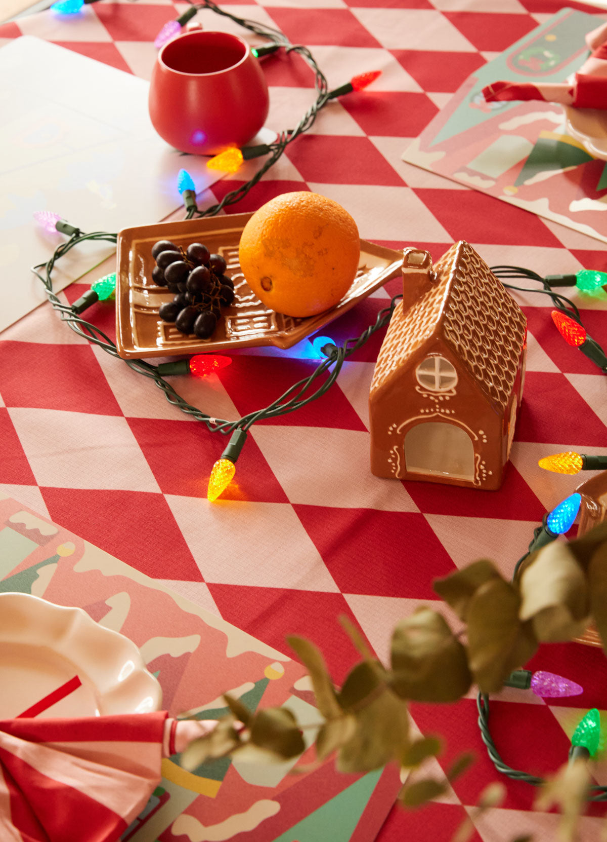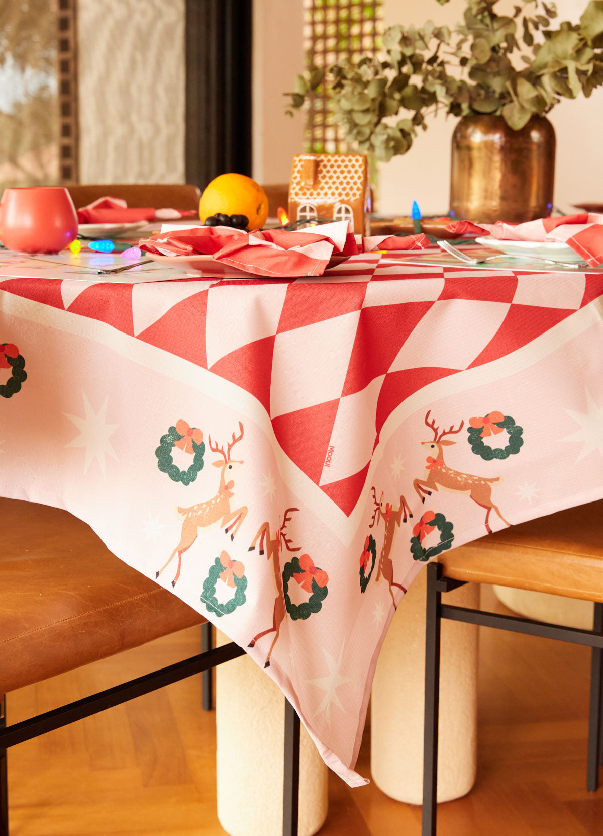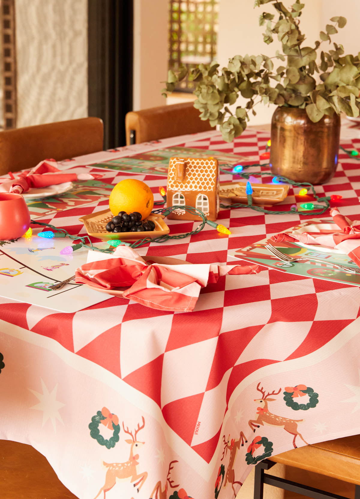 A Toalha de Mesa Impermeável Renas e Guirlandas traz uma estampa exclusiva da MOOUI para vestir sua mesa com muito estilo. As refeições do dia a dia não serão mais as mesmas graças ao charme dessa toalha de mesa. Por ser impermeável, ela protege a mesa e traz muita praticidade e comodidade para sua casa.