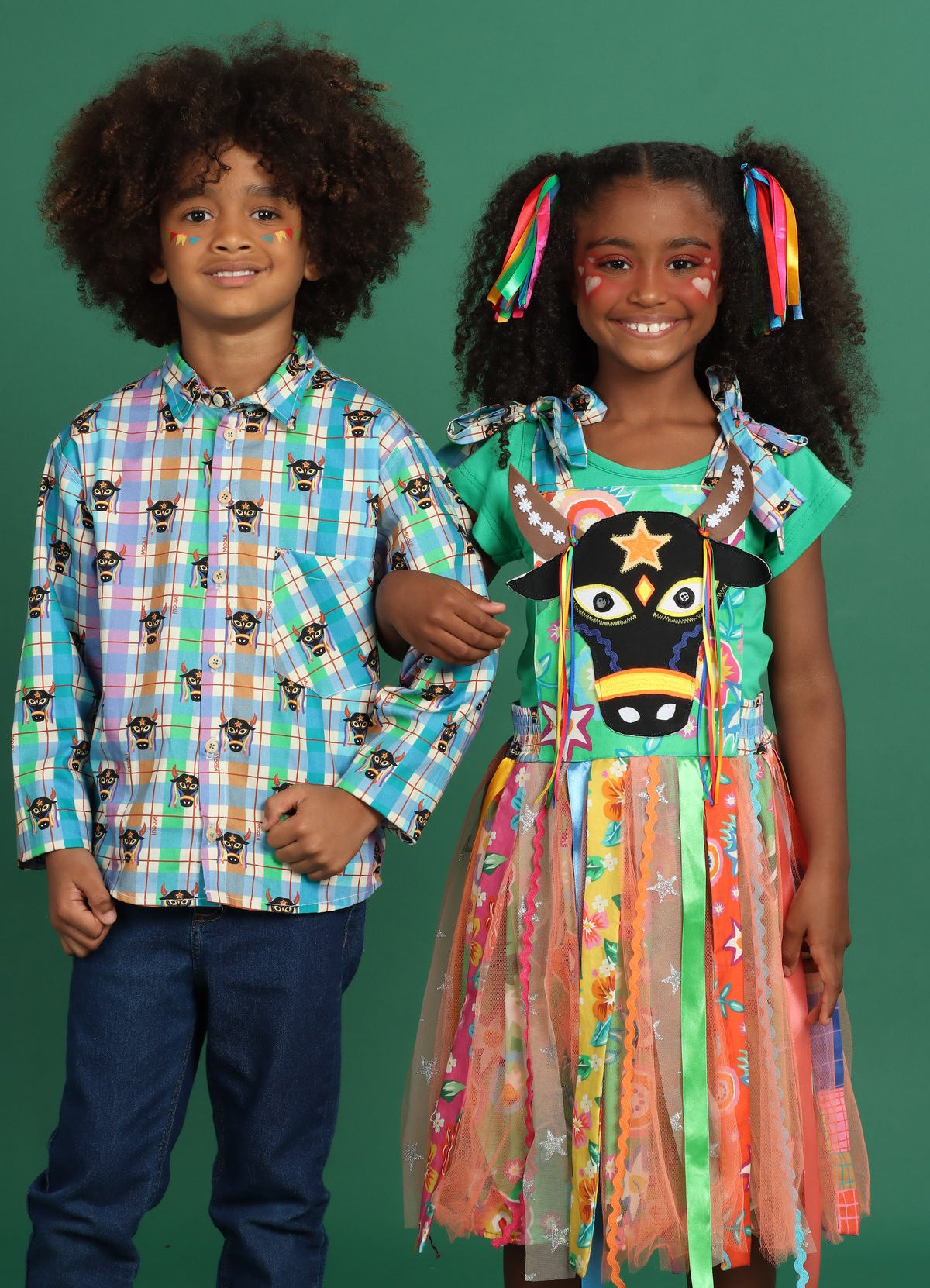 O Vestido de Festa Junina Infantil Boi Bumbá é perfeito para quem busca uma fantasia junina cheia de cor, movimento e originalidade. Com um design criativo, o modelo traz na parte frontal o rosto do Boi Bumbá aplicado, criando um visual lúdico e encantador para as crianças brilharem nas festas.
