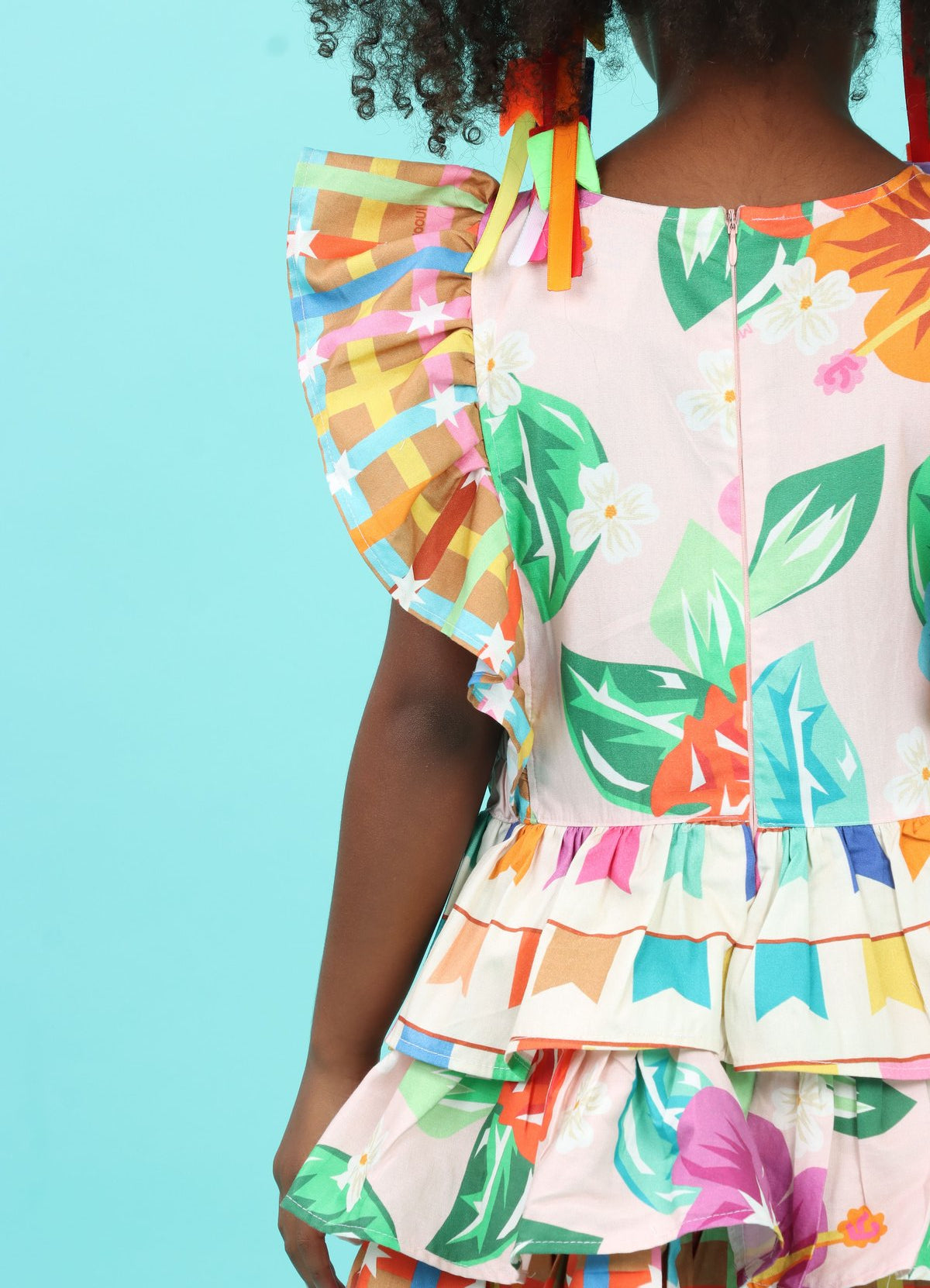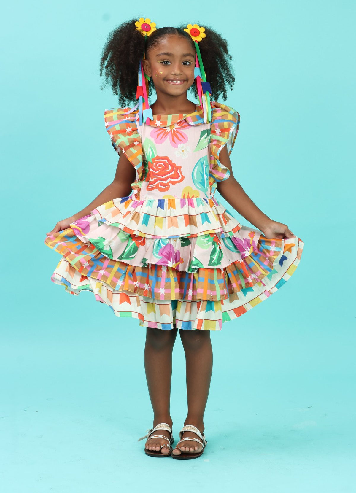A estampa tem localização variável, deixando cada vestido único. Um look encantador para quem busca vestido caipira infantil ou roupa junina para meninas com qualidade e originalidade.