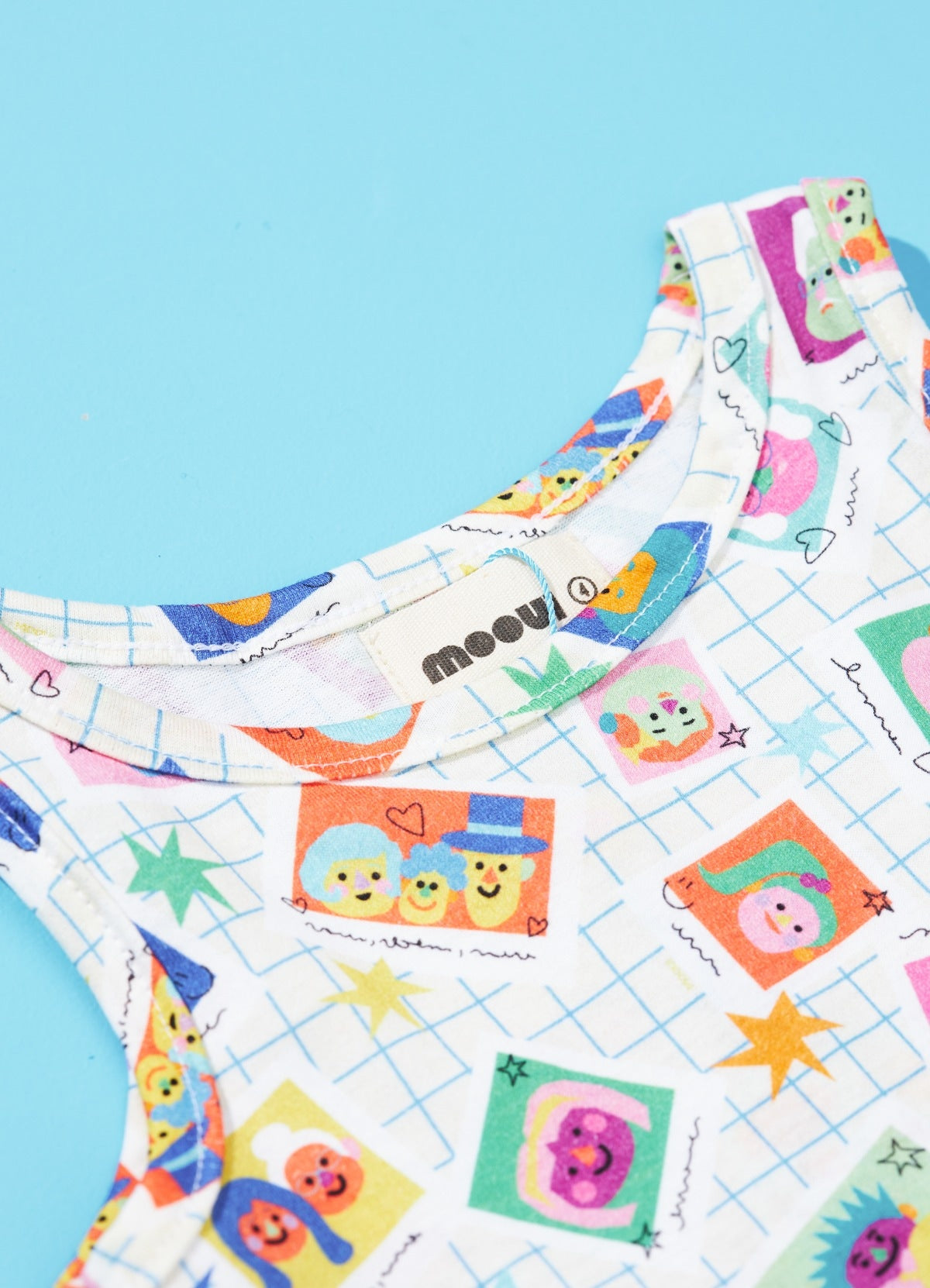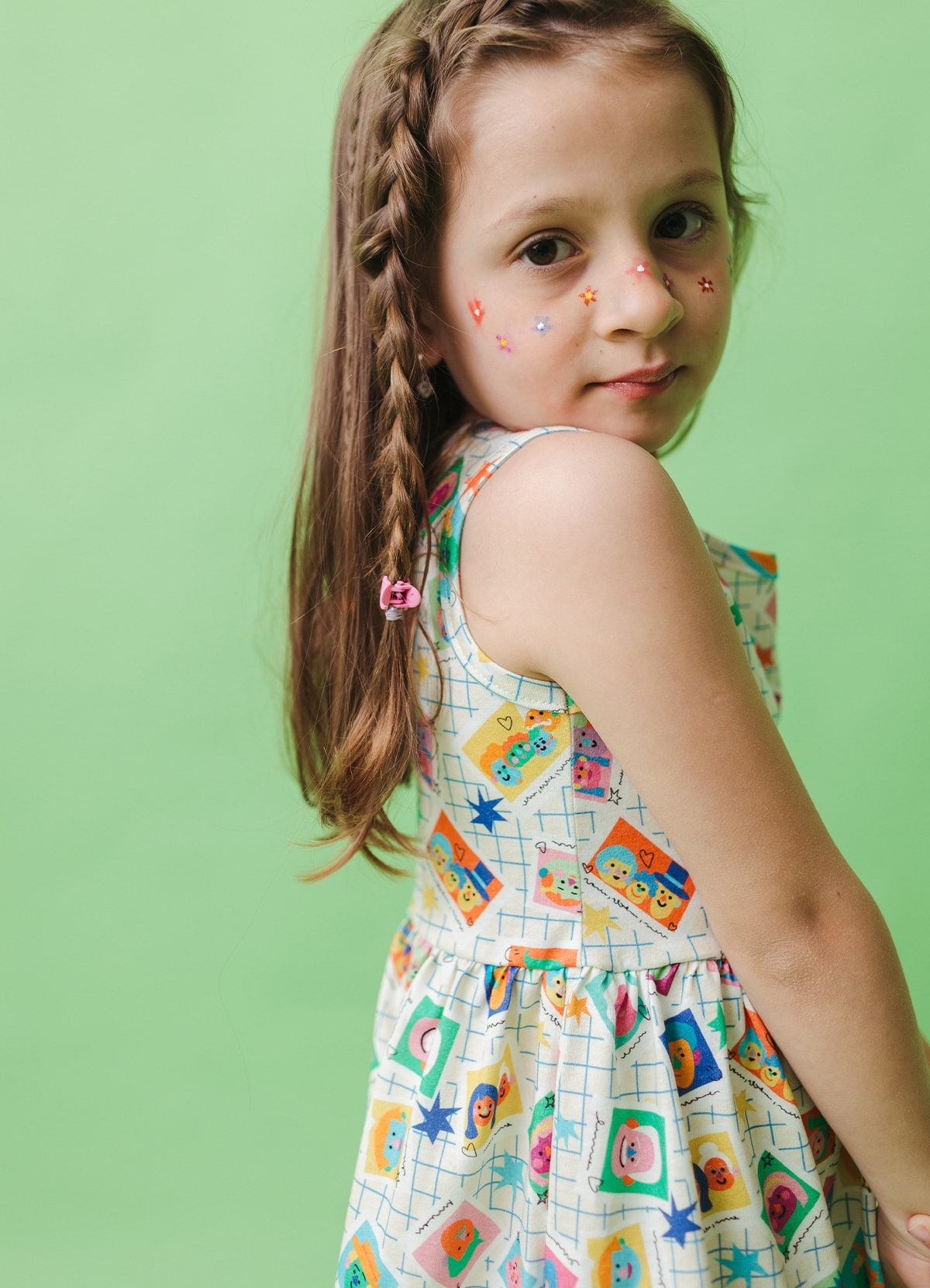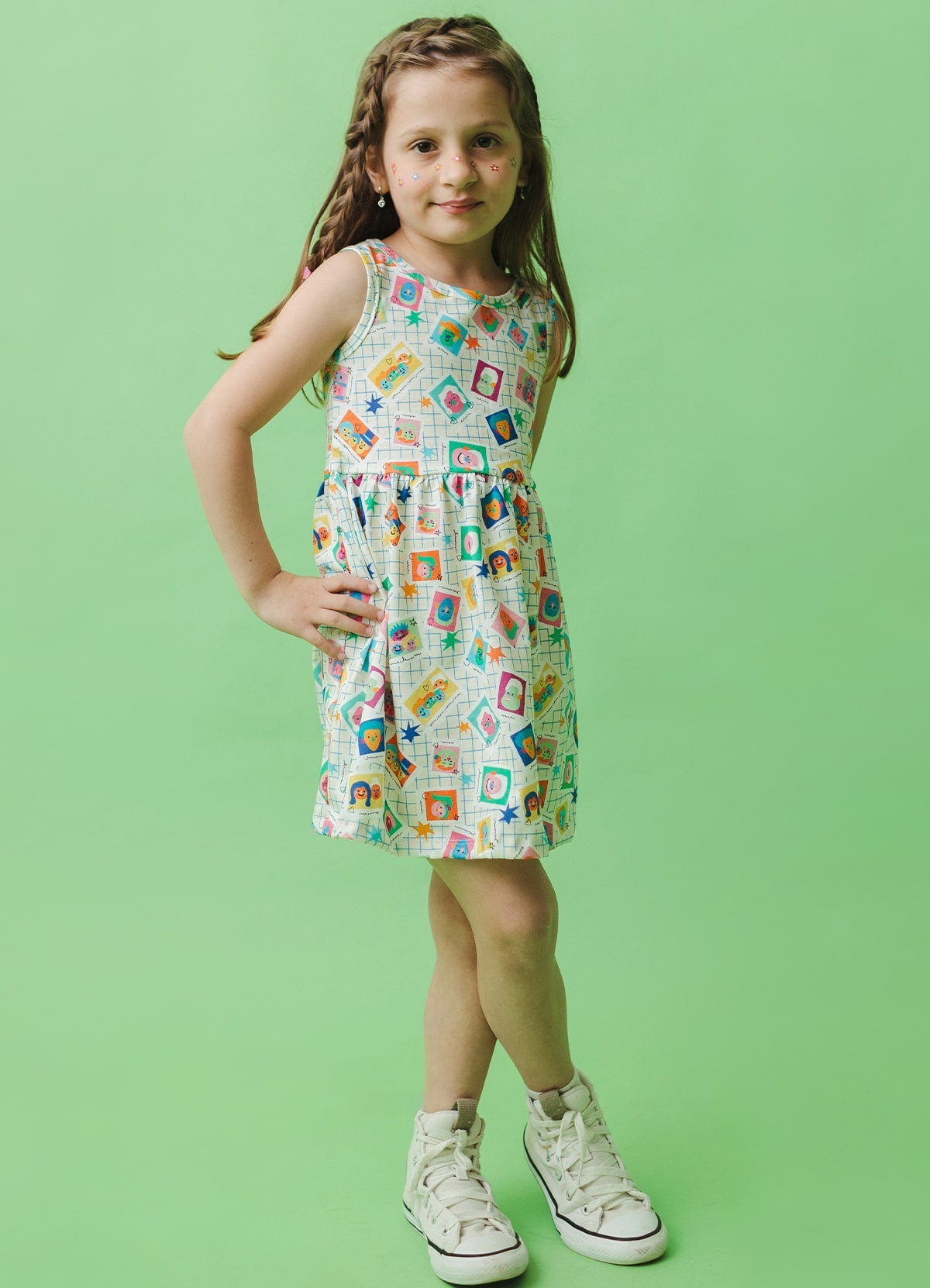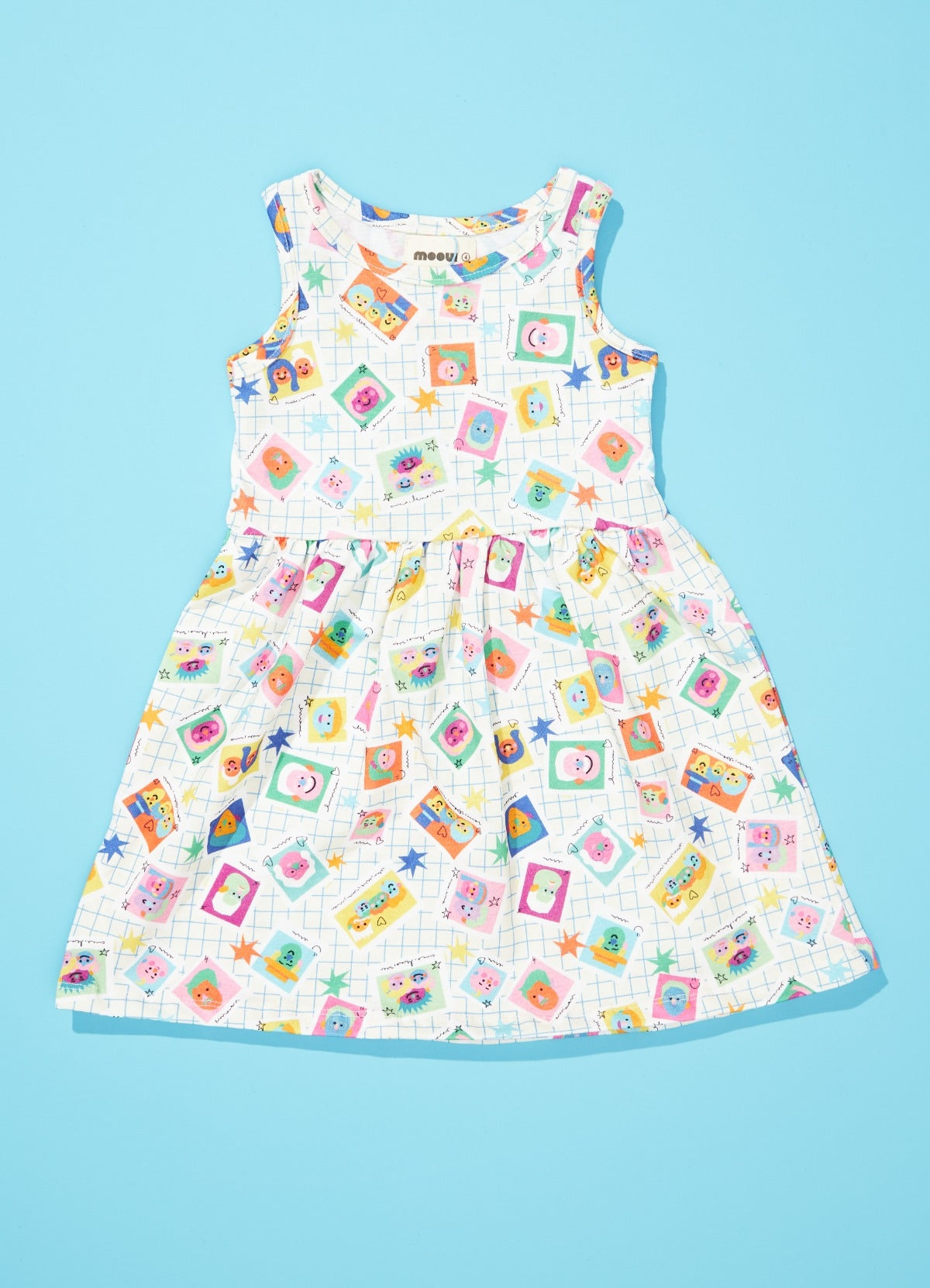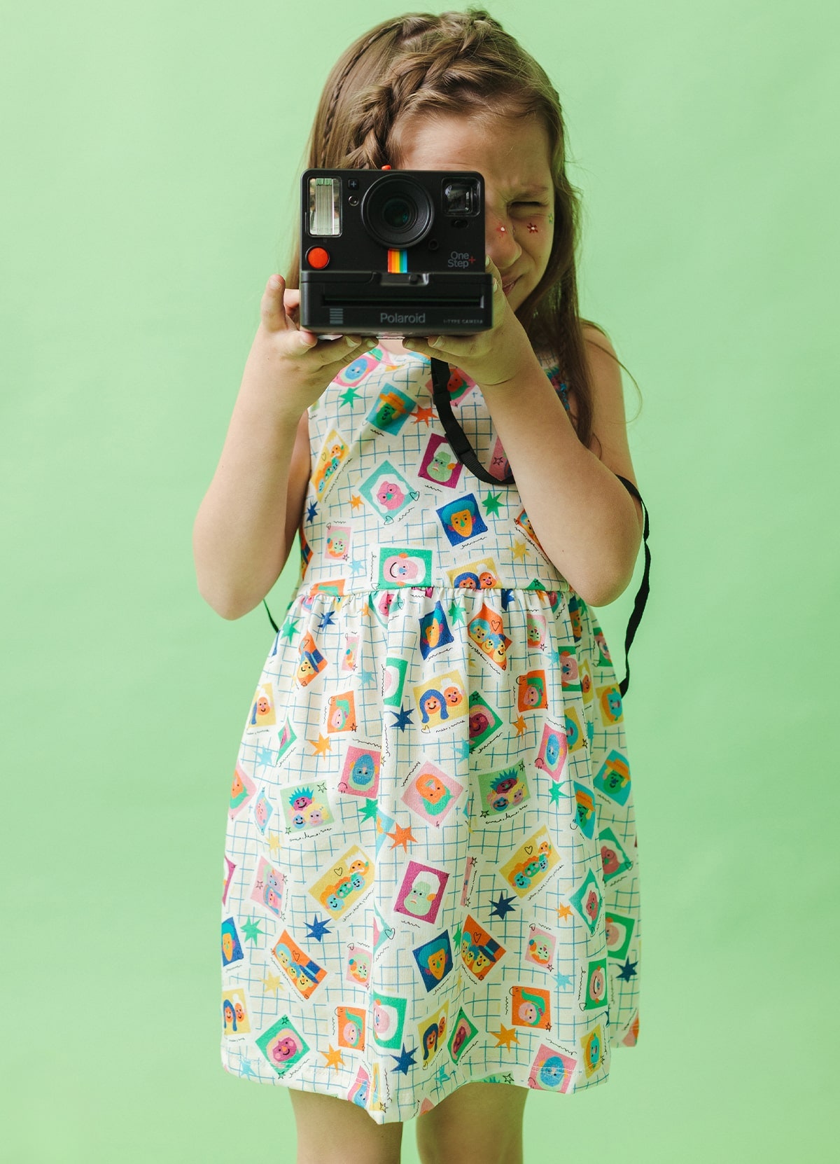 O Vestido Álbum de Família é perfeito para o dia a dia das crianças. Com um design curto e estilo regata, ele oferece liberdade de movimento e frescor, ideal para brincadeiras ao ar livre. Confeccionado em tecido leve e macio, é super confortável e garante um toque suave na pele. A estampa de fotos polaroide traz um ar lúdico e cheio de memórias especiais, tornando o vestido uma peça divertida e encantadora para qualquer ocasião.