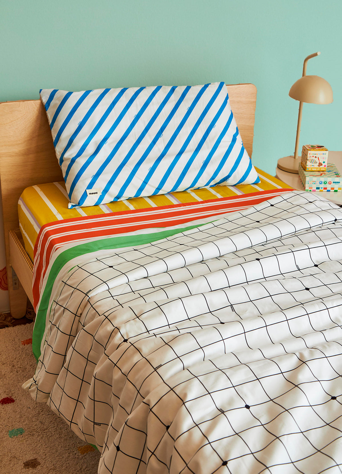 O Kit Cama Completo Solteiro Listrado Campo da MOOUI reúne cinco peças essenciais que transformam o quarto infantil com um mix de estampas coordenadas e cheias de personalidade. Este conjunto completo proporciona praticidade aos pais e uma experiência de sono totalmente renovada para as crianças.