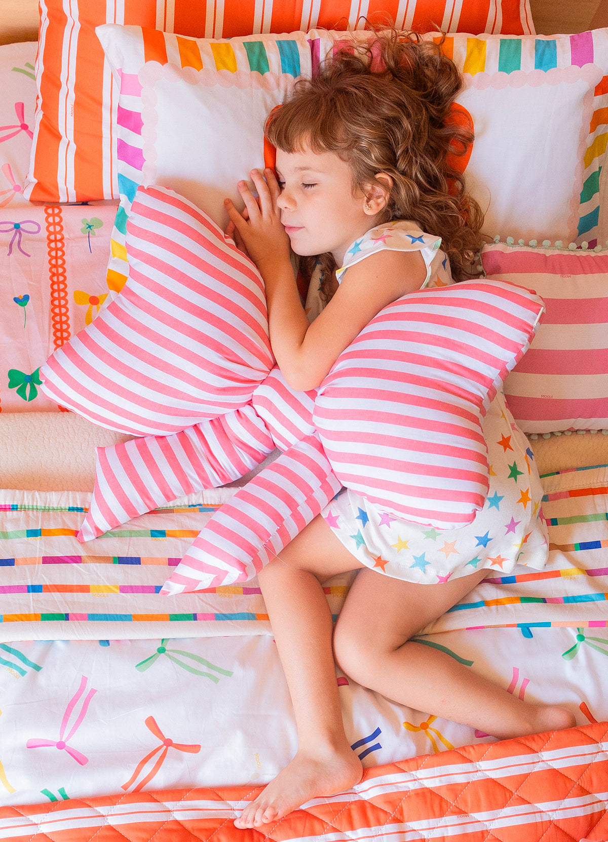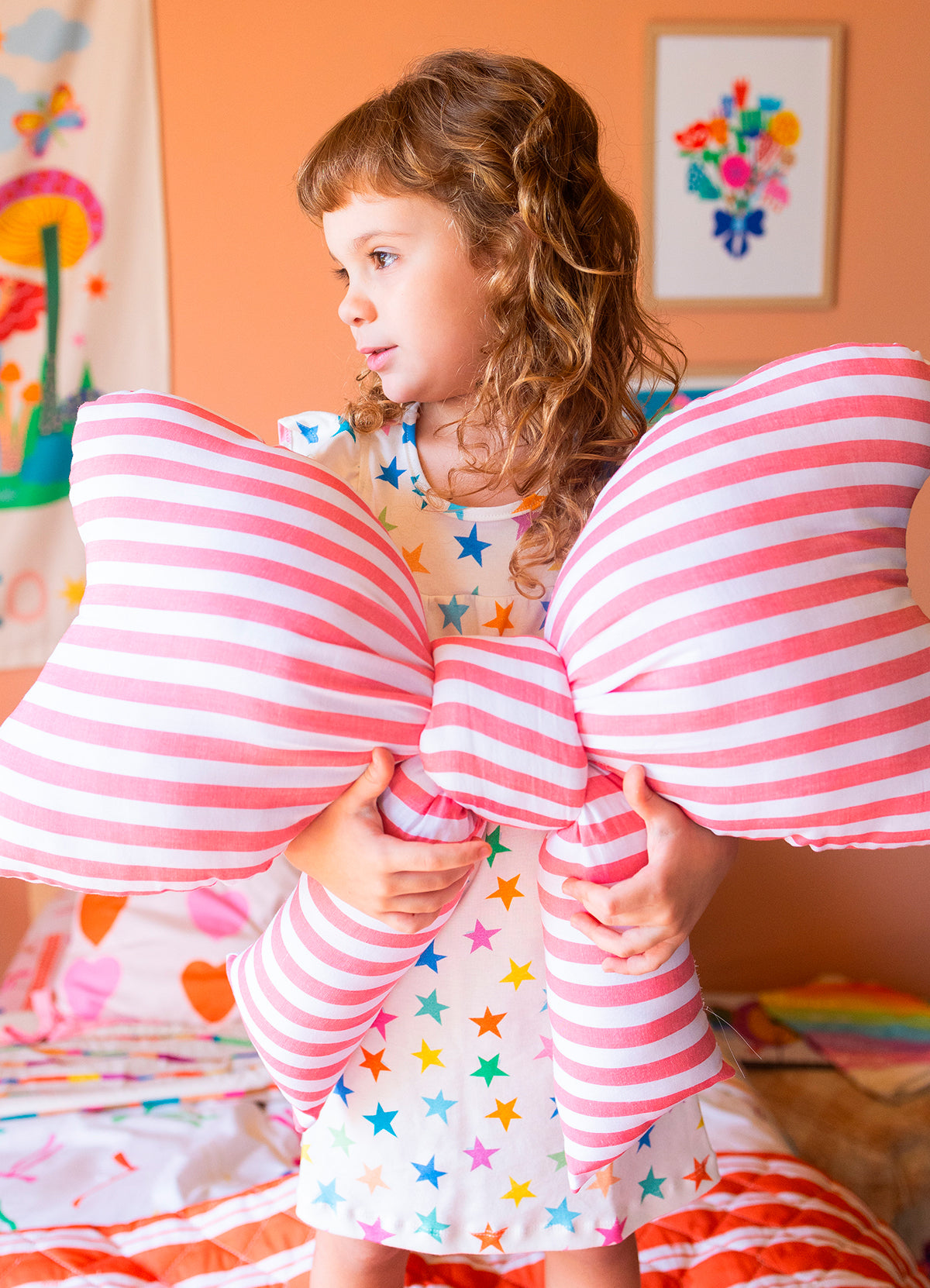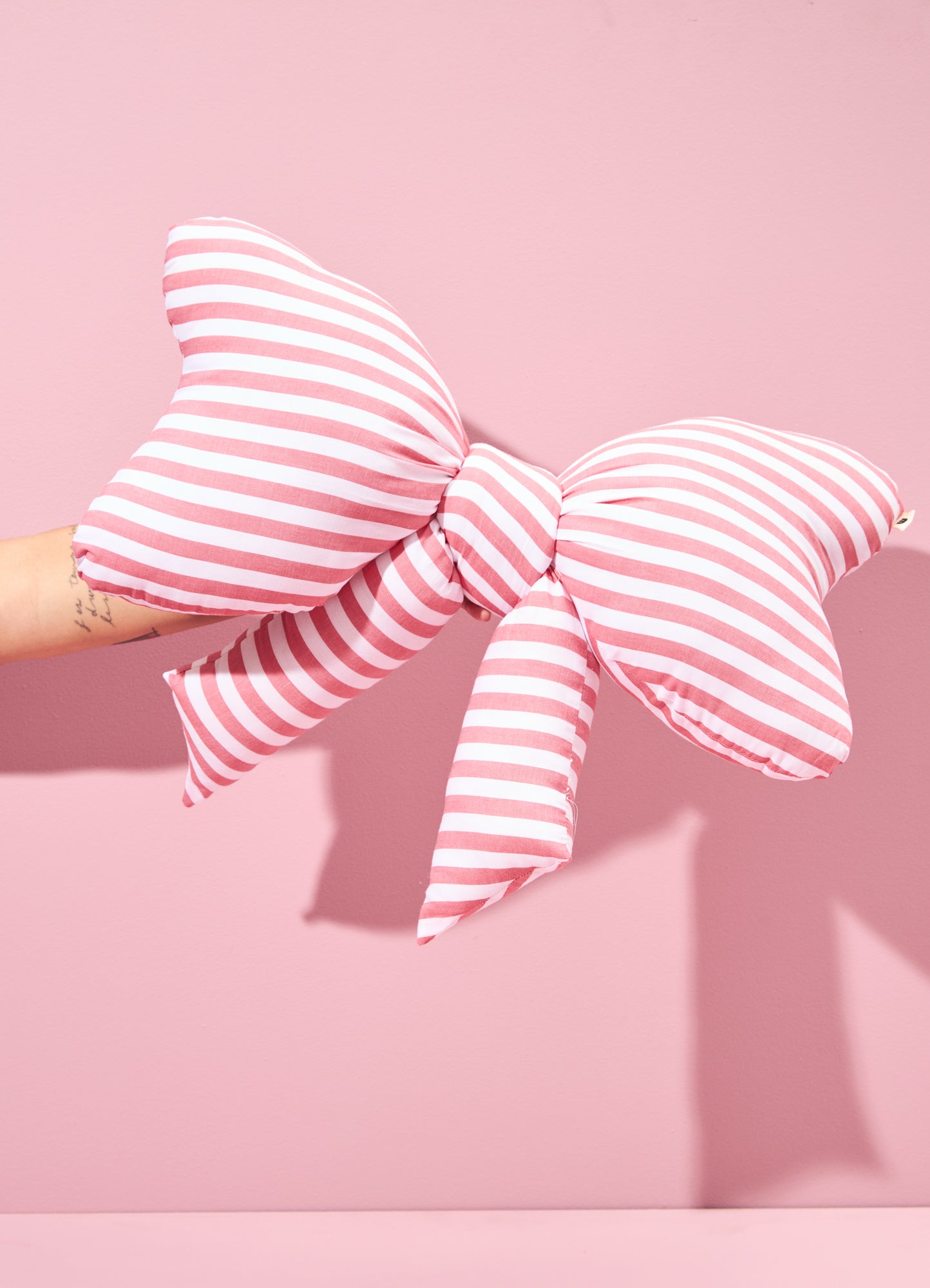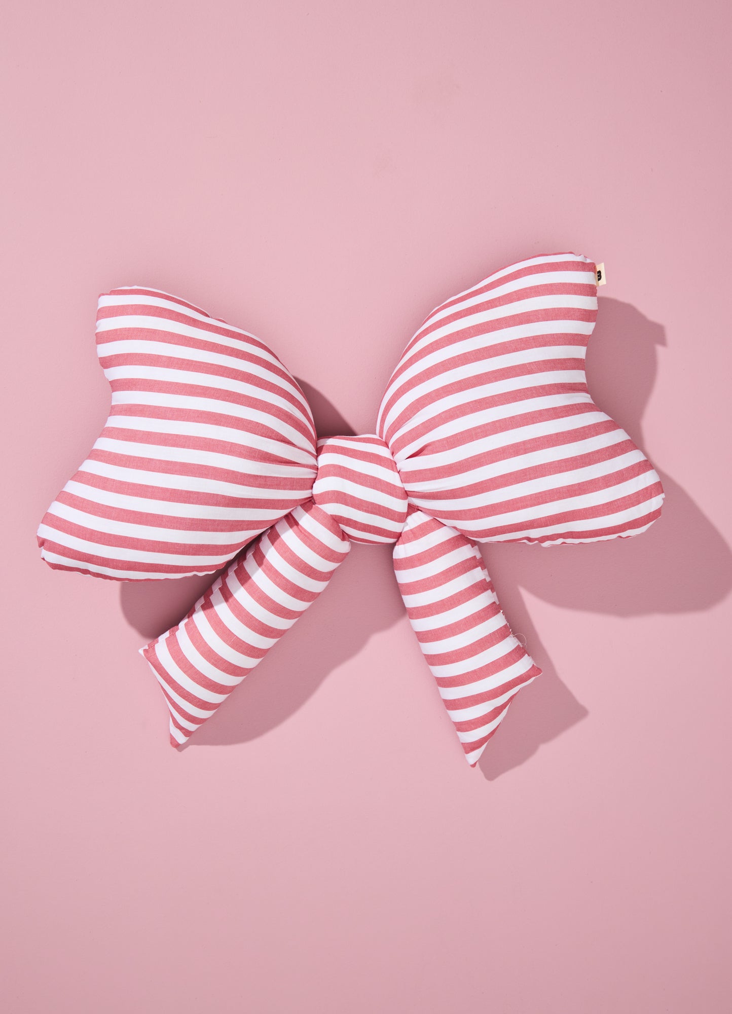 A clássica forma de laço ganha uma nova versão ainda mais fofa com a Almofada Laço Listradinho Vermelho. Confeccionada em tecido 100% algodão com estampa listrada, ela é perfeita para dar um toque divertido e elegante na decoração de camas, poltronas ou sofás.
