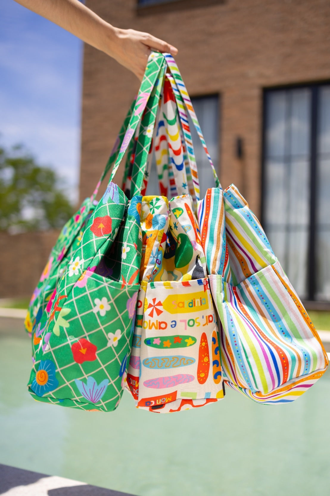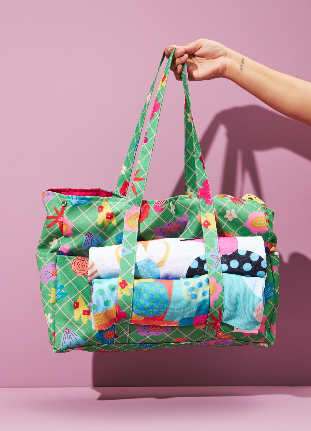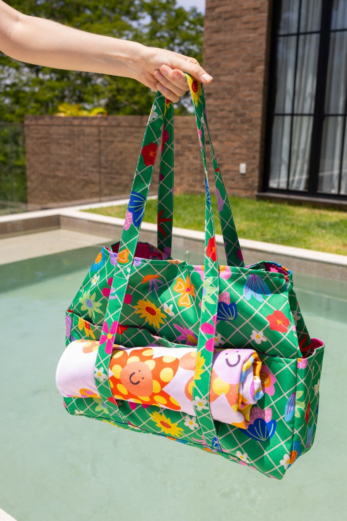 A Bolsa de Praia Grande Jardim da Vovó Verde com estampa exclusiva Mooui, é peça fundamental para você que gosta de ir à praia e à piscina, ou é daquelas pessoas que gostam de bolsa grande e estilosa para carregar tudo que precisa dentro. Feita com tecido impermeável e resistente, ela é leve, espaçosa e cheia de bolsos para guardar e carregar os mais diversos itens. Ela possui um bolso interno com zíper, outros dois bolsos internos abertos e alça para prender o chaveiro ou a necessaire 2 bolsos por fora, ela possui 2 bolsos laterais, frontais e traseiros, além de ter alças para pendurar a toalha, a canga e a esteira.