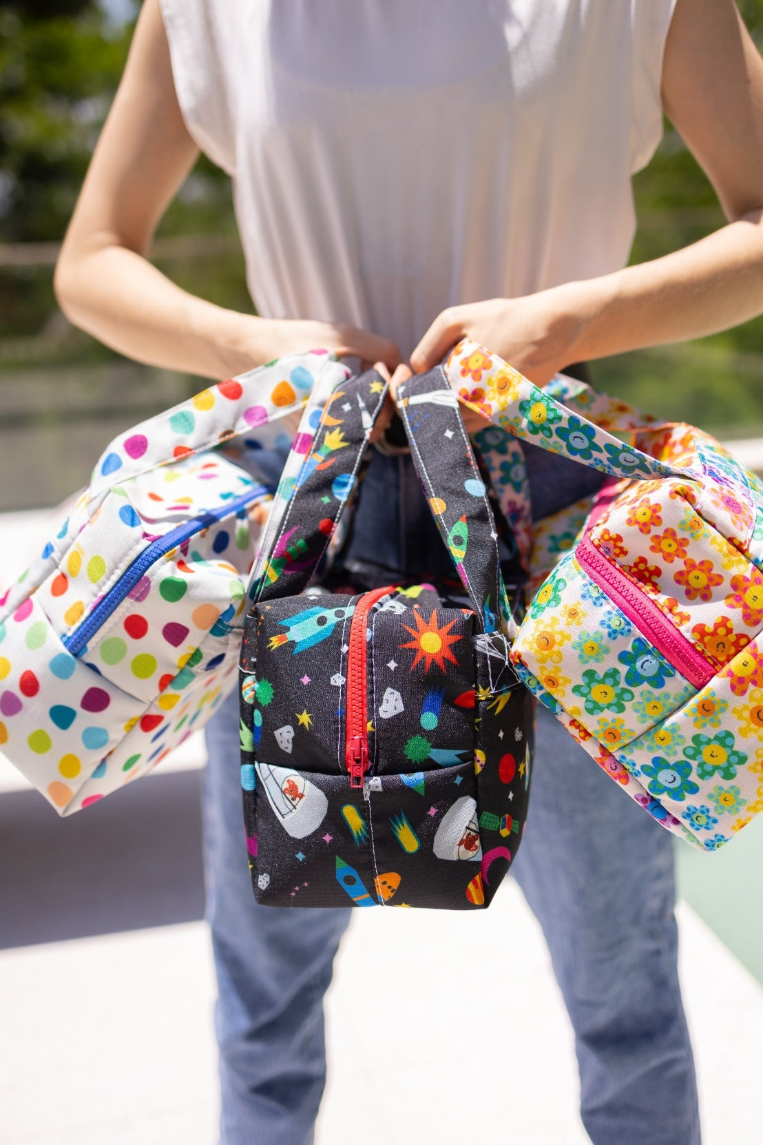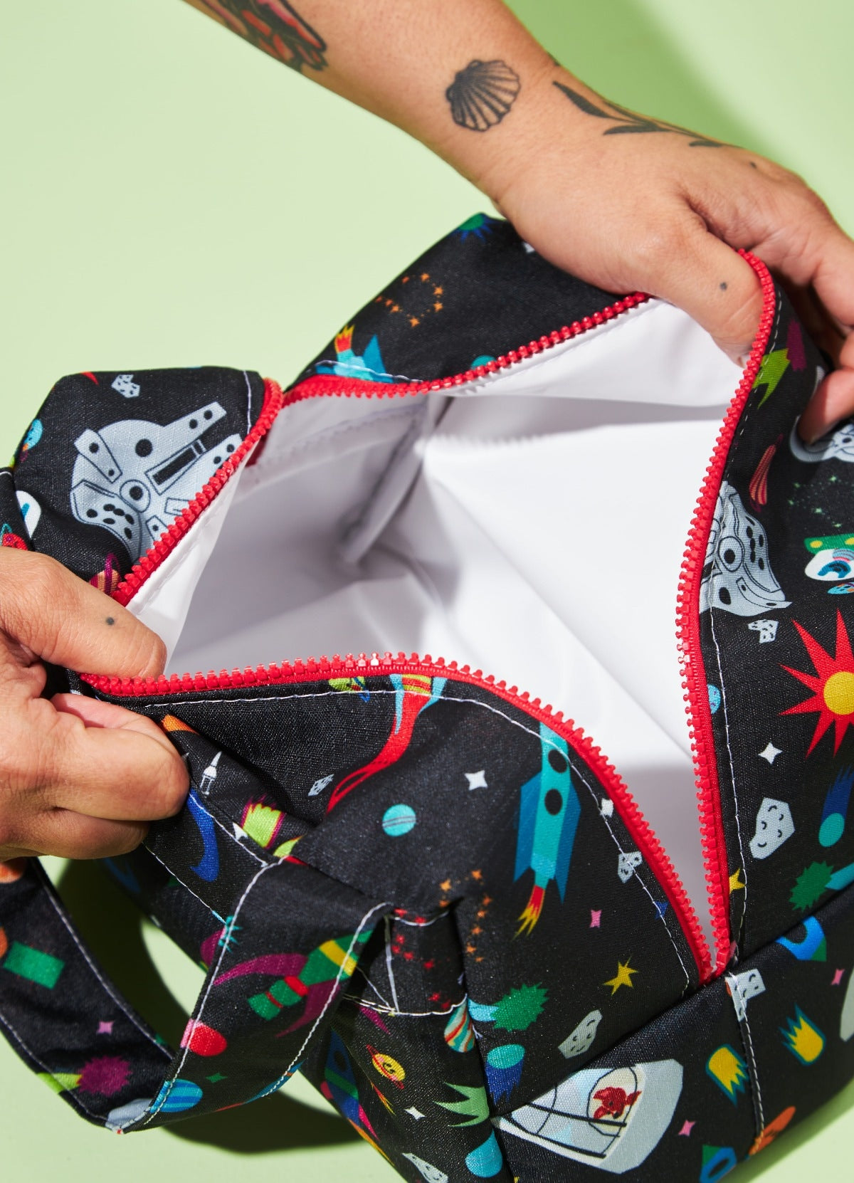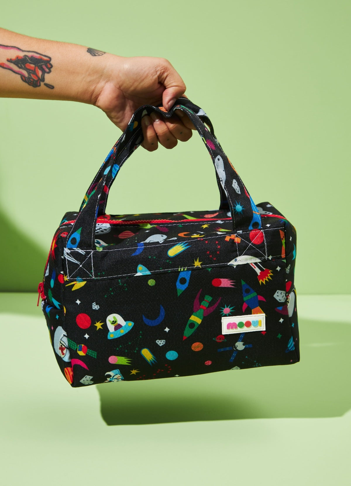 A Bolsa Térmica Cooler Corrida Espacial combina praticidade e estilo. Confeccionada em material têxtil impermeável, é ideal para manter a temperatura dos alimentos e bebidas. Com tamanho médio e um compartimento interno espaçoso revestido com forro térmico, apresenta a exclusiva estampa Mooui que traz um toque de personalidade. Possui alça de mão na parte superior, alça longa ajustável para maior conforto, base reta para estabilidade e fechamento superior por zíper, garantindo segurança no transporte.