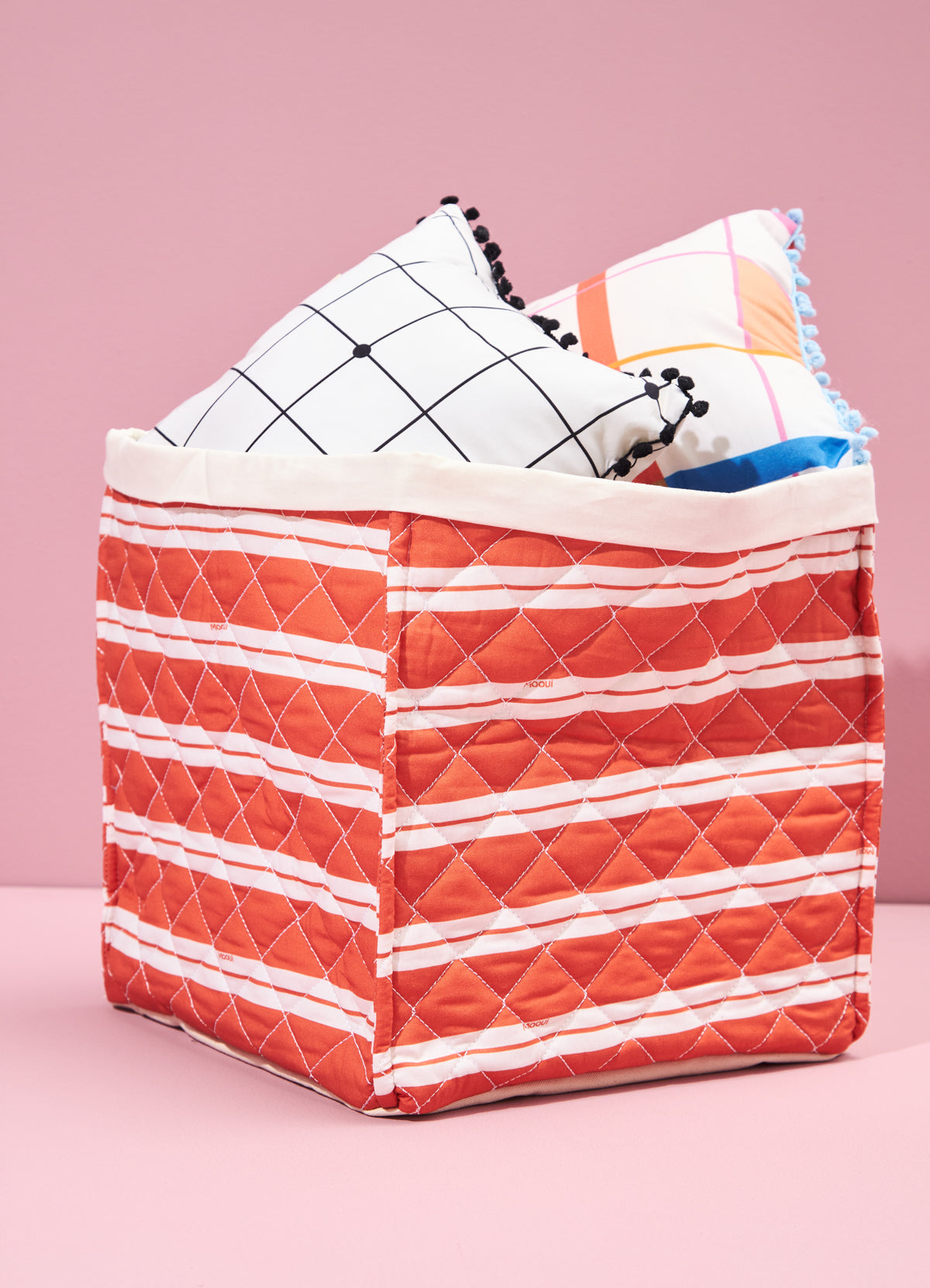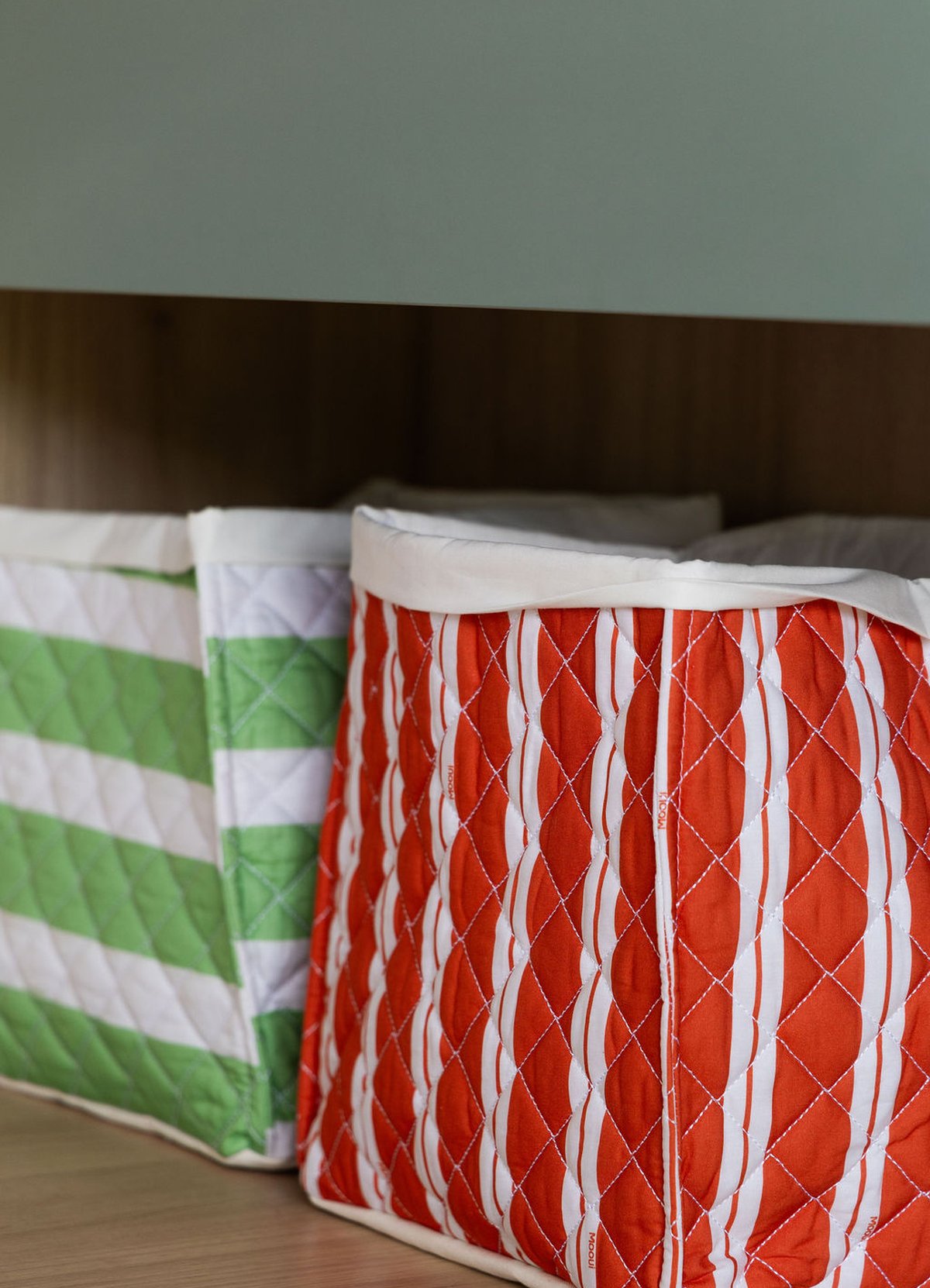A Caixa Organizadora Grande Listrado Carmim da MOOUI é a solução perfeita para organizar com charme o quarto infantil. Com tamanho ideal para organizar pequenos itens, brinquedos ou acessórios, traz alegria e cor ao ambiente com suas estampas exclusivas.