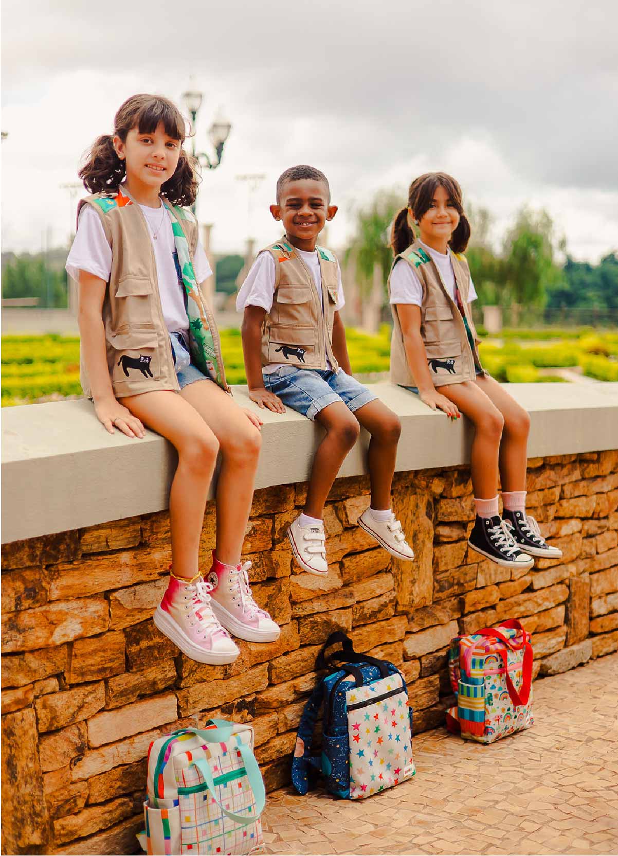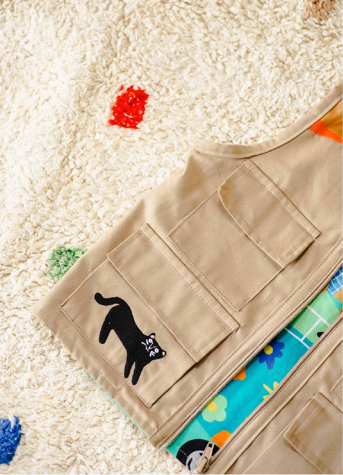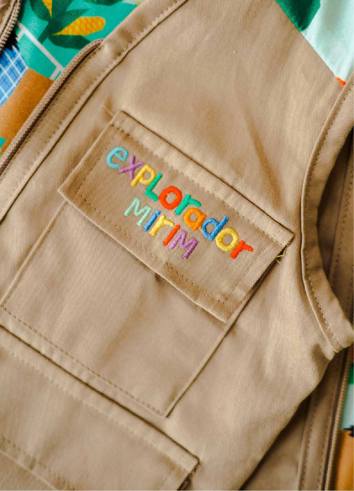 Com quatro bolsos, dois com bordados divertidos, e detalhe estampado no ombro, pode ser custumizado com botons divertidos e é perfeito para uma criança que ama aventuras.